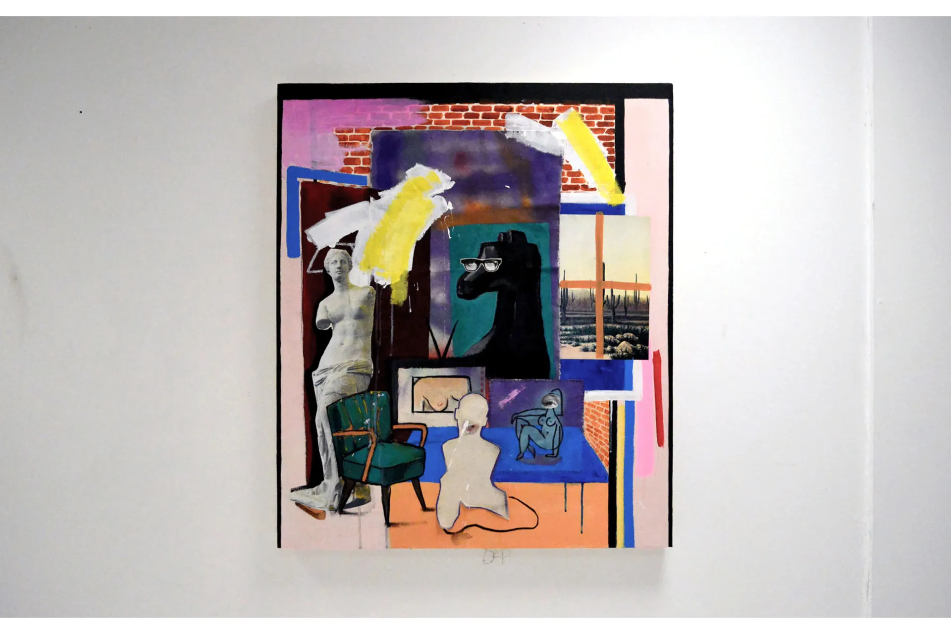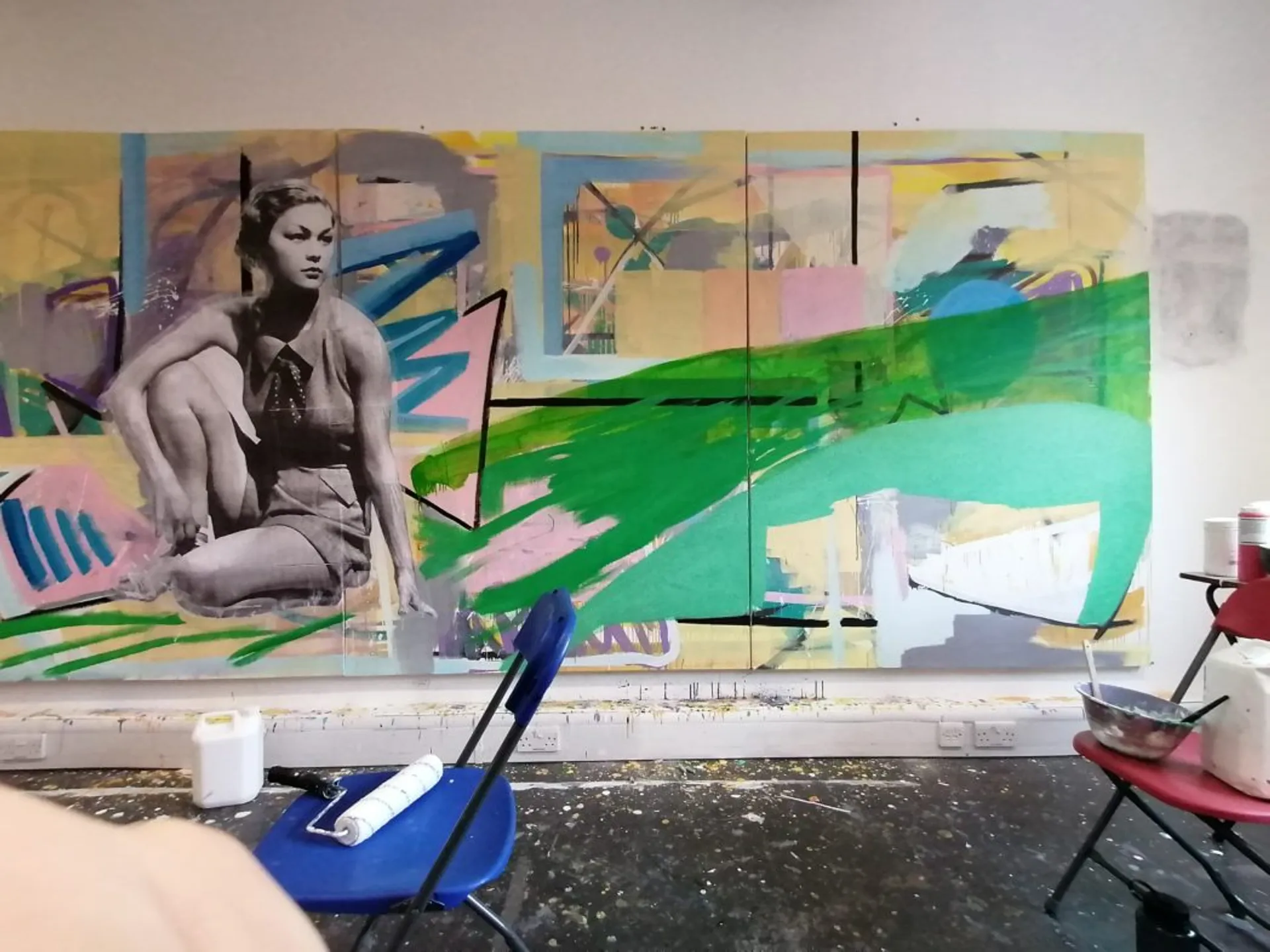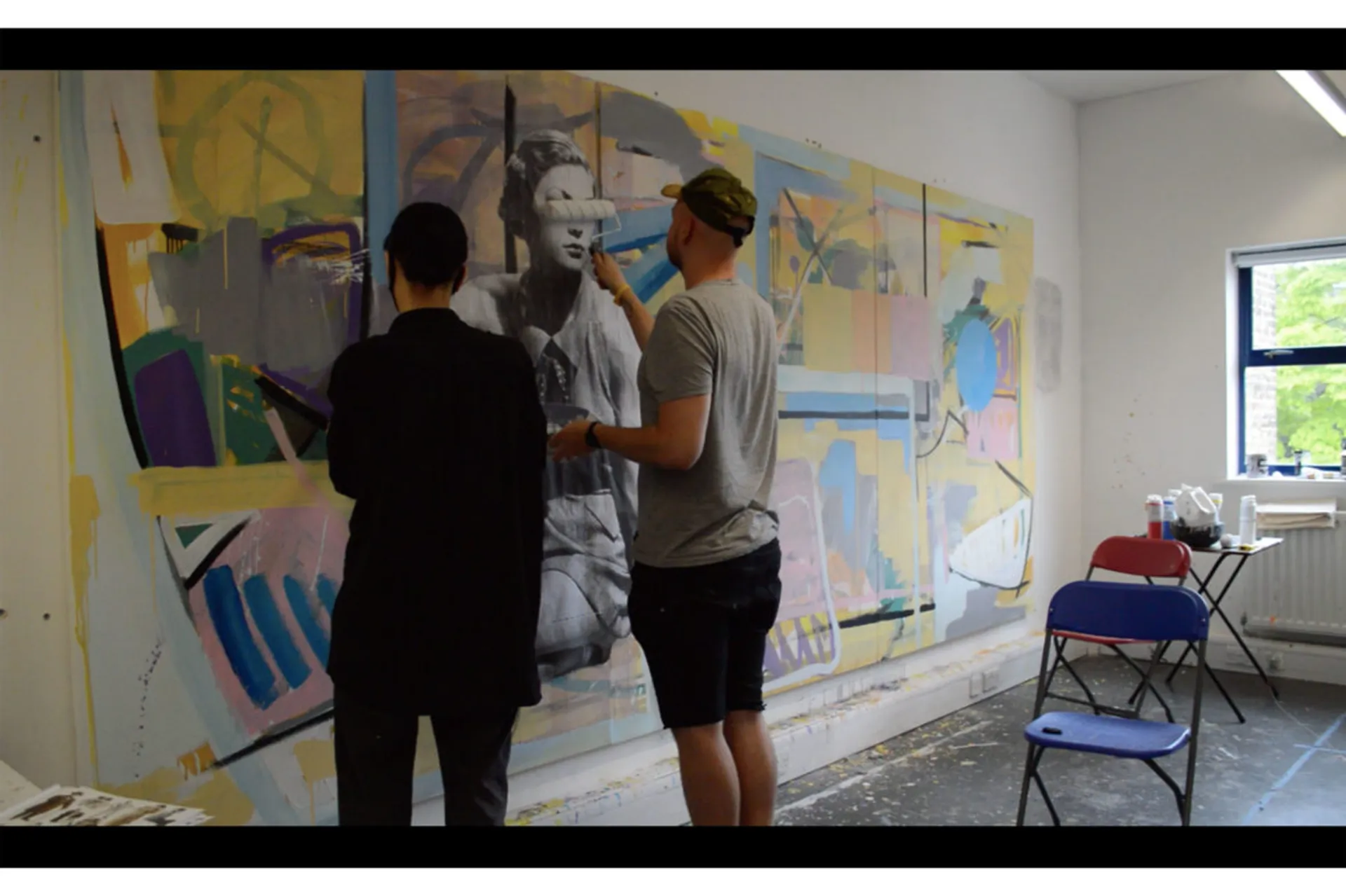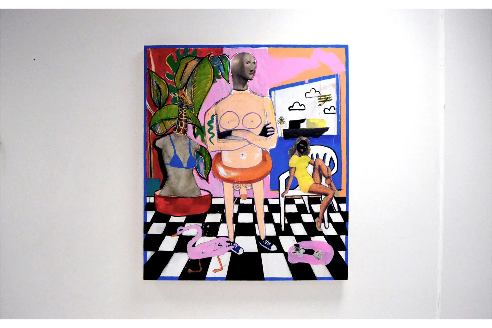 For the past 2 years, we as a duo have been working collaboratively on work that spans across; video, installation, performance, painting and other disciplines. Our collaboration started in wanting to challenge ourselves as individual artists and experiment with how our separate practices, styles, and ideas can work together as a collective and the potential possibilities that can come out of that as individuals. From this our work has taken interest in; personal identity, the position of an artist in the contemporary sphere and the general significance of cross disciplinary work. Our recent work has taken the form of two paintings that contains elements and styles of each our practices. These paintings aim to be a melting pot where our practices meet and are representations of the potential that can come out of collaborative work. As these pieces were being made, they began to manifest into particular spaces: a swimming pool/spa and a private living room. They both became increasingly obscure and queer with sinister undertones and reflect our diverse individual interests in: bodies, still life, sexual liberation/eroticism, private and public space and chess. We are now currently working on a larger triptych piece funded by the Stanley Picker Gallery.