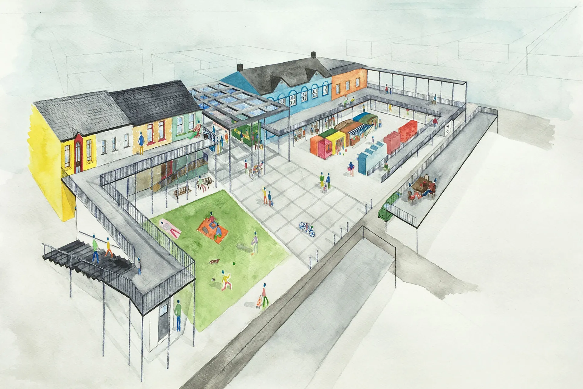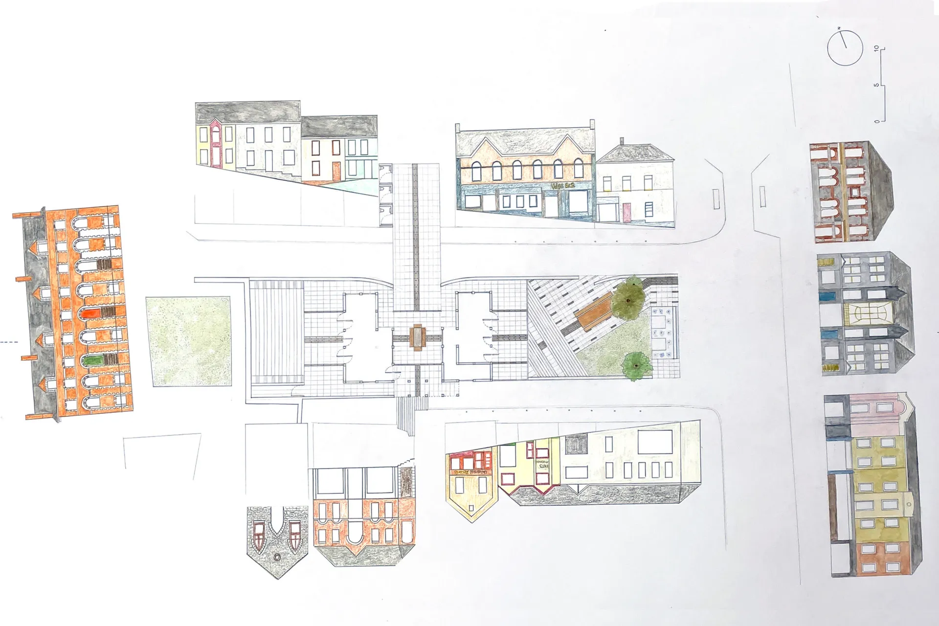 The four short projects lead to a slow and long project in semester 2. From the scale of the window, to the scale of a space, a building and a site, in the redesign of the Market Square in Letterkenny, county Donegal, Ireland, students will engage with the urban scale of a civic public space. The project starts with the ergonometric study of a chair, followed by the close study of the complex topography of a sloping site, prompting students to carry the human scale into the design of market hall and a public space.