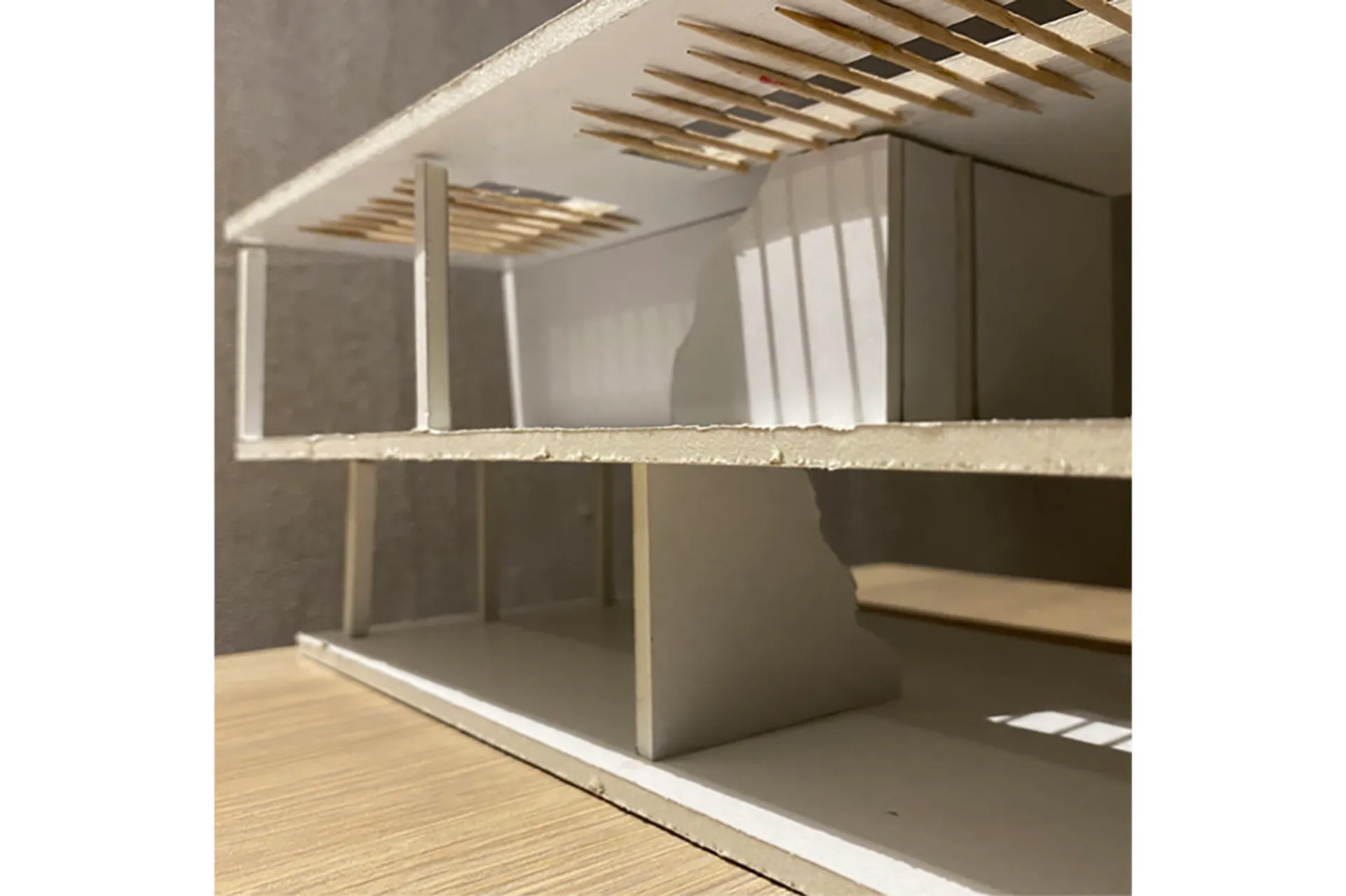 For our project in semester two students were asked to develop a brief to design a shelter for young homeless – ‘a place to call home’. The tight site was challenging – bounded by neighbours on both sides, with the busy A3 to the north and the train track to the south.