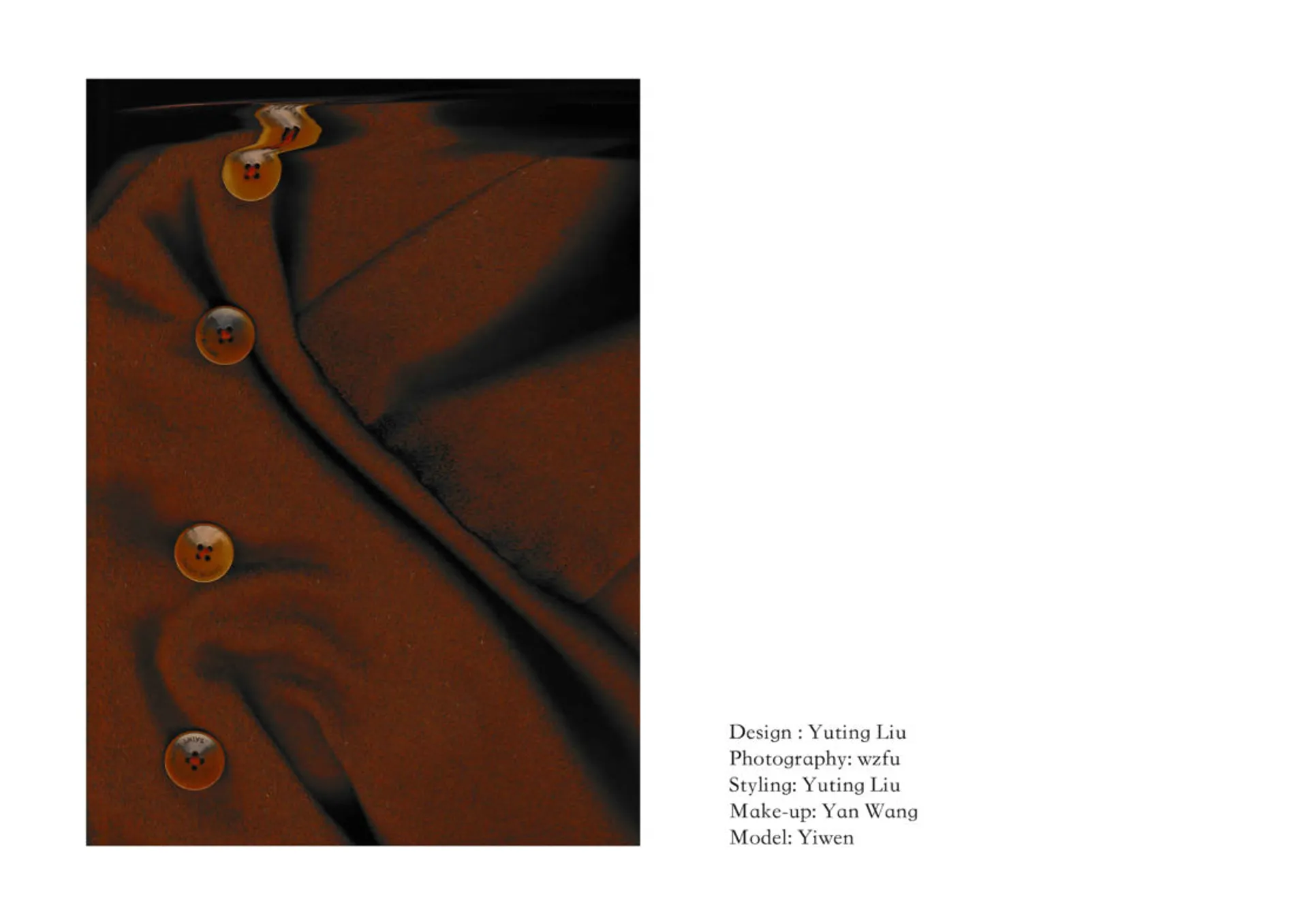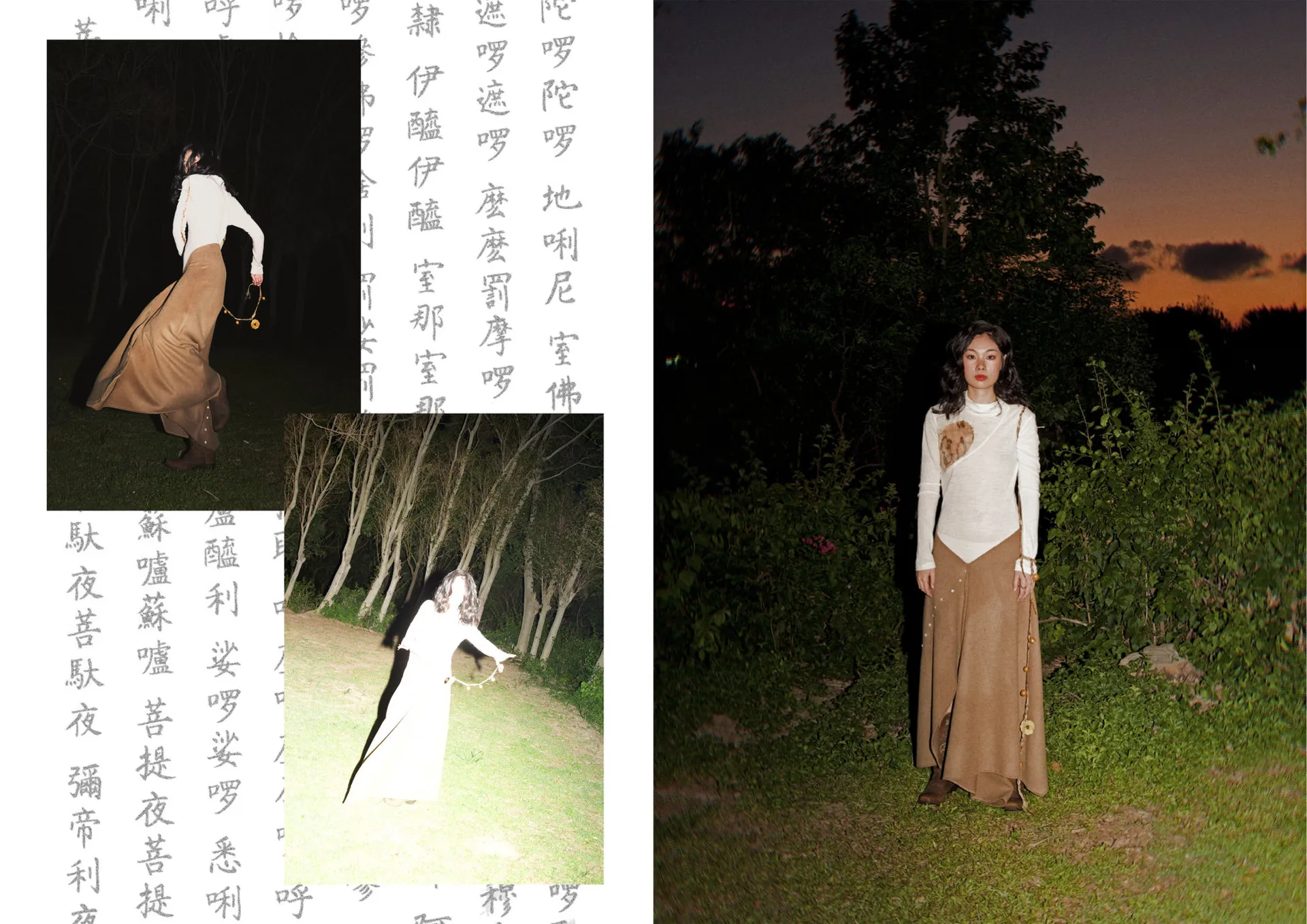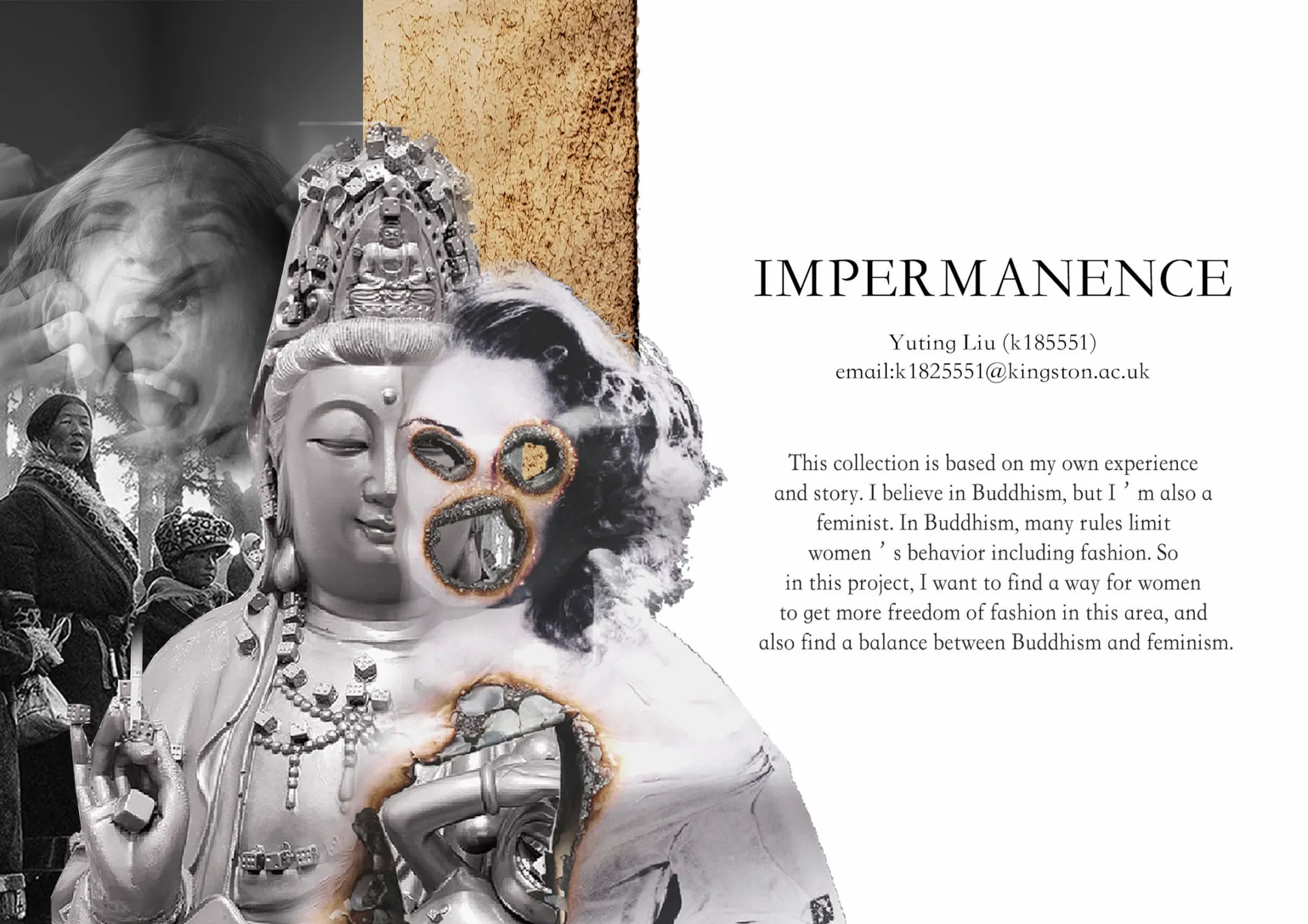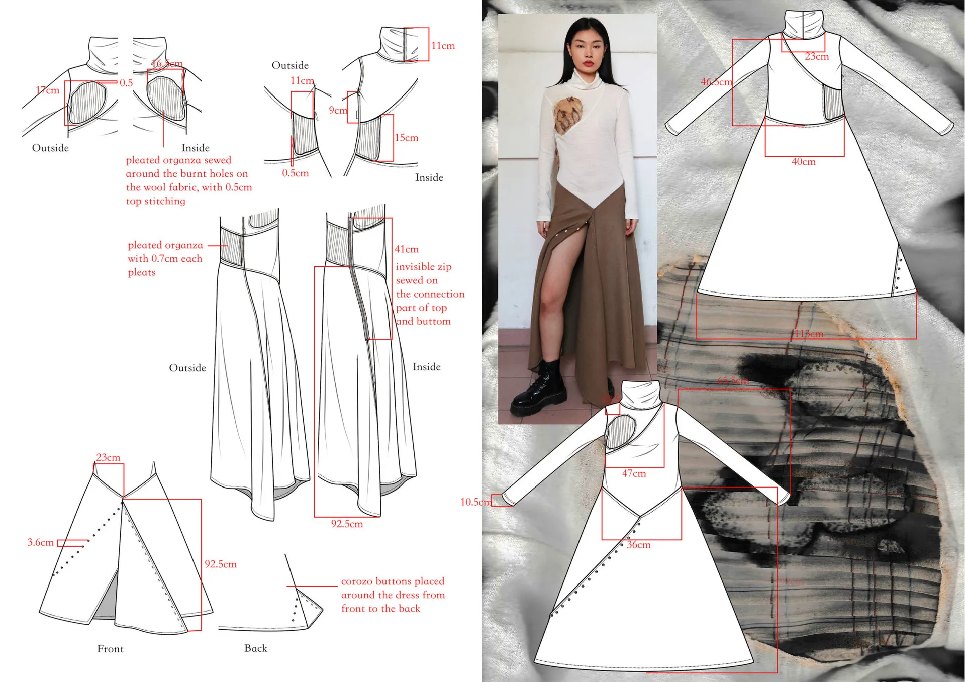 This collection is based on my own experience and story. I believe in Buddhism, but I’m also a feminist. In Buddhism, many rules limit women’s behavior including fashion. So in this project, I want to find a way for women to get more freedom of fashion in this area, and also to find a balance between Buddhism and feminism.