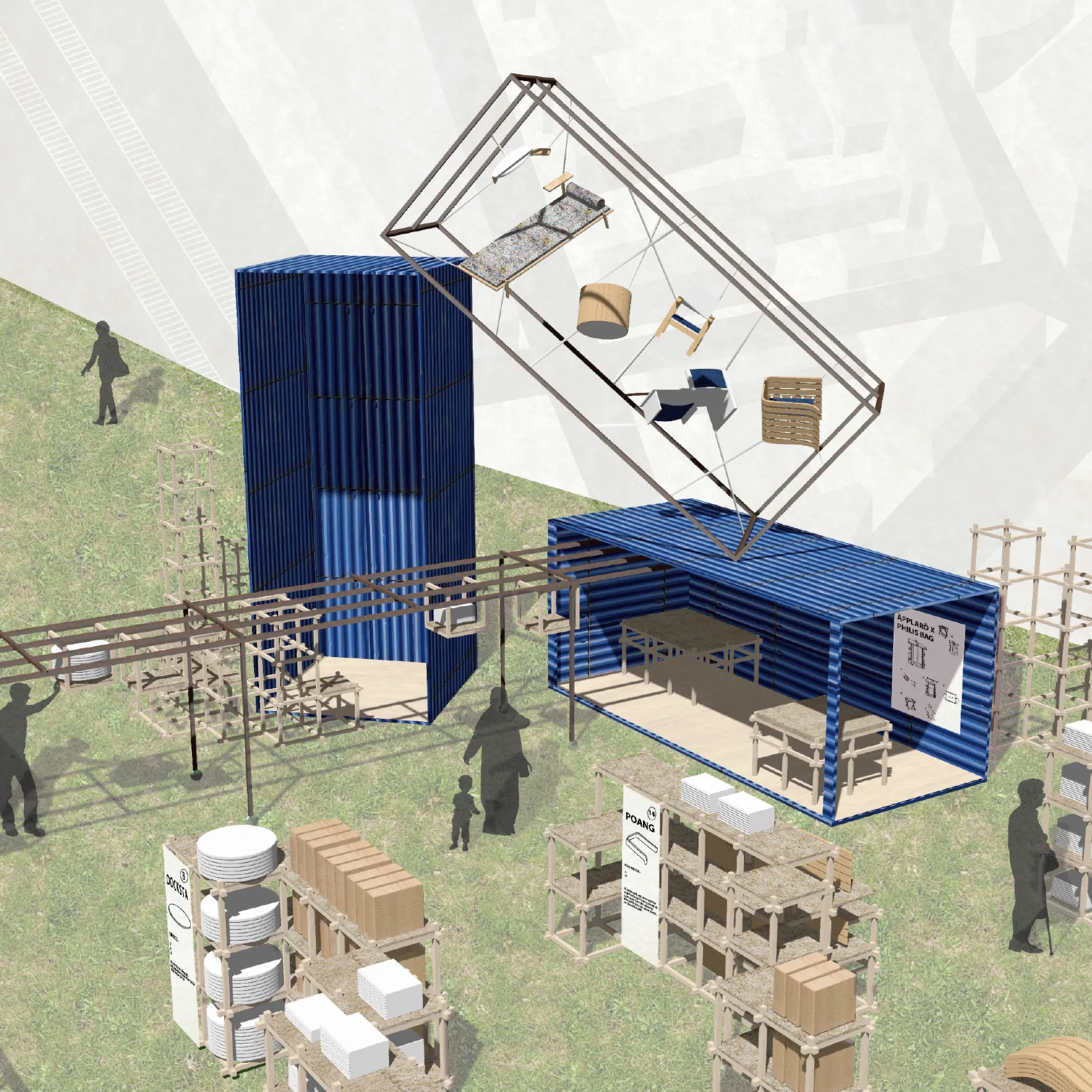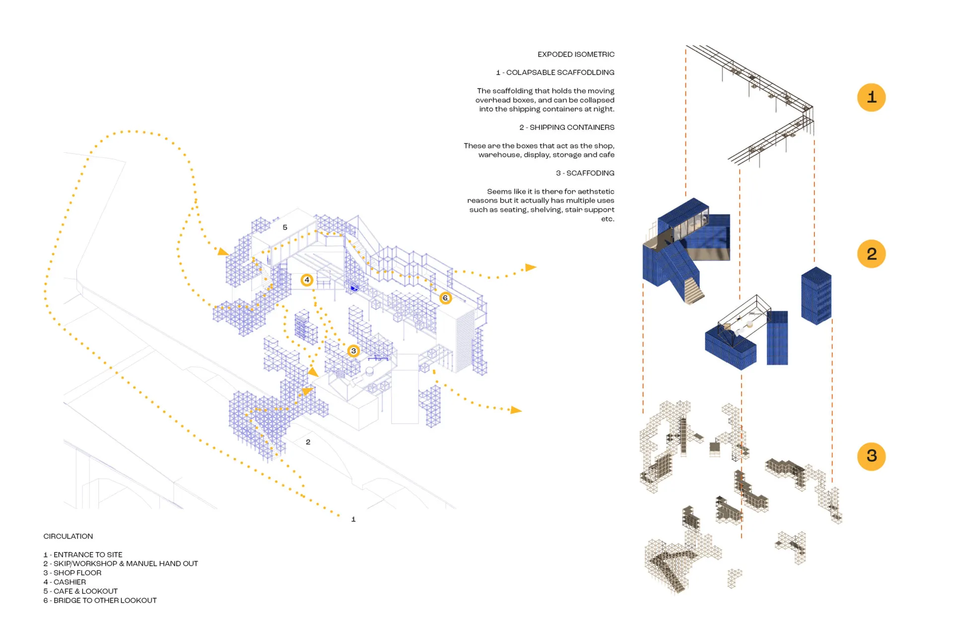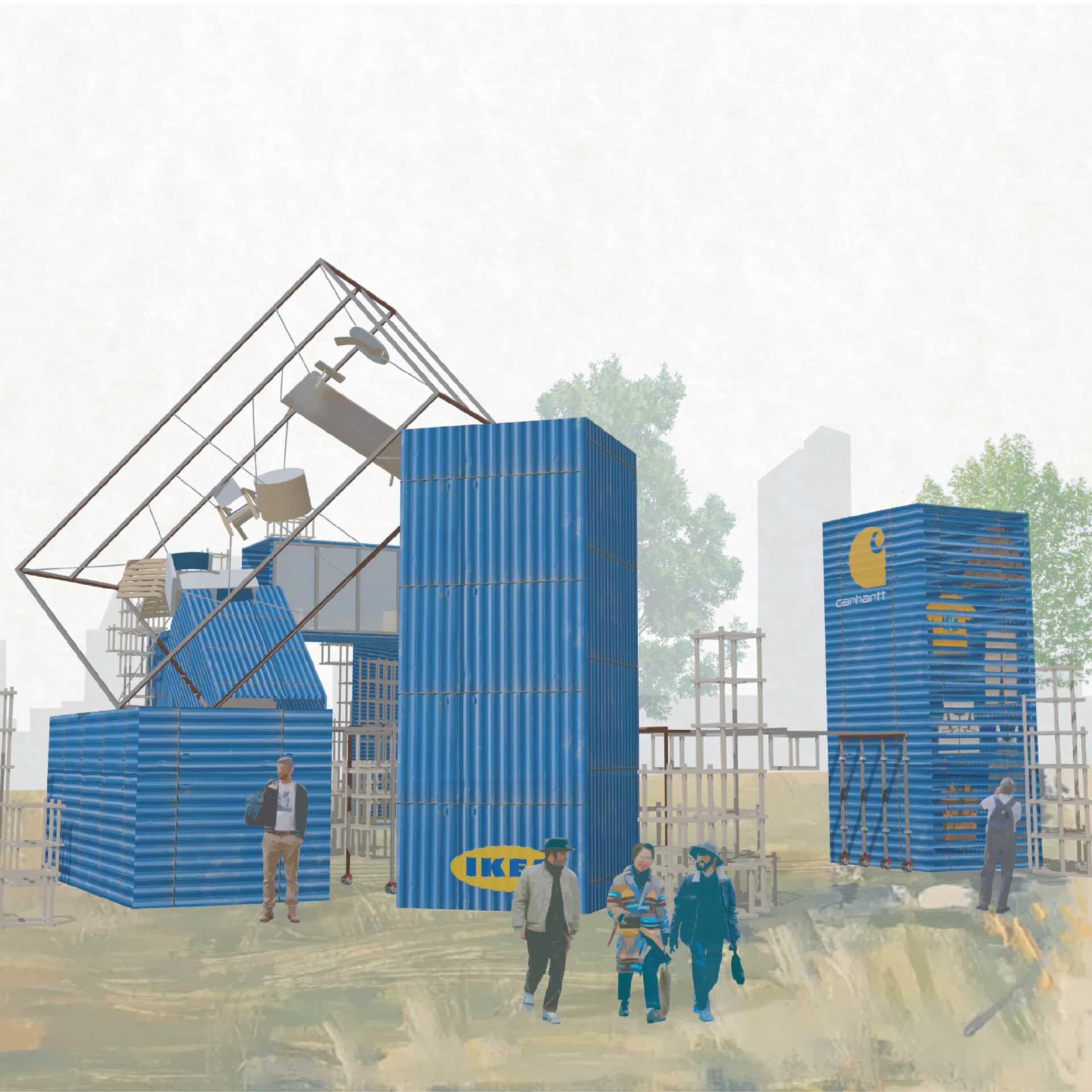 My outcome was a Brand pavilion for a festival located on Shoreditch’s, Bishopsgate’s Goodsyard. The pavilion is multifunctional, which means the architecture also acts as shelving and seating. The pavilion is also made to have a second life once the festival is over. This reflects the concept behind my product, taking old IKEA and Carhartt products, dissembling them, and then connecting them to other pieces to create a new furniture piece. This also gives the products a second life. Because of the functionality and machine-like nature of my pavilion, it now acts as a factory itself. The old product is dropped off, then dismantled in the workshop. This is then taken to another workshop, where the pieces are prepped to be sold. The product is picked up by customers and then purchased as flat-pack furniture, where it can then be taken home and built.