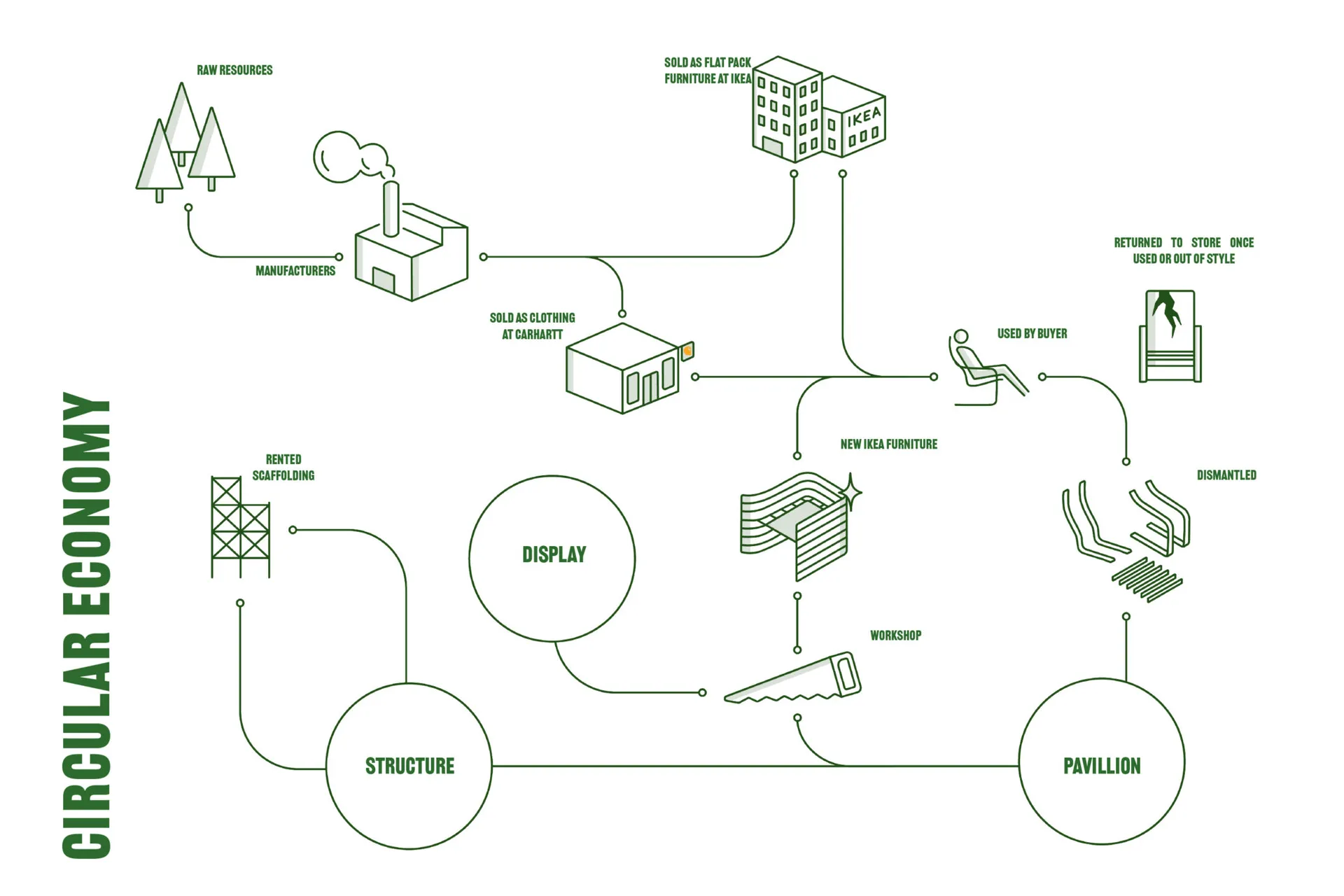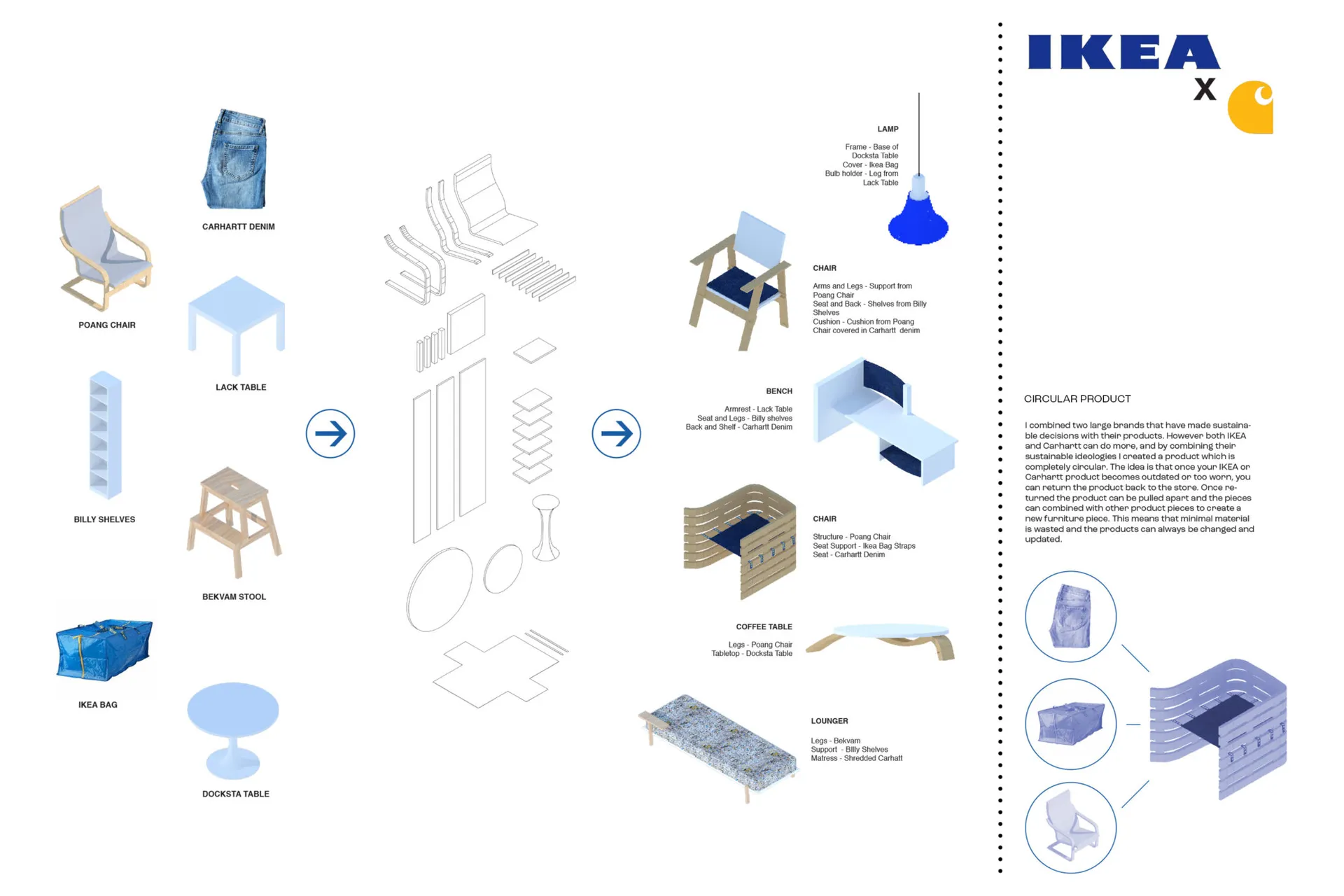 The direction I took this year meant that I analysed, designed, and adapted Brand’s identities. We specifically designed around a Circular economy and tried to find ways to make our interiors or architecture more sustainable and circular. I chose to combine the brands Carhartt and IKEA. Both brands have made steps to become more circular, but they could both be pushed if their ideologies were combined.