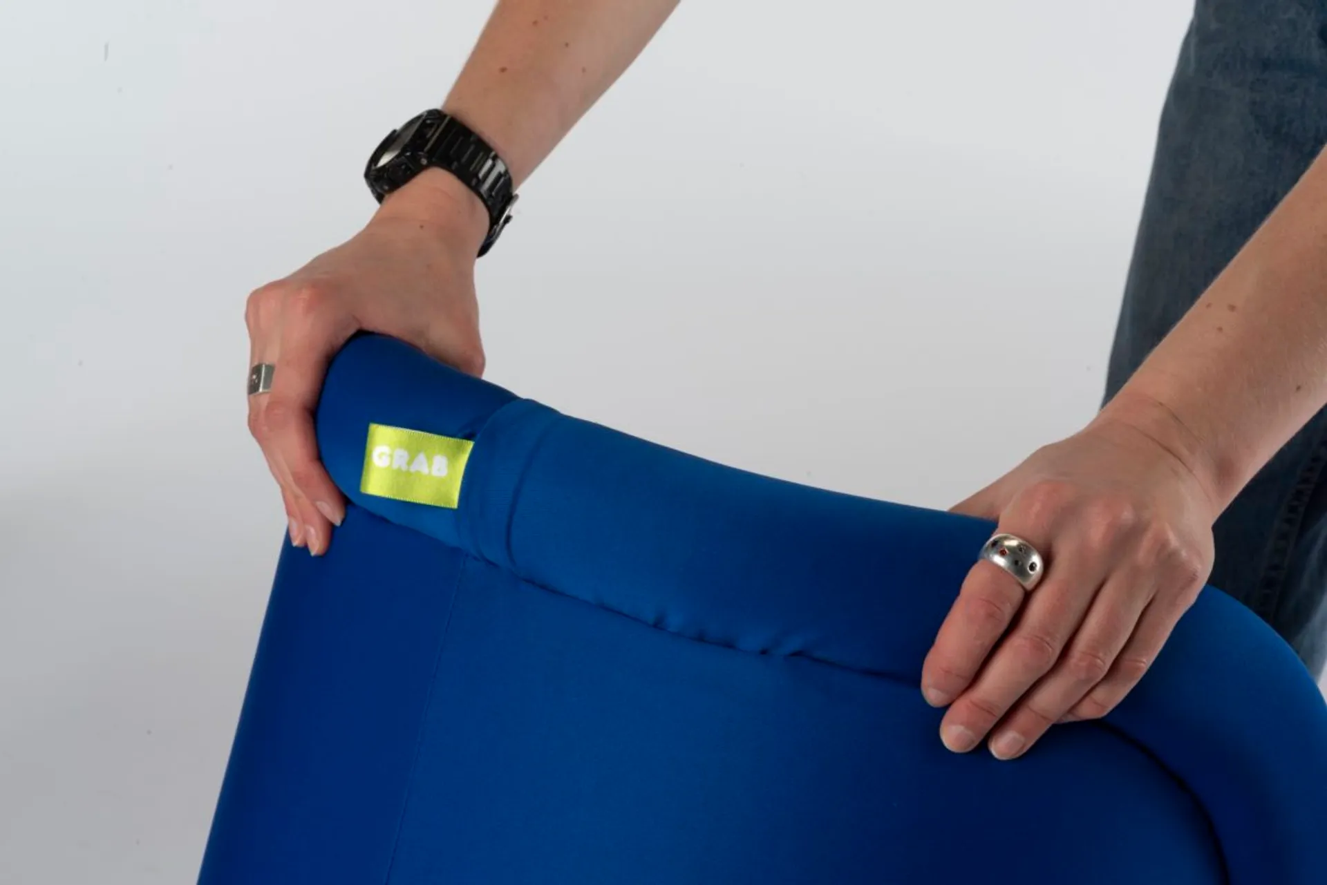 Grab is an upholstered stool with an indication of how it can be picked up and moved around the house. Developed from looking at how people interact with furniture in their homes and if there are details that are overt or covert. Focusing on taking away volume in the upholstery while not taking away from its comfort. Resulting in an upholstered stool with a pipe detail for your hand to follow. This gives permission for the user to pick up the stool and move it around.