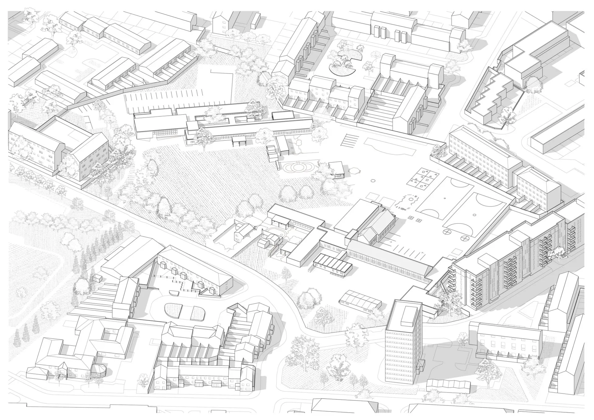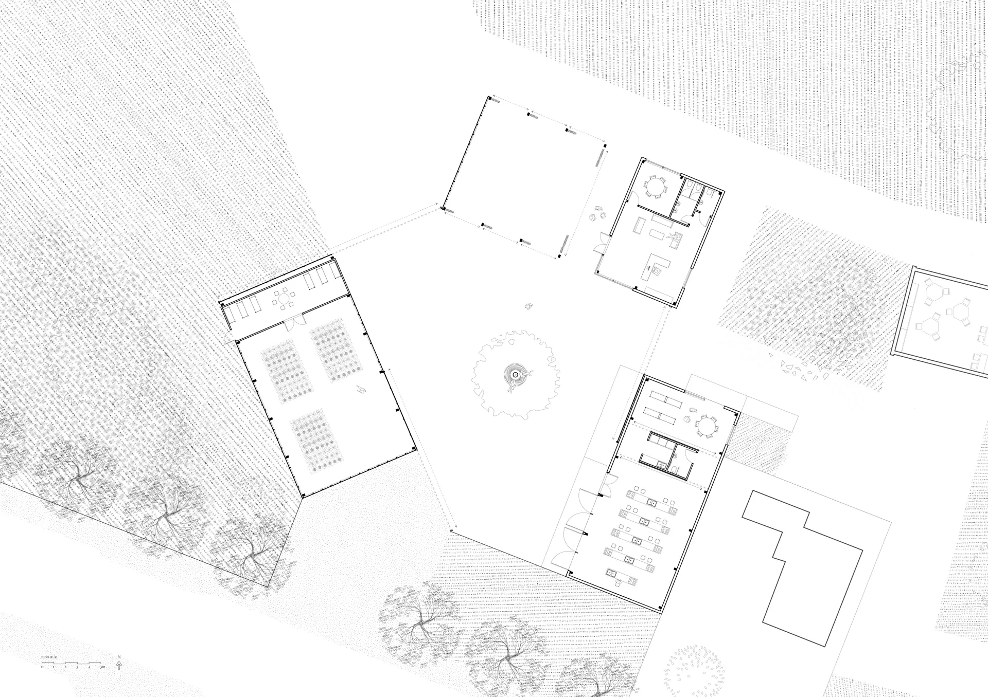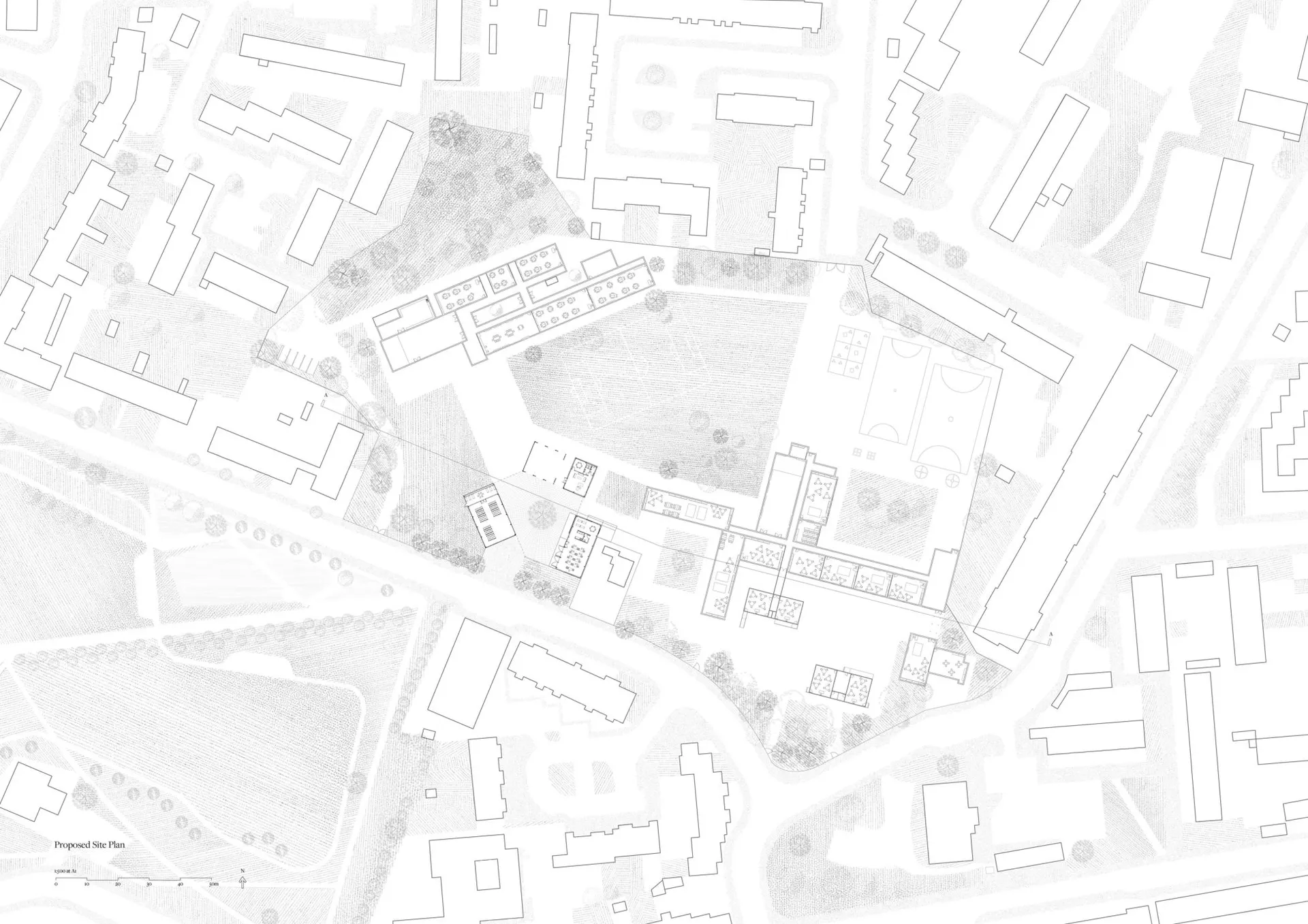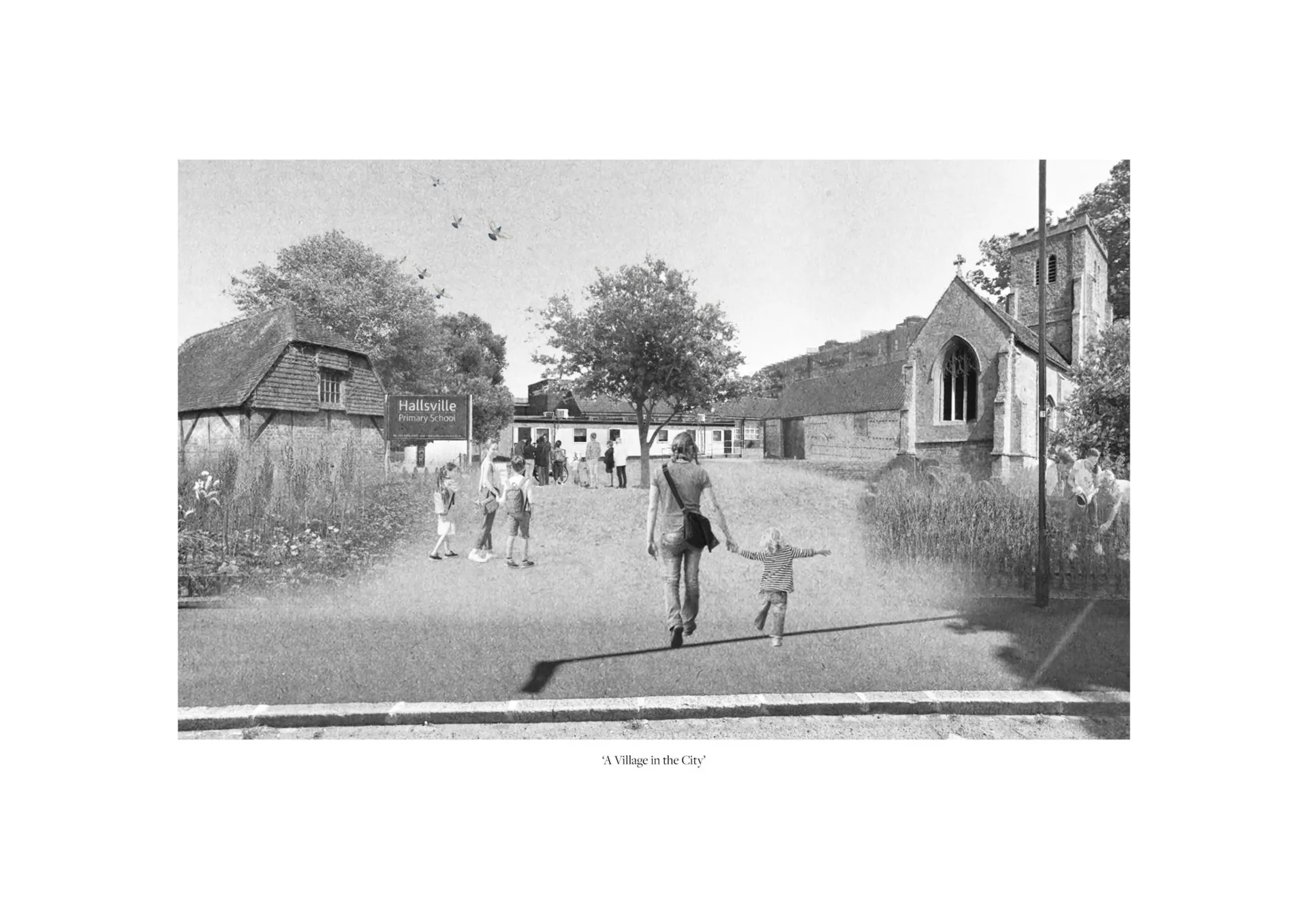 My Thesis project, based around an existing primary school in East London (Hallsville Primary School), is designed alongside the idea of the school as a village. Simple yet effective individual timber structures surround a courtyard, defining a new entrance to the school. Constructed from readily-available timber, polycarbonate, blockwork and metal sheeting, the buildings allow for self-construction which involve members of the community, strengthening the local community bonds. The proposed foyer building, inspired by the congregative nature of a traditional village church, provides a formal reception and sits alongside a flexible open space which can be enclosed by waterproof curtains. Meanwhile, a new kitchen classroom provides the school children with hands-on activity which reflects a traditional reliance on the land for food (which is grown within the proposed neighbouring greenhouse, overlooked by the kitchen). Green space is maximised across the site, providing natural areas for wildlife to thrive and children to learn from and enjoy. Hallsville Primary School would then have a rural character, presenting a rare experience of the village-type within the dense city of London.