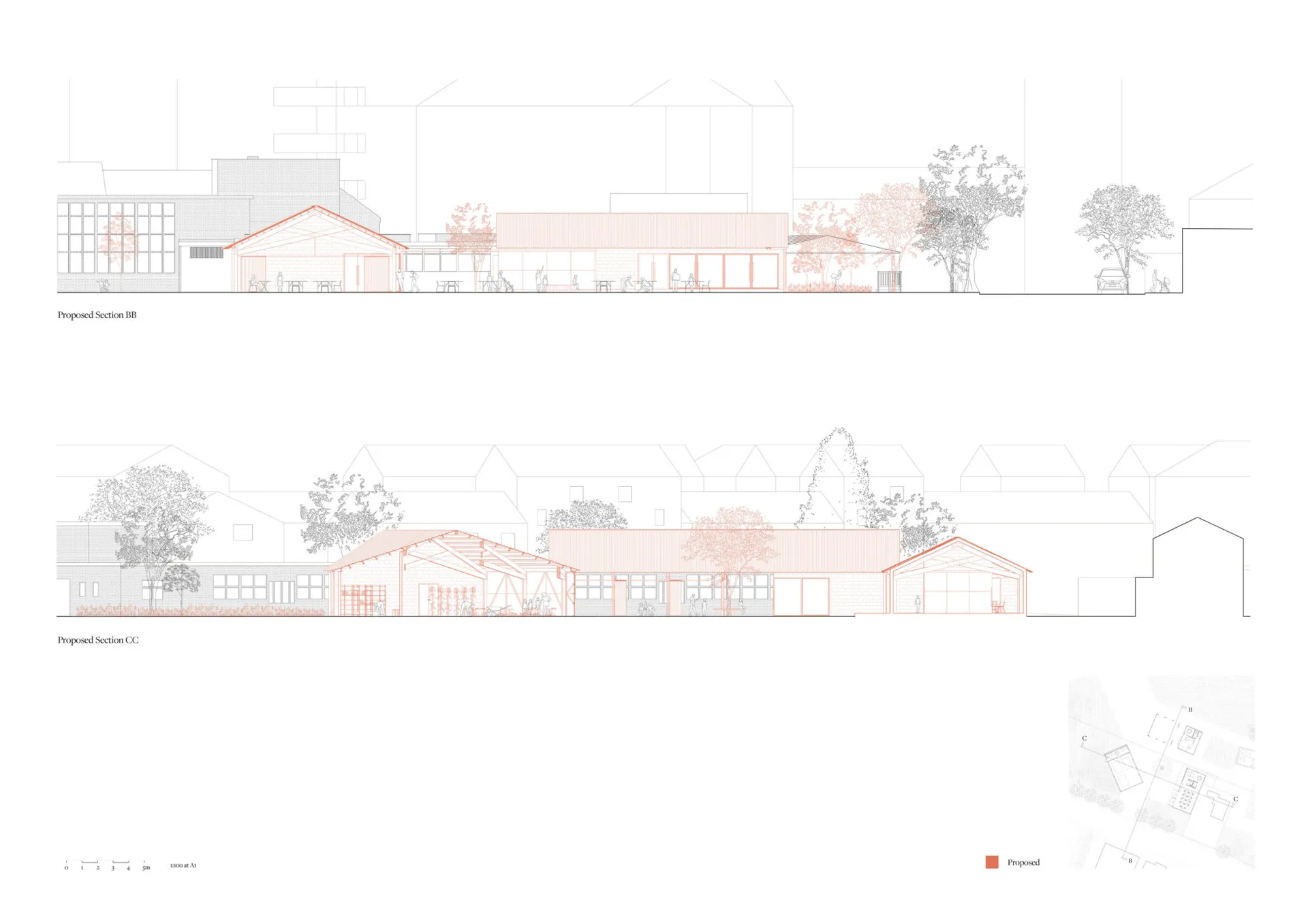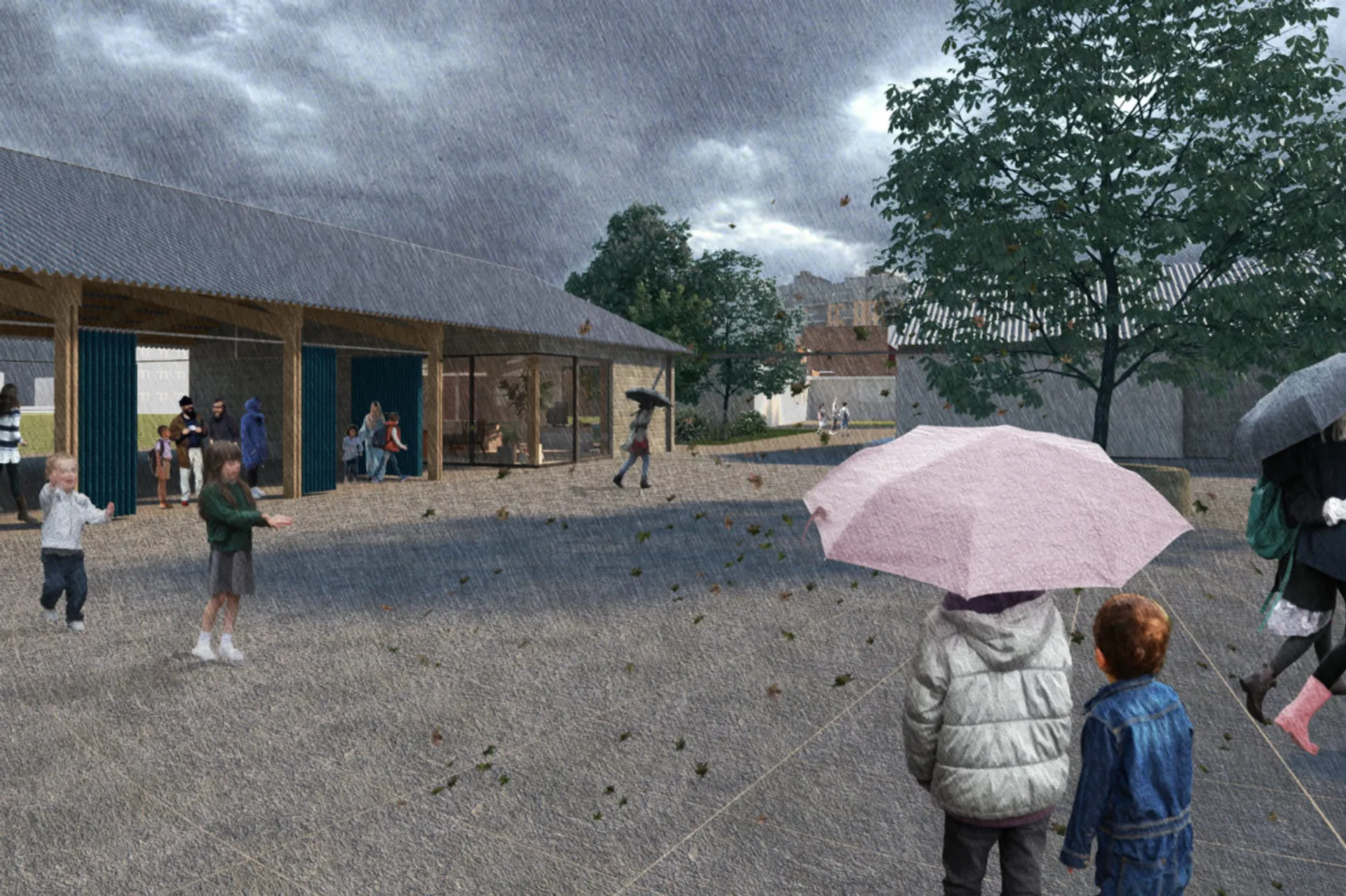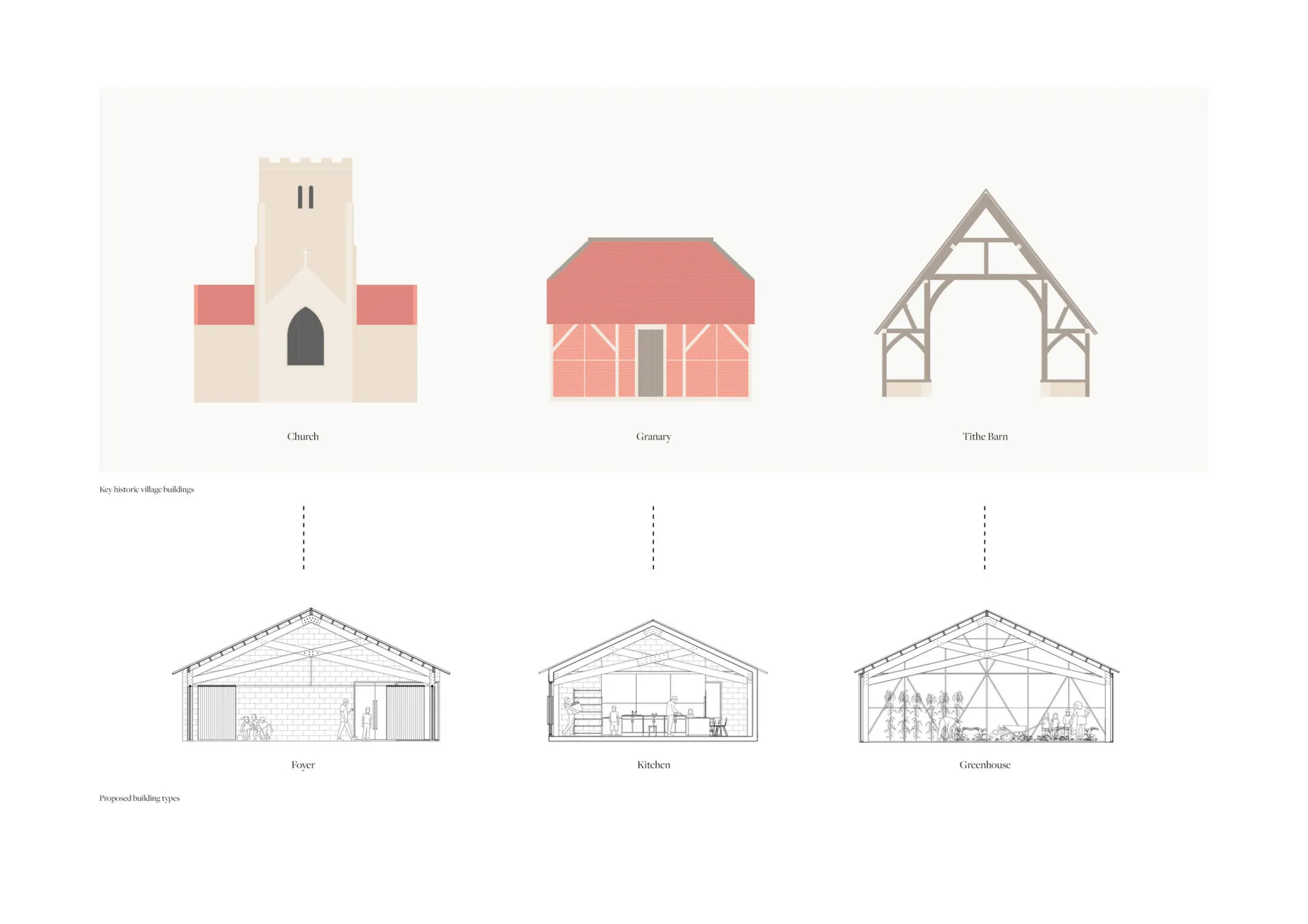 My Thesis project, based around an existing primary school in East London (Hallsville Primary School), is designed alongside the idea of the school as a village. Simple yet effective individual timber structures surround a courtyard, defining a new entrance to the school. Constructed from readily-available timber, polycarbonate, blockwork and metal sheeting, the buildings allow for self-construction which involve members of the community, strengthening the local community bonds. The proposed foyer building, inspired by the congregative nature of a traditional village church, provides a formal reception and sits alongside a flexible open space which can be enclosed by waterproof curtains. Meanwhile, a new kitchen classroom provides the school children with hands-on activity which reflects a traditional reliance on the land for food (which is grown within the proposed neighbouring greenhouse, overlooked by the kitchen). Green space is maximised across the site, providing natural areas for wildlife to thrive and children to learn from and enjoy. Hallsville Primary School would then have a rural character, presenting a rare experience of the village-type within the dense city of London.