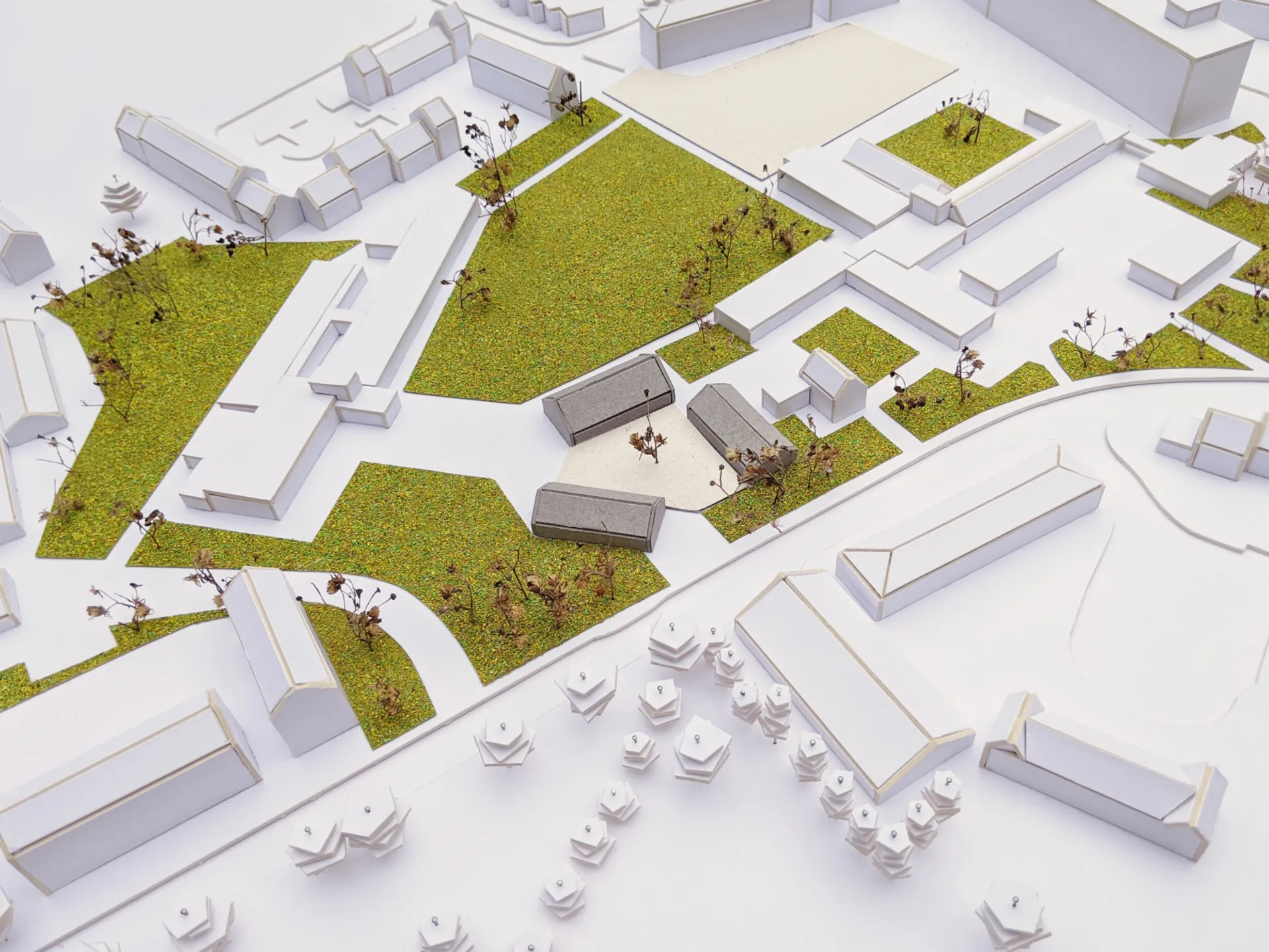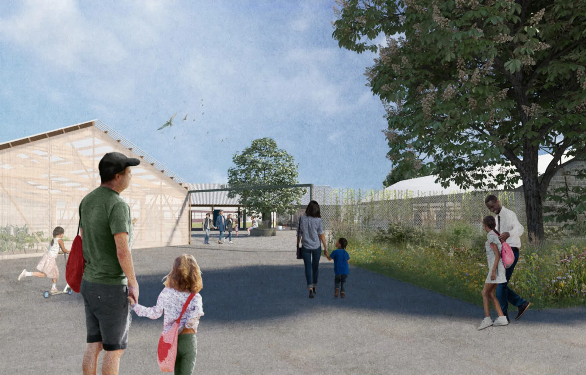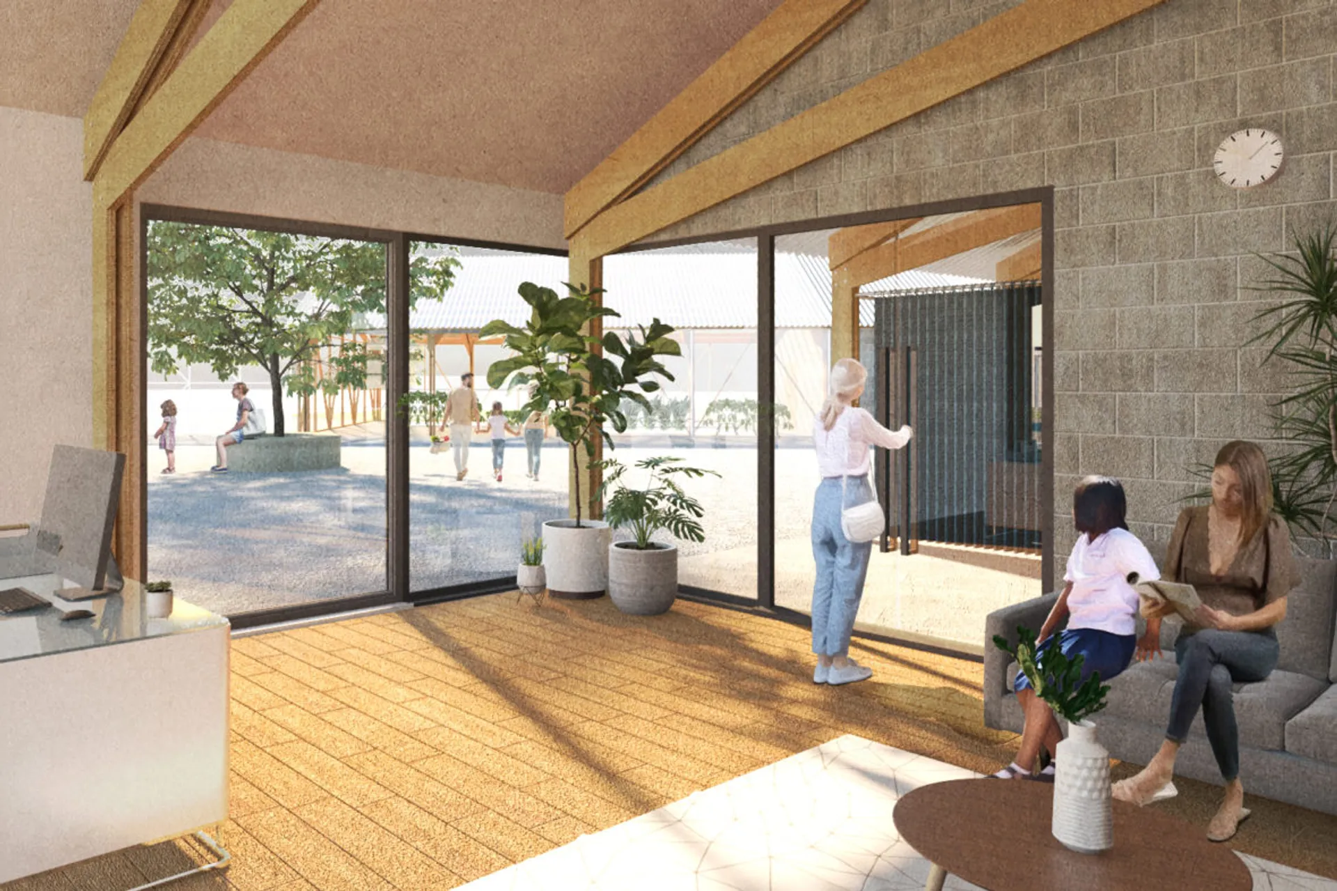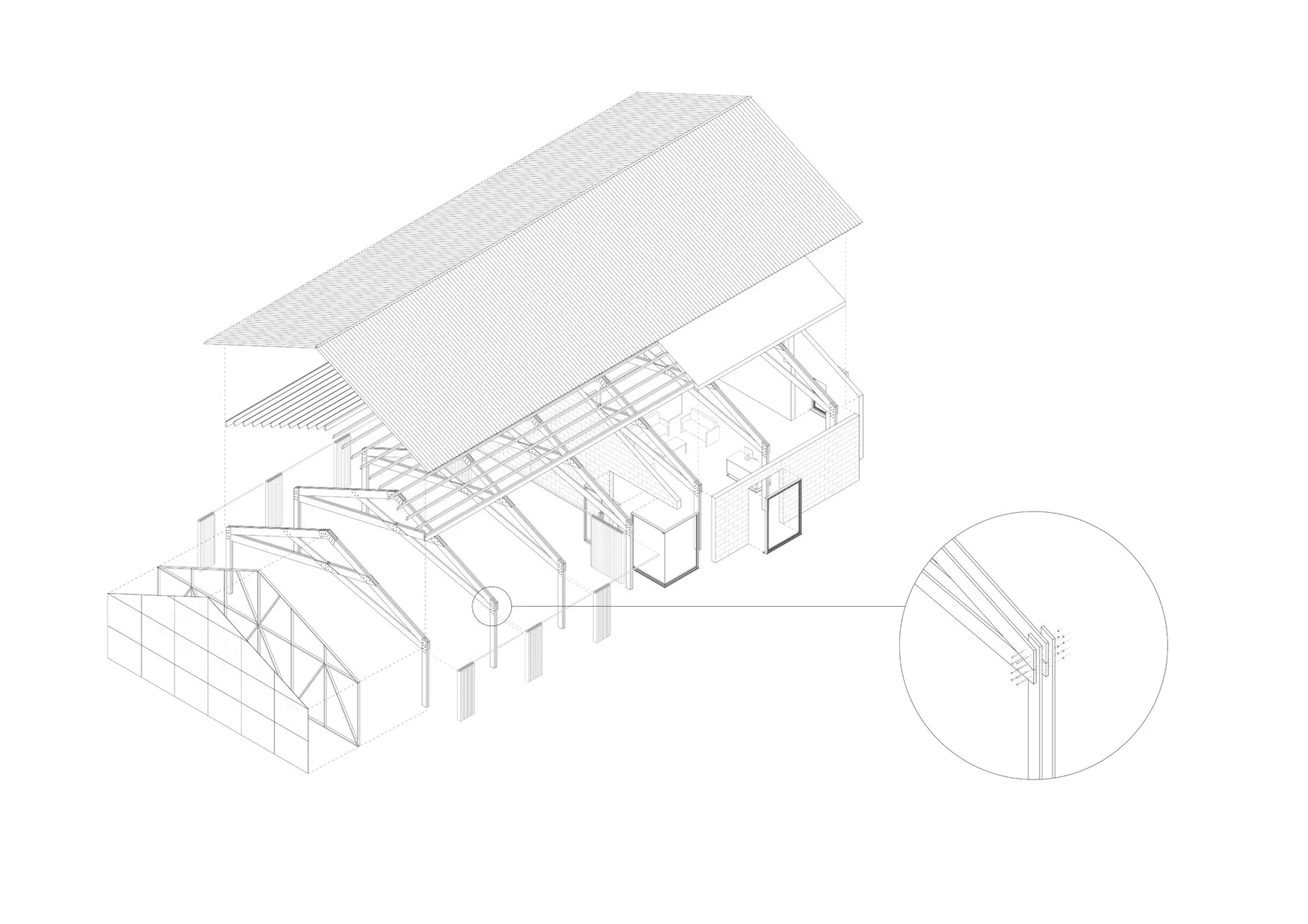 My Thesis project, based around an existing primary school in East London (Hallsville Primary School), is designed alongside the idea of the school as a village. Simple yet effective individual timber structures surround a courtyard, defining a new entrance to the school. Constructed from readily-available timber, polycarbonate, blockwork and metal sheeting, the buildings allow for self-construction which involve members of the community, strengthening the local community bonds. The proposed foyer building, inspired by the congregative nature of a traditional village church, provides a formal reception and sits alongside a flexible open space which can be enclosed by waterproof curtains. Meanwhile, a new kitchen classroom provides the school children with hands-on activity which reflects a traditional reliance on the land for food (which is grown within the proposed neighbouring greenhouse, overlooked by the kitchen). Green space is maximised across the site, providing natural areas for wildlife to thrive and children to learn from and enjoy. Hallsville Primary School would then have a rural character, presenting a rare experience of the village-type within the dense city of London.