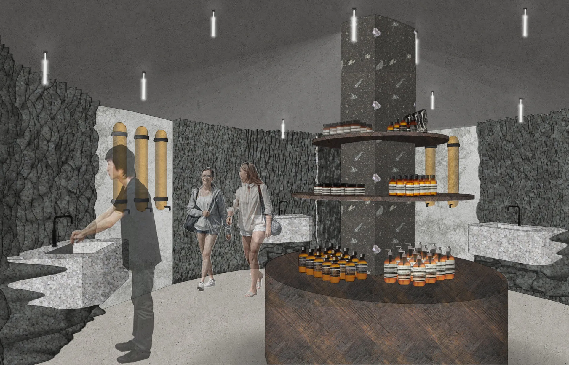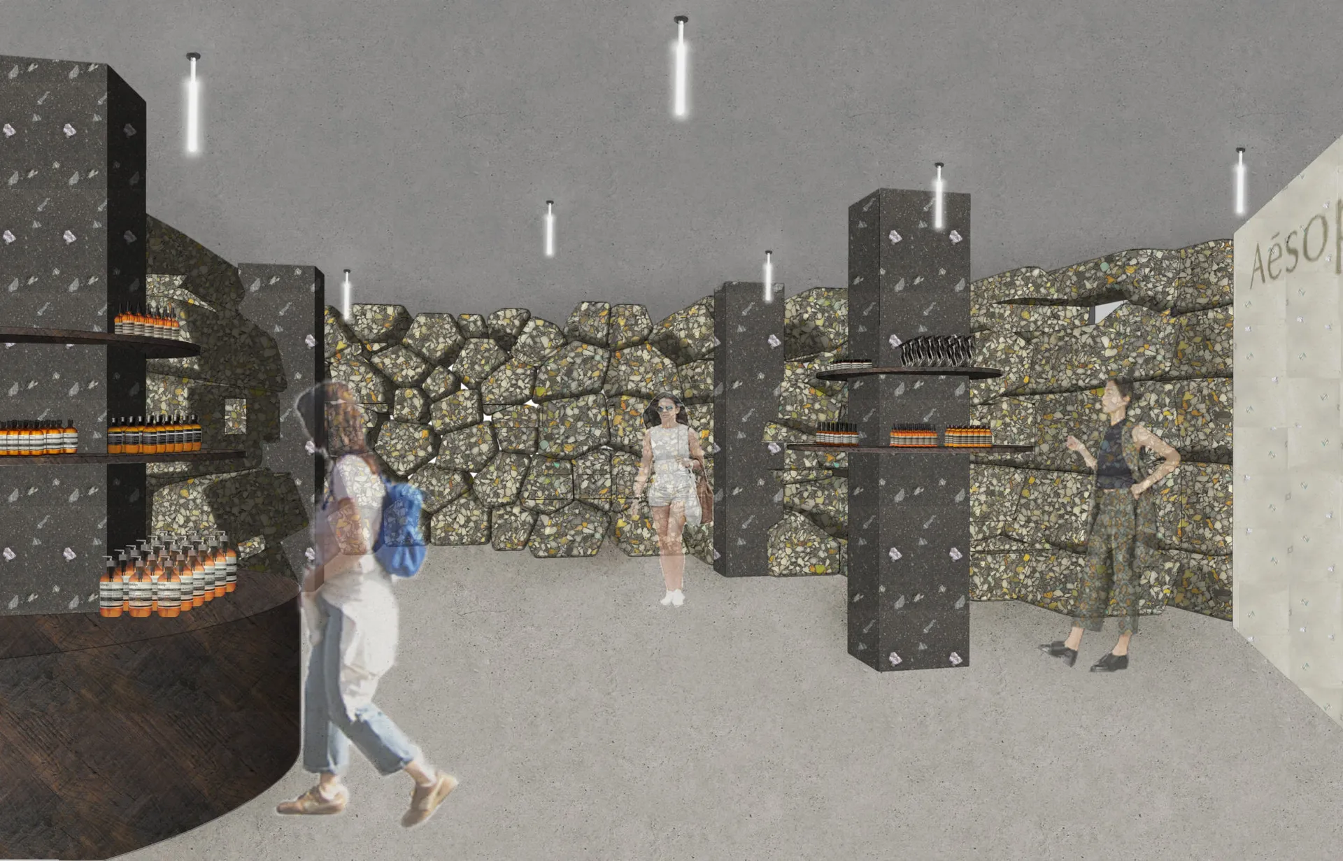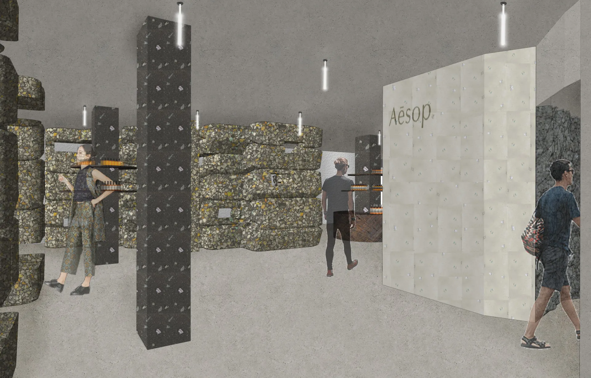 The project focuses on creating a new space for the Aesop brand reserved for shopping and beyond. This space should be meaningful, sustainable and combine the usual shopping experience together with learning, knowledge-enrichment and (ideas) exchange possibilities, adapting and renewing the concept of the Greek Agora.