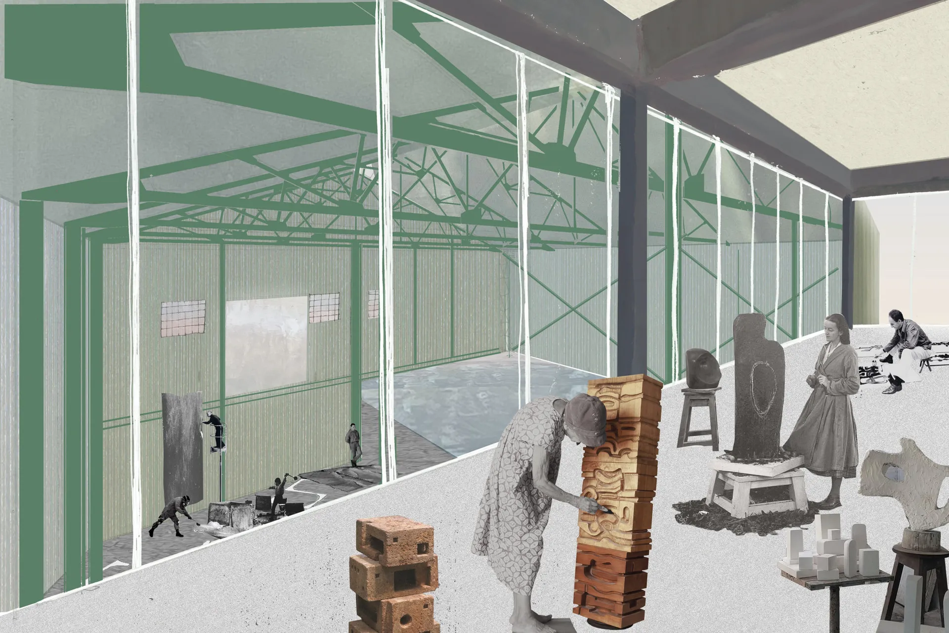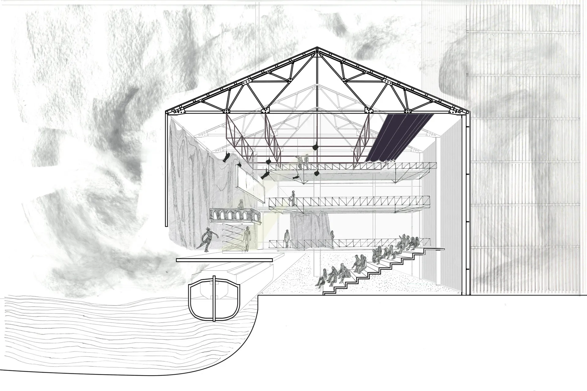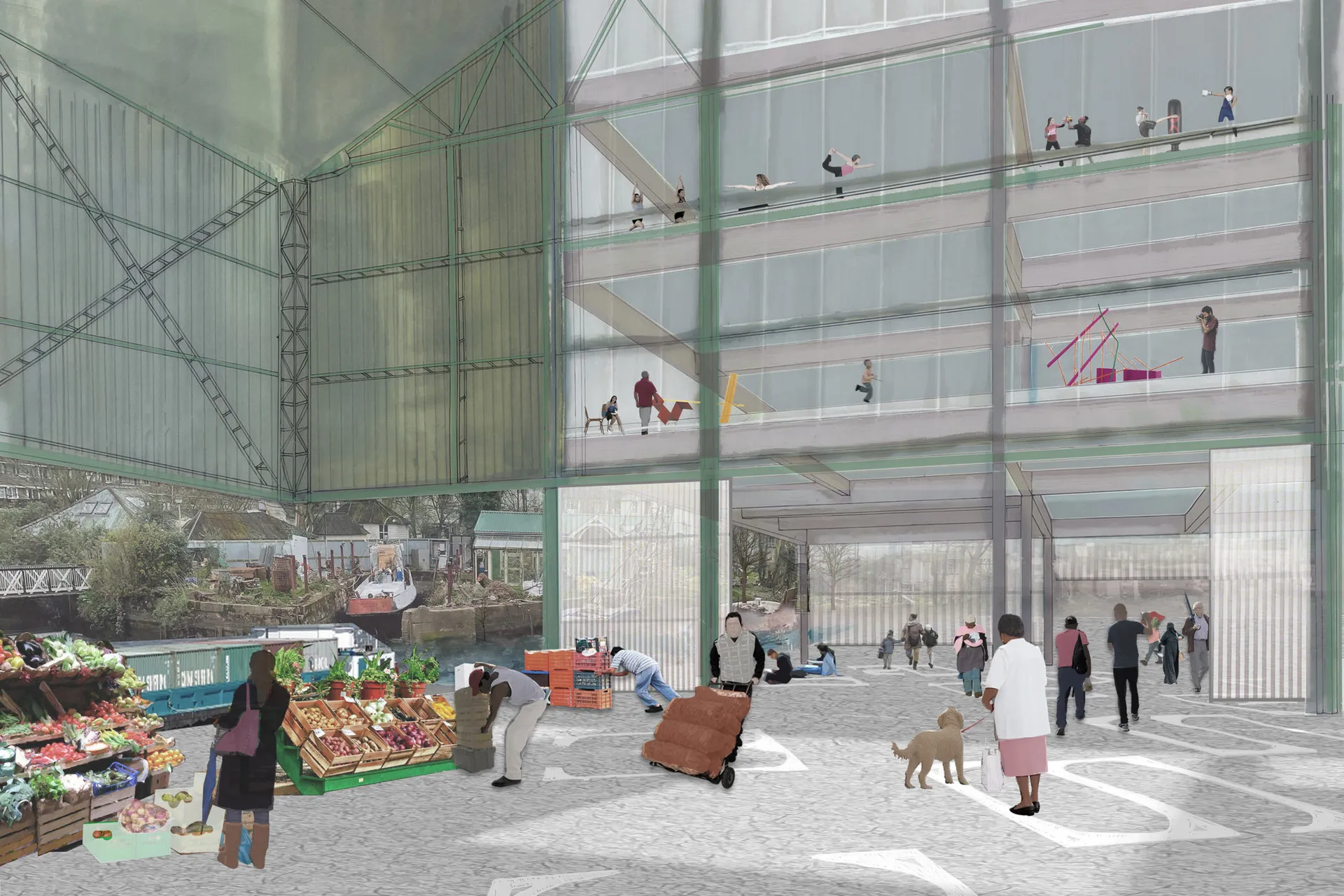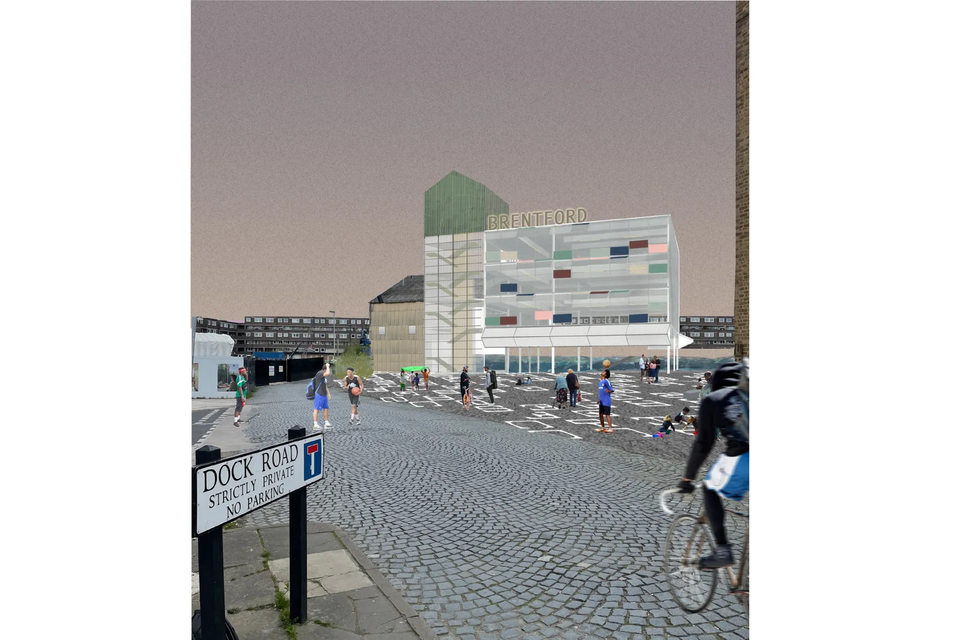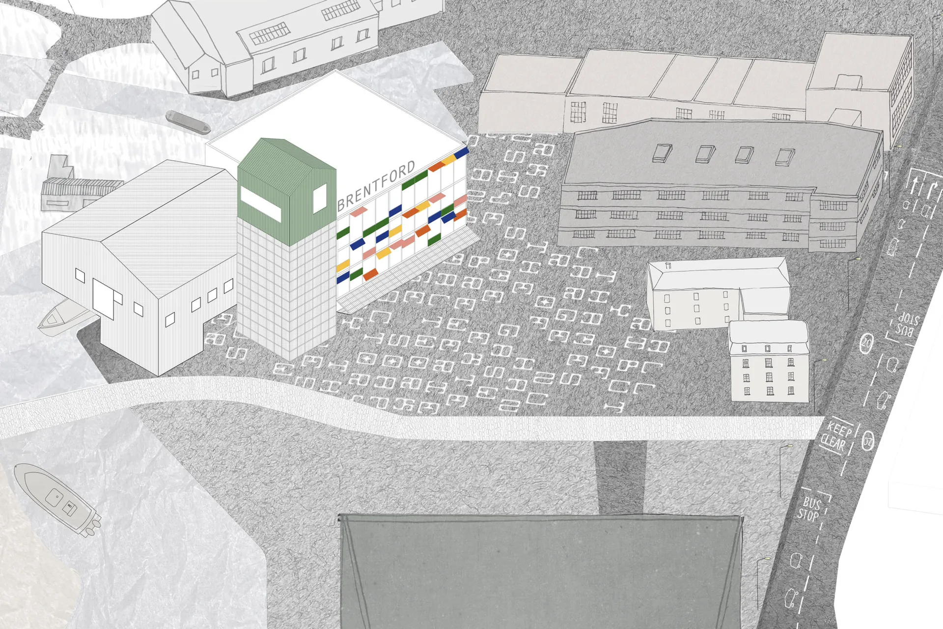 By retaining an existing warehouse on the site my proposal celebrates the industrial heritage of Brentford by repurposing a vacant shed and bus garage into a multi-purpose building where the local community can gather, perform, play or work. The warehouse is complemented by a new building and tower to become a Palace for the People that welcomes the public from the adjacent high street.