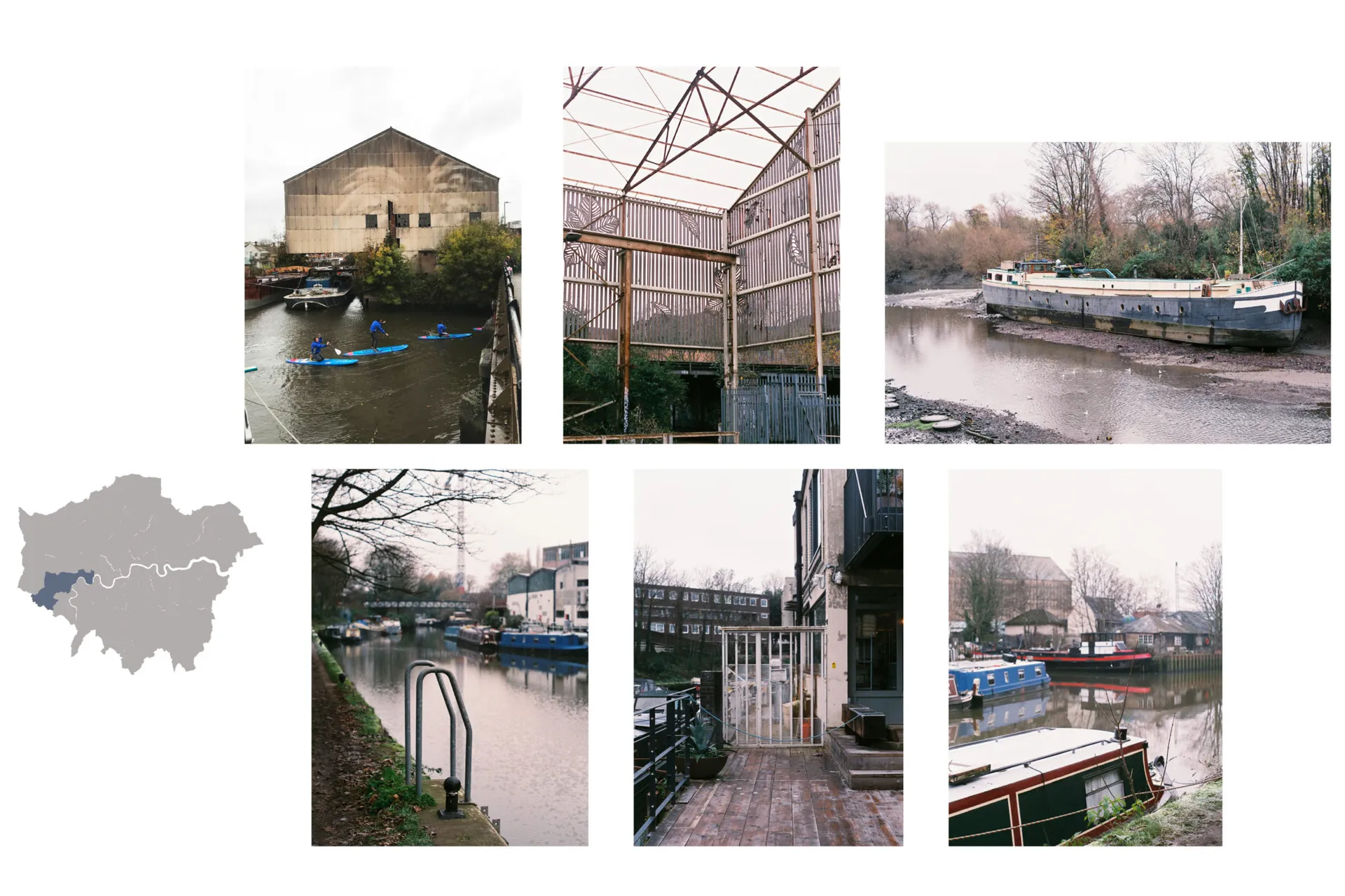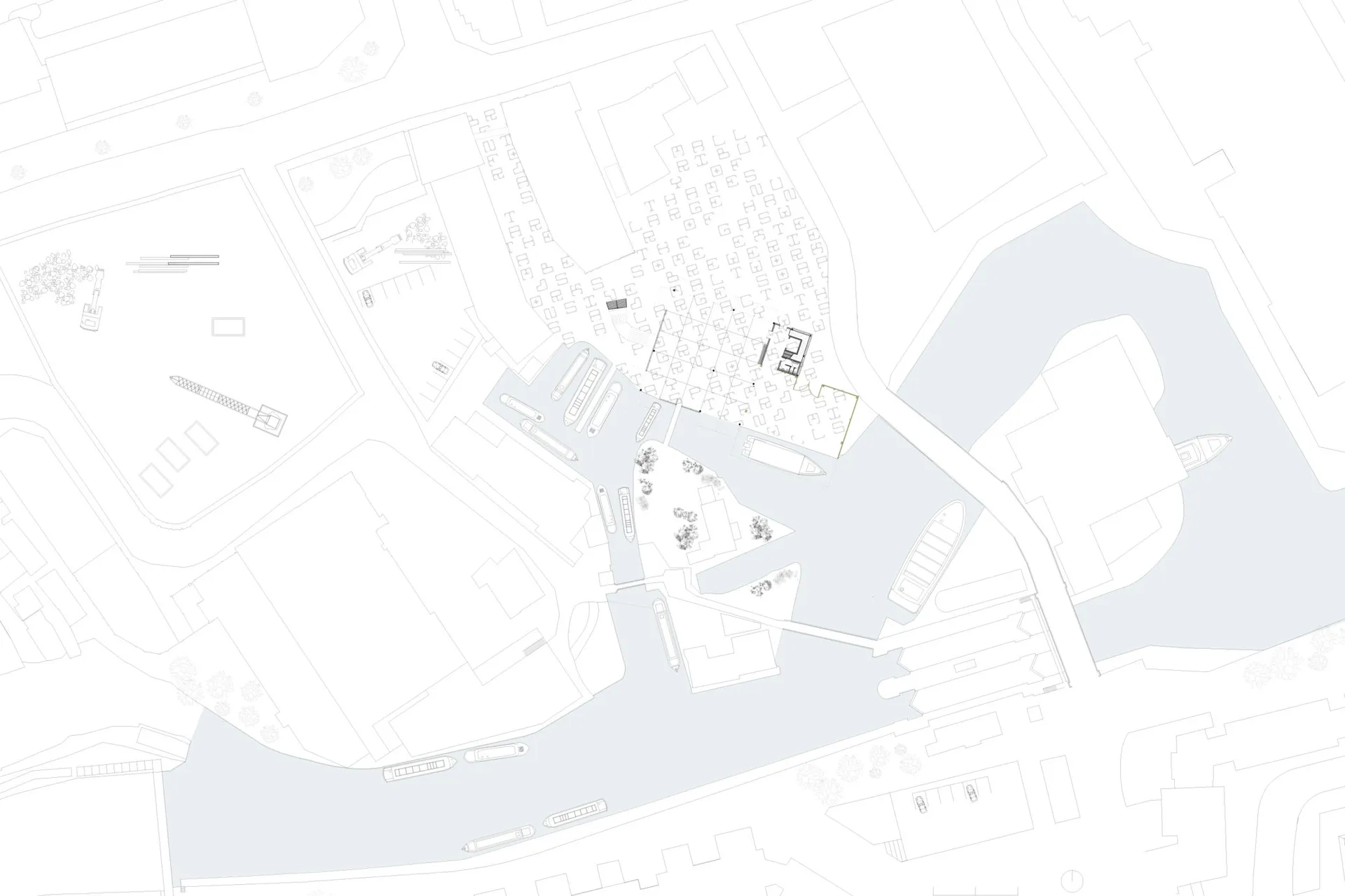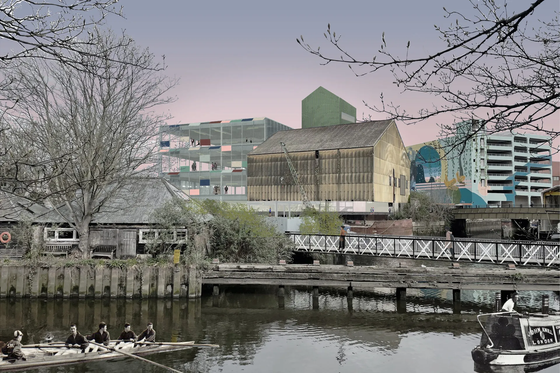 The proposal sits alongside the Thames Lock where the Grand Union Canal meets the River Thames, and an existing bridge to an artist island intersects the ground floor. The polycarbonate clad tower contains the circulation and acts as a marker from the high street. The text on the ground signifies public space and runs right through the ground floor of the building, highlighting the completely civic and open nature of the palace.