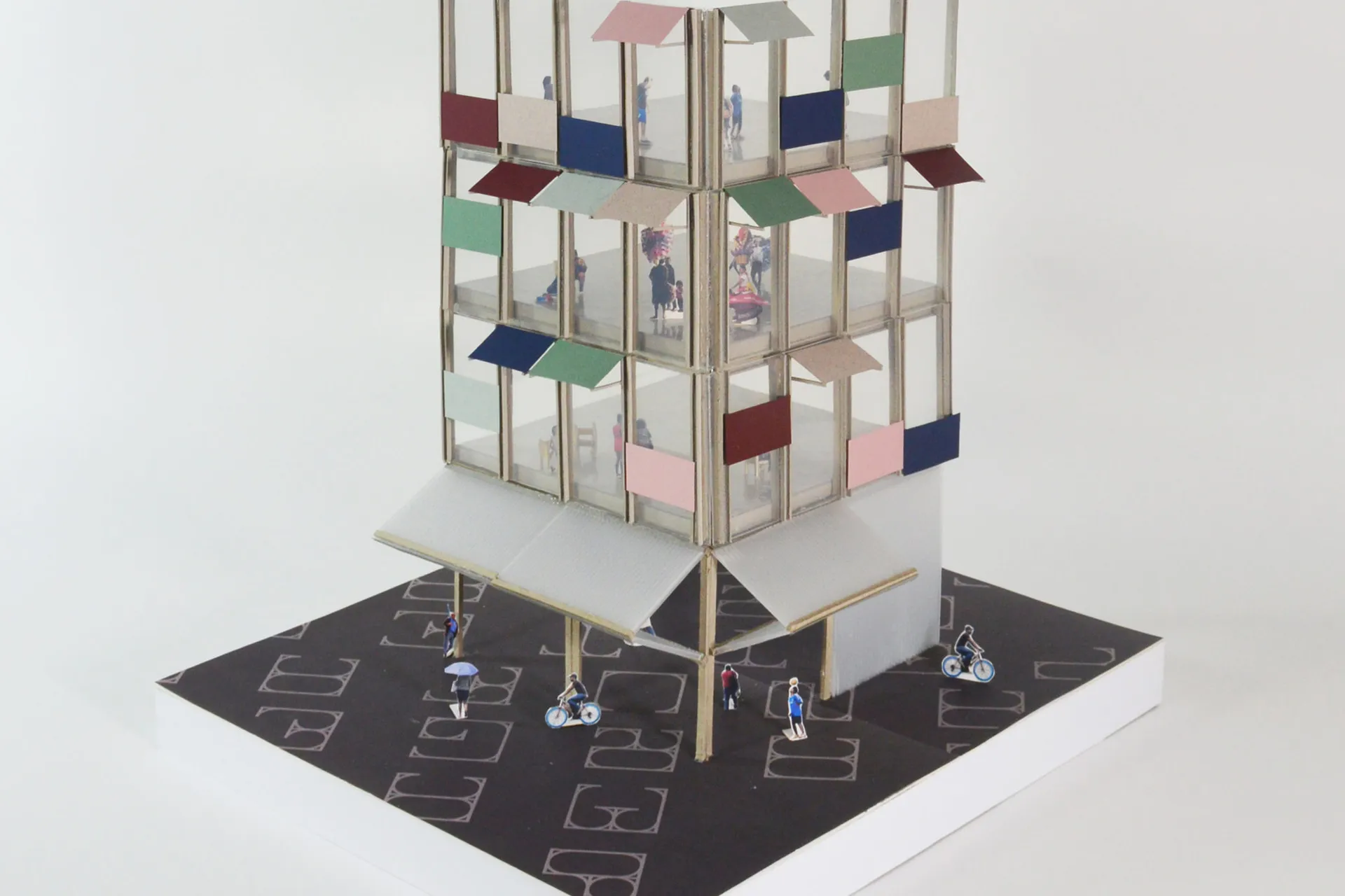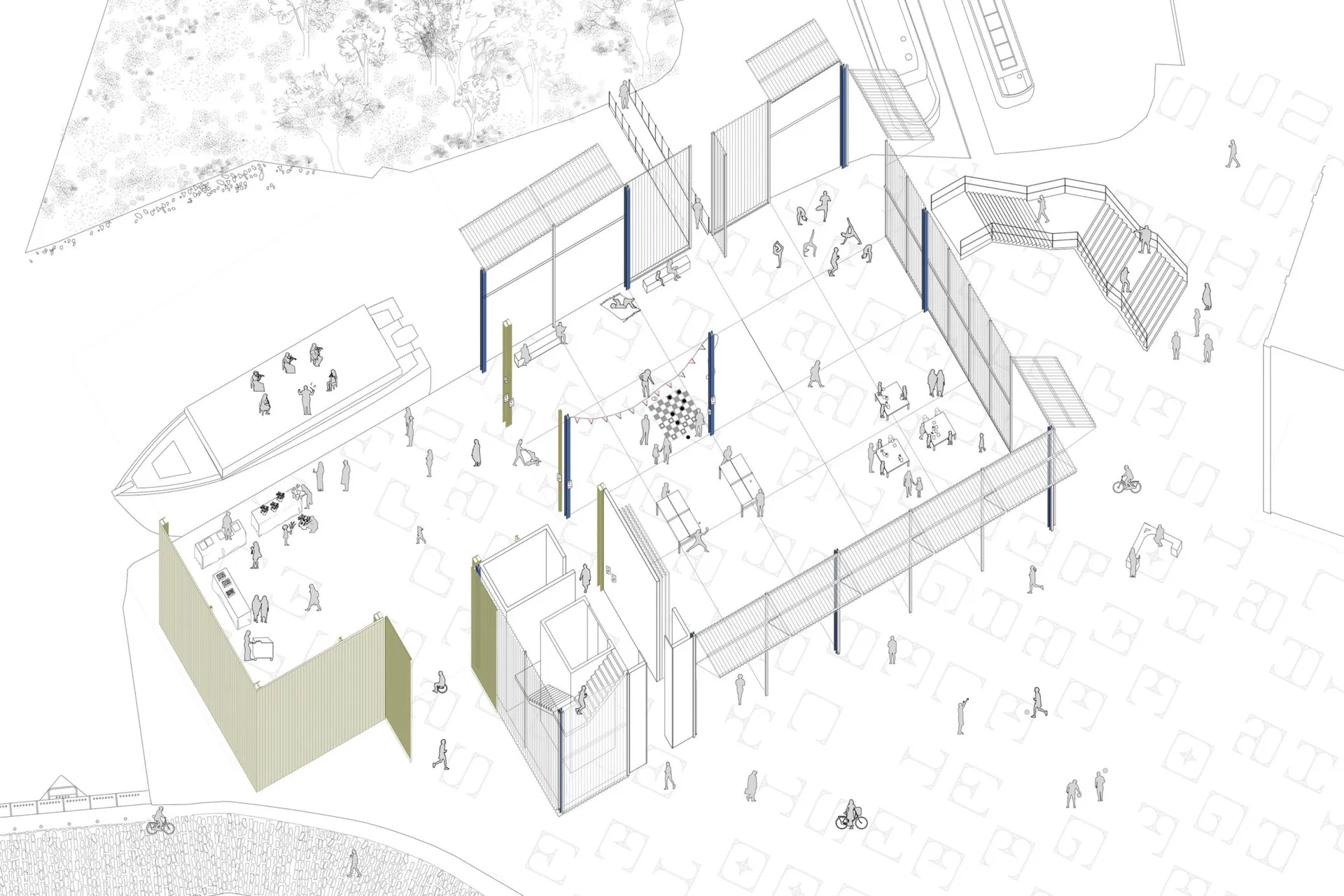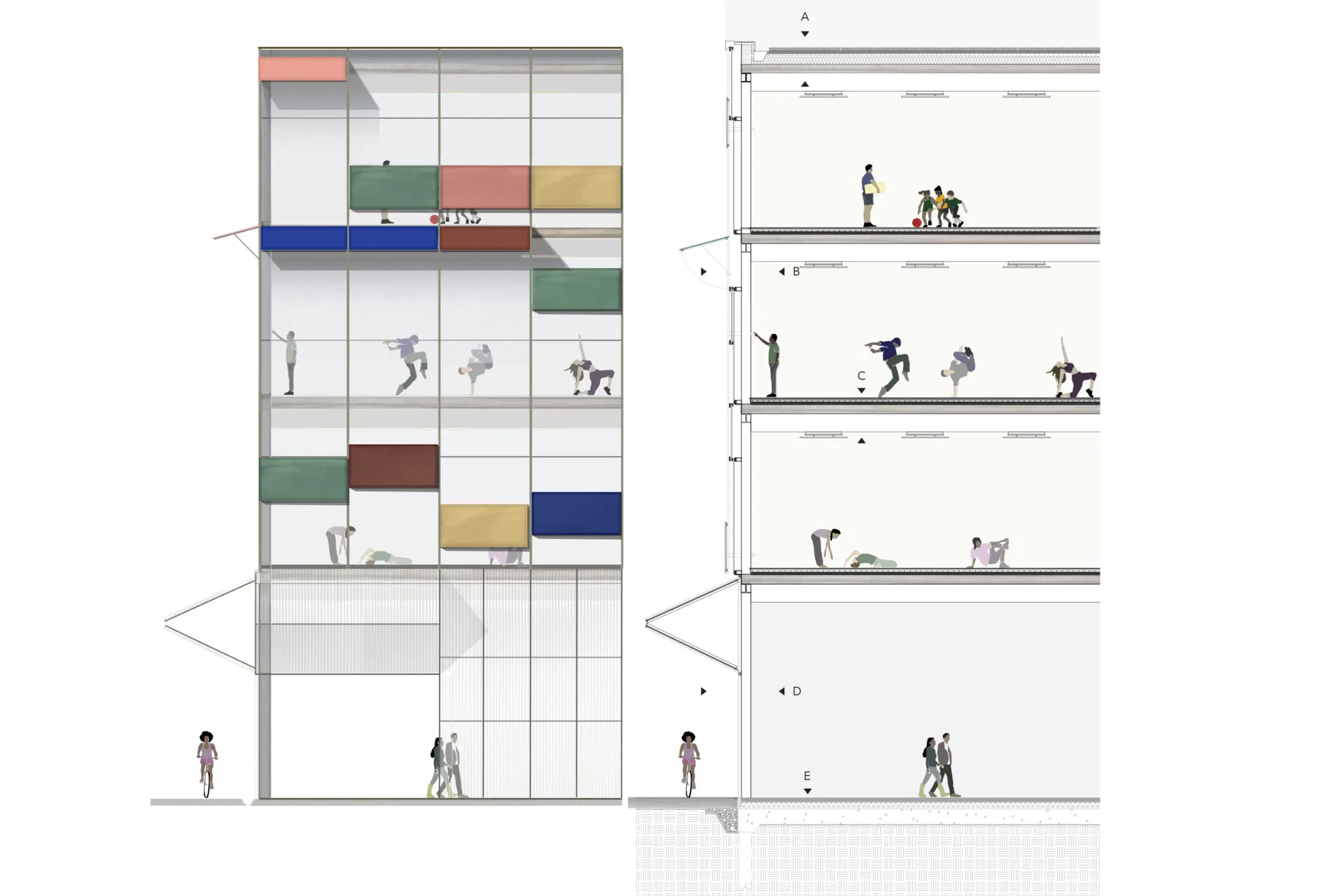 Colourful sliding panels clad the new building and can be adjusted to become sun-shading mechanisms as awnings. Non-prescriptive of functions the palace may become anything that serves the community it supports, from a theatre to a vaccination centre. It can be a place of interaction where children playing football on the new public space meet new friends on their way to the recording studios.