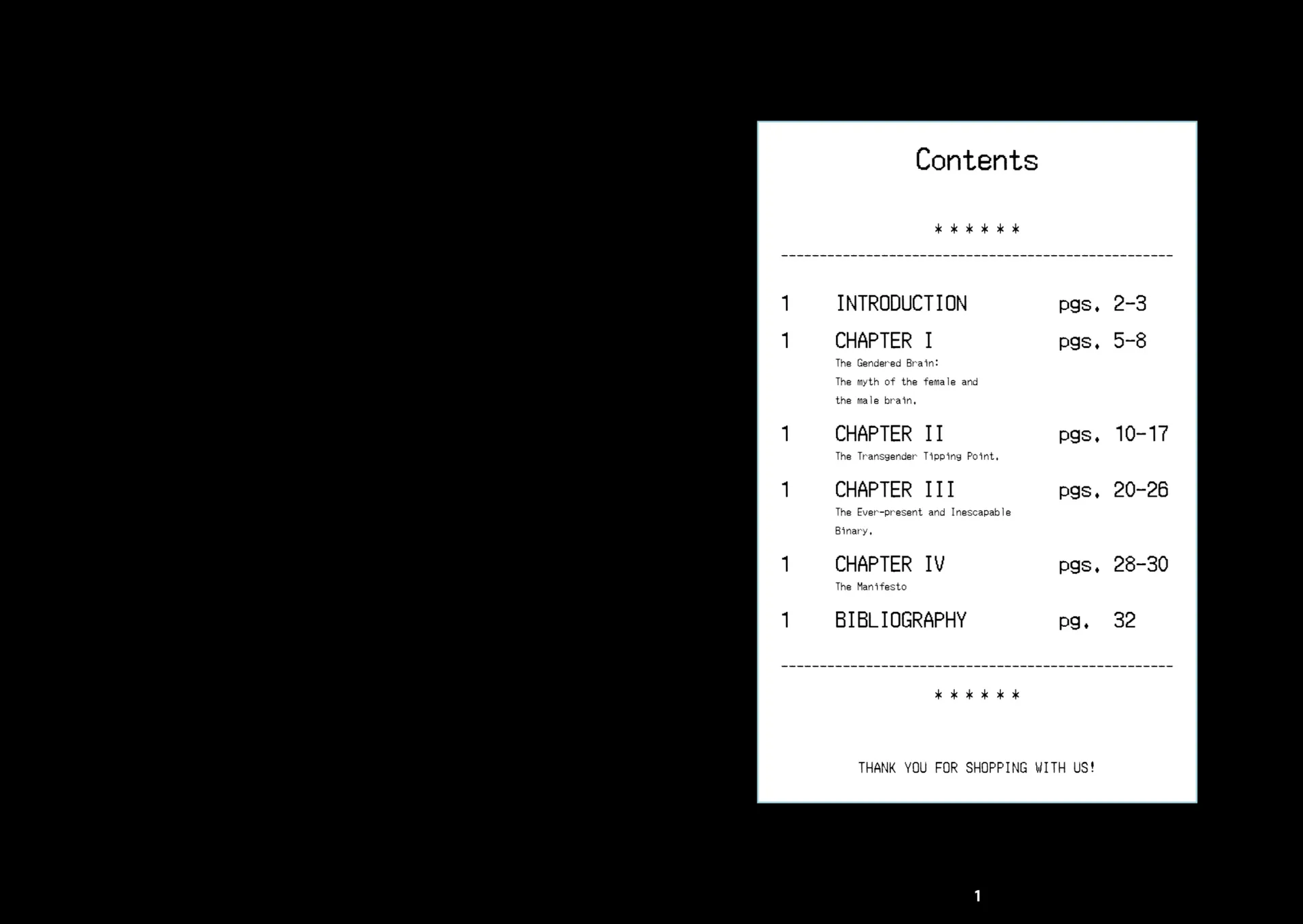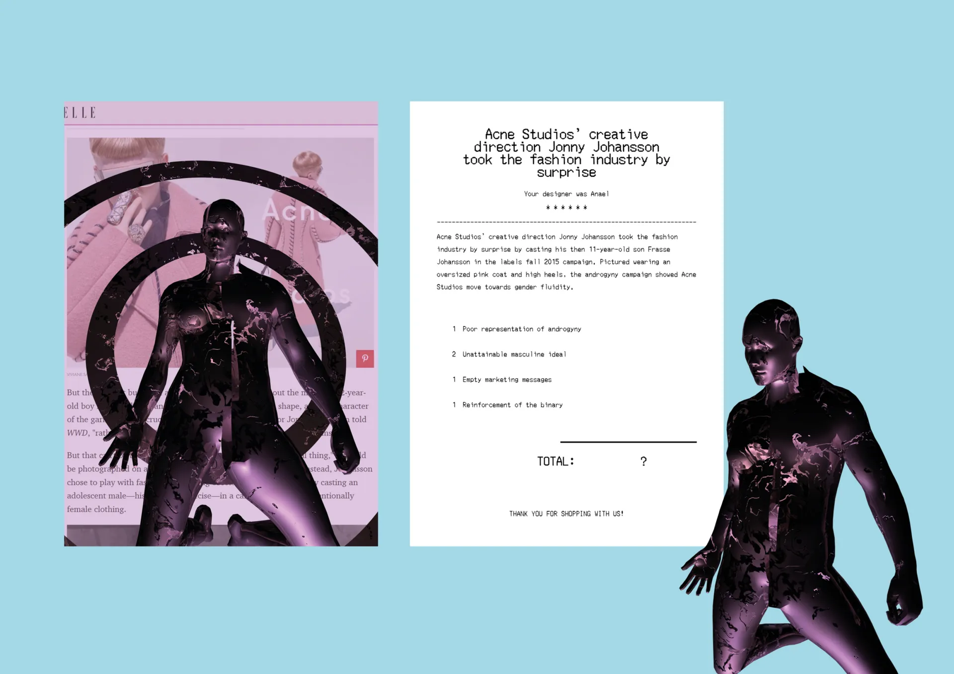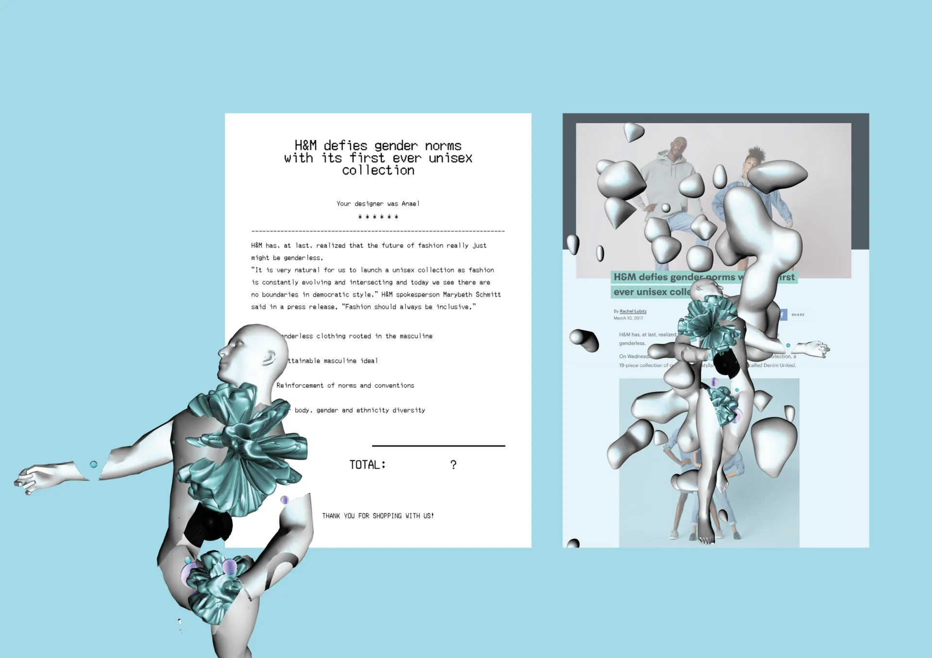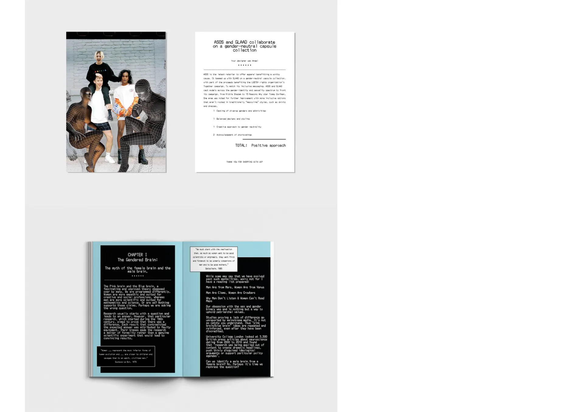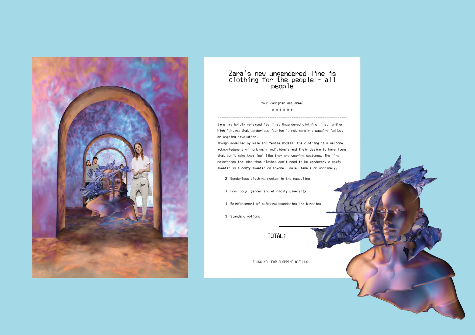 Anaël is an Art Direction graduate passionate about gender and disability in fashion, with the former being the subject of her major project. Don’t Forget your Receipt reflects on the question of androgyny and non-binarity in a gendered world. It focuses on fast fashion’s approach to the expansion of the gender spectrum and its impact on mainstream culture and society.