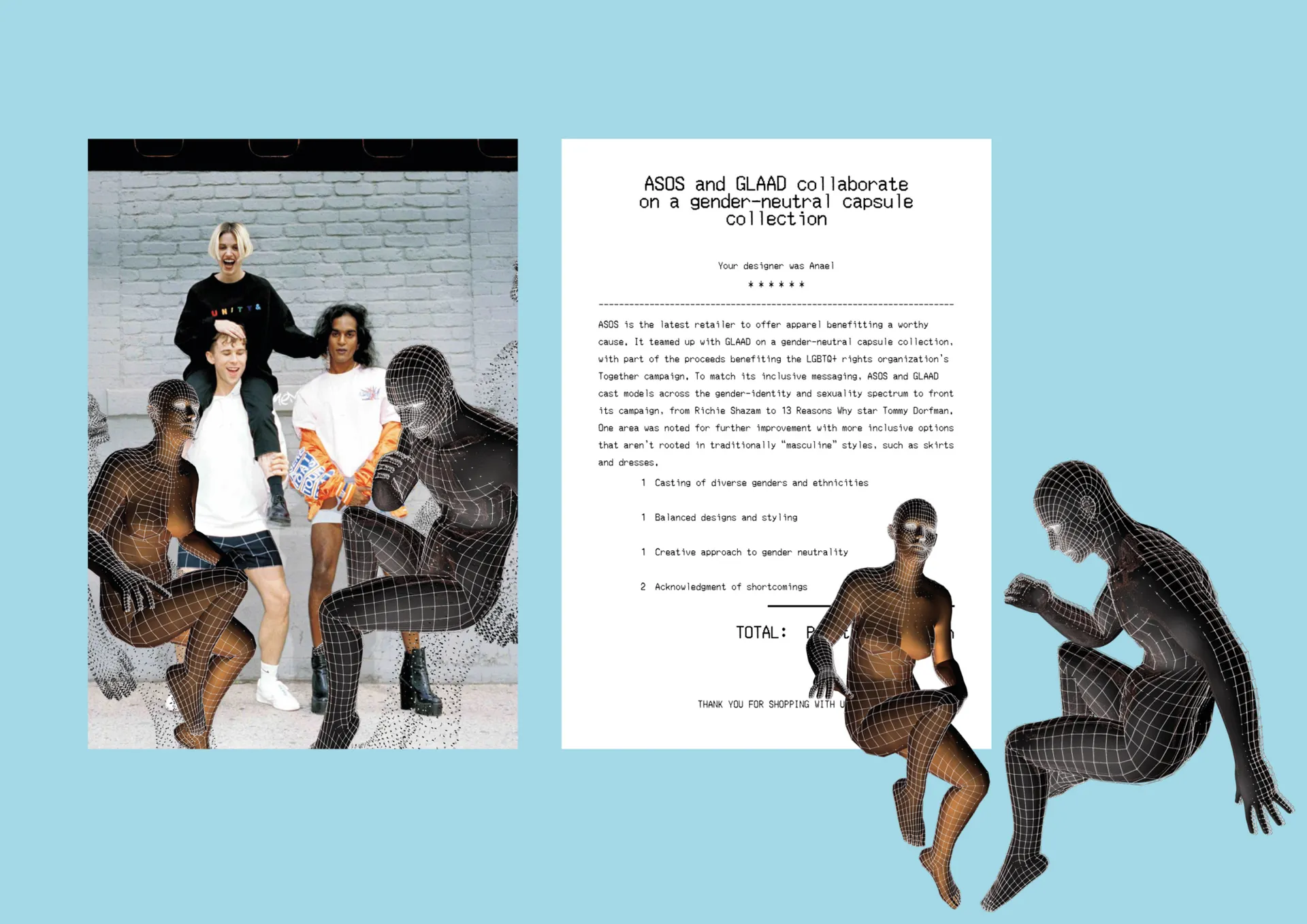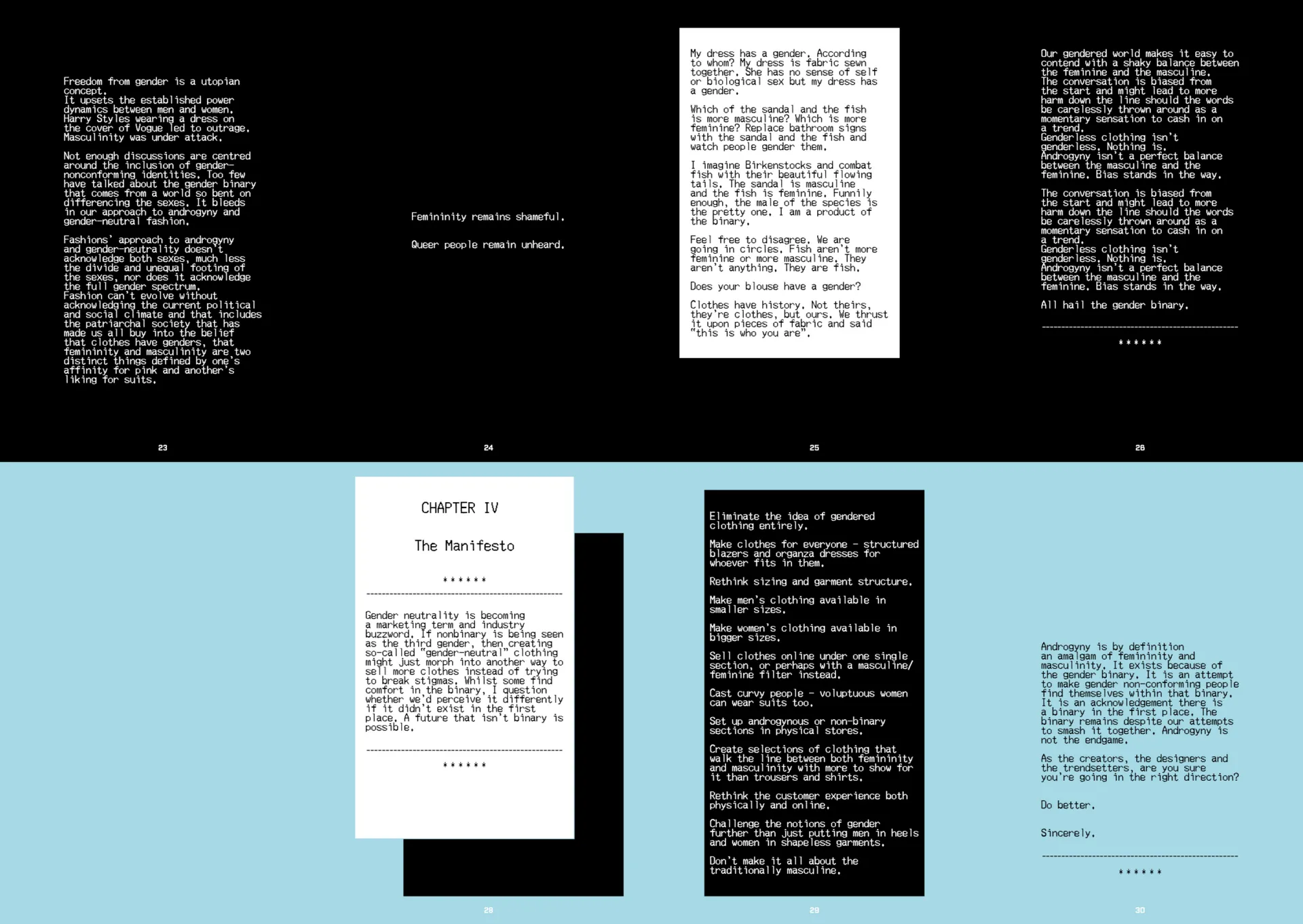 Throughout their project, Anaël aims to understand the roots of such terms, as well as their place within our gendered society and mainstream fashion. They realised that one cannot talk about androgyny without first understanding in which ways modern society is built and dependant on the gender binary and the gender roles that come with it. Is it truly possible to live in a genderless world? Brands seem to think so or at the very least entertain this possibility. Fast fashion’s apparent desire to distance itself from the gender binary contradicts its androcentric and gendered marketing narratives.