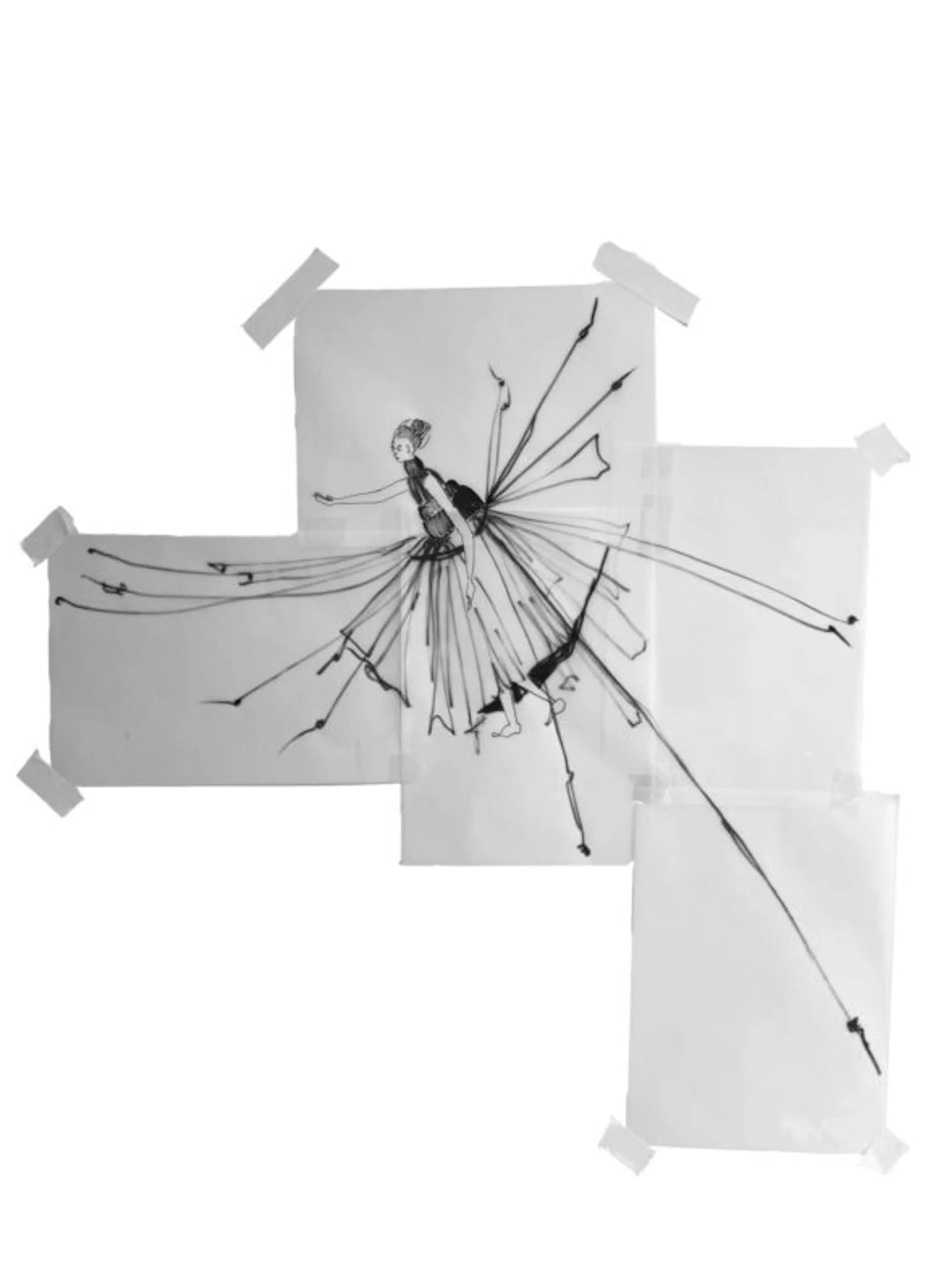 I have designed and made a performative garment to allow jazz musicians to express the music they are playing physically. More specifically I tailored my garment to the jazz performance singer Eleanor Rashid. The garment explores the sensation of being grounded and highlights the energy in which musicians feel in their core. The idea of funnelling air through restriction and then becoming free is illustrated within the skirt and top detailing.