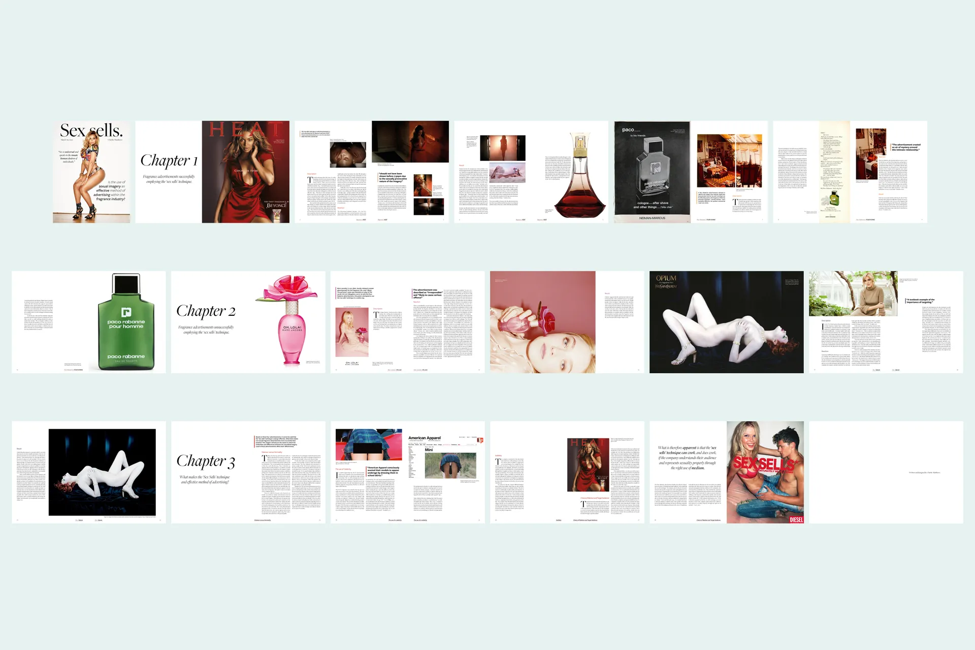 The next project is the publication of my dissertation. The title of the dissertation is ‘Sex sells’. Is the use of sexual imagery an effective method of advertising within the fragrance industry? I decided to publish my dissertation in a magazine form. However, instead of using typical magazine binding, I instead opted for dos-a-dos binding. This results in the user having to turn the magazine around to read the different arguments both for and against the use of sexual imagery.