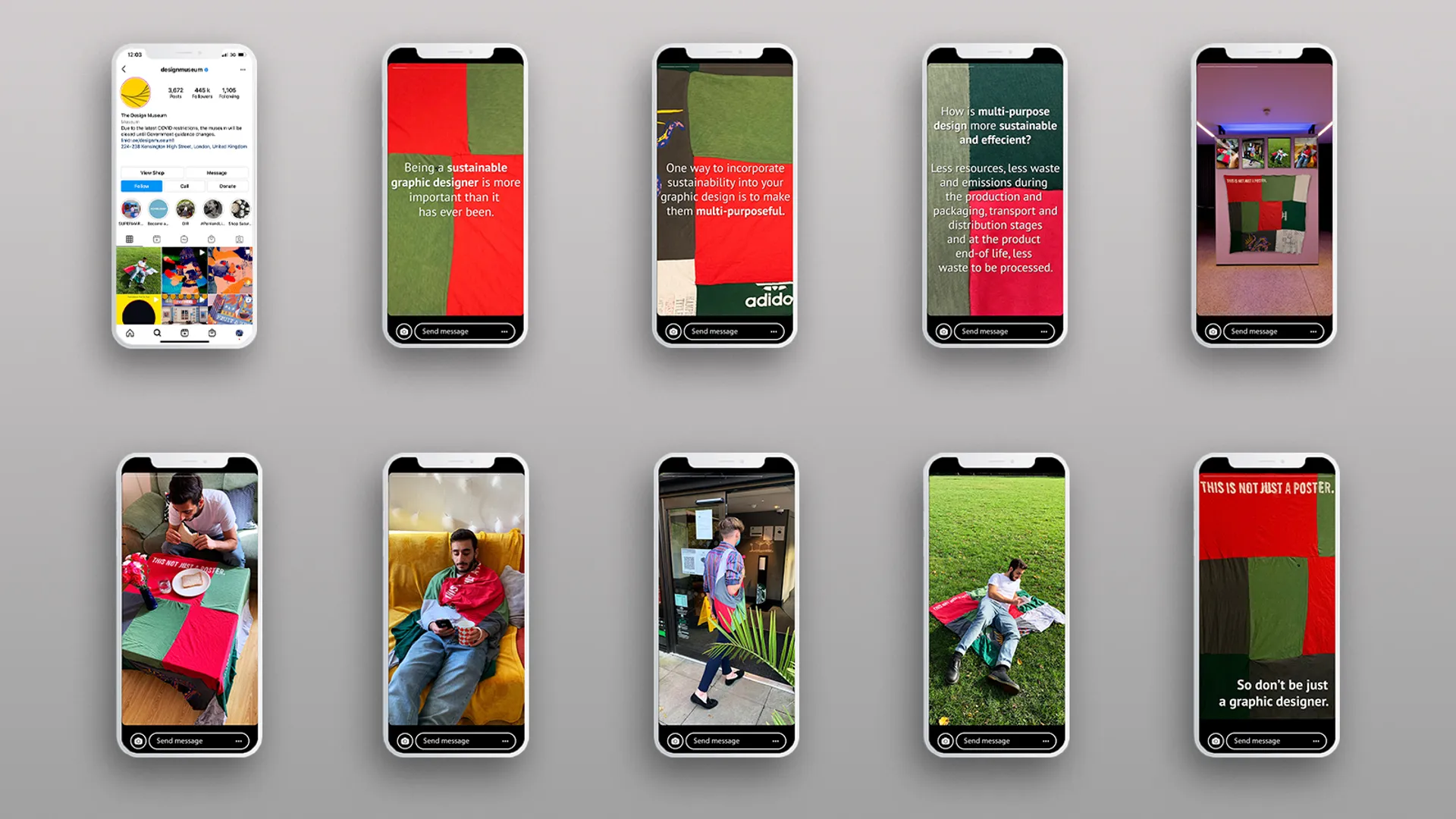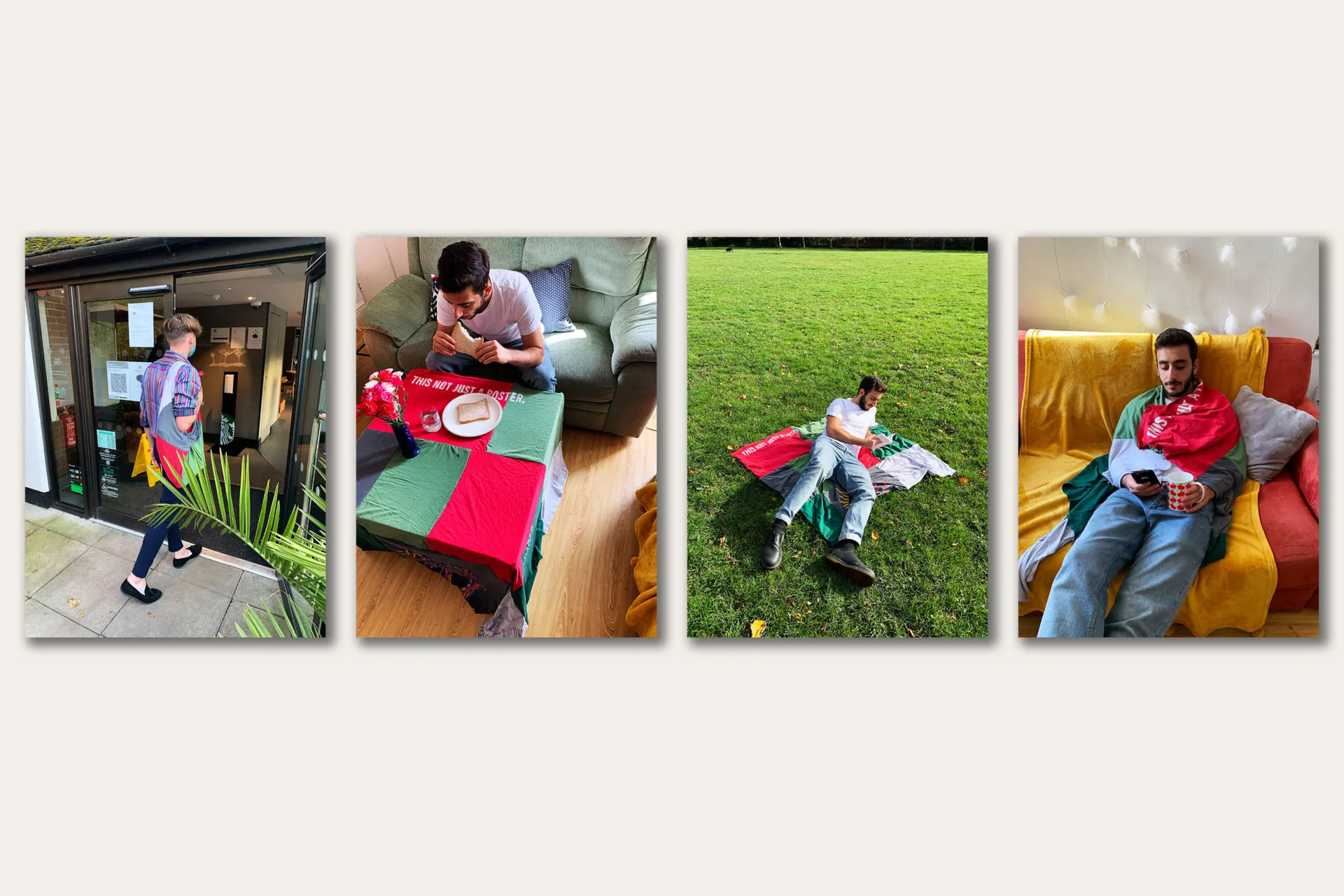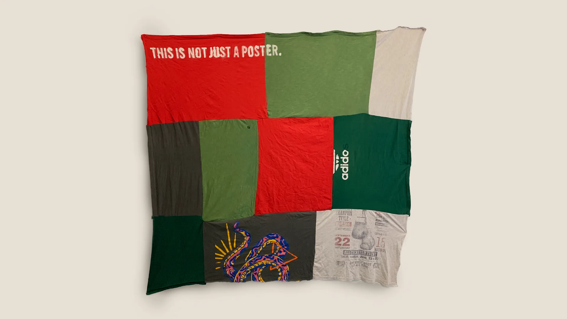 The final project in my showreel explores my position on sustainability within graphic design. The brief required that I create a poster to do this. My poster was created using old t-shirts that I sewed together. This was because I wanted the poster to be multi-functional, as modularity in design is an effective way to be a sustainable graphic designer. The poster could be used as a picnic blanket, a bag, a tablecloth, or a blanket.