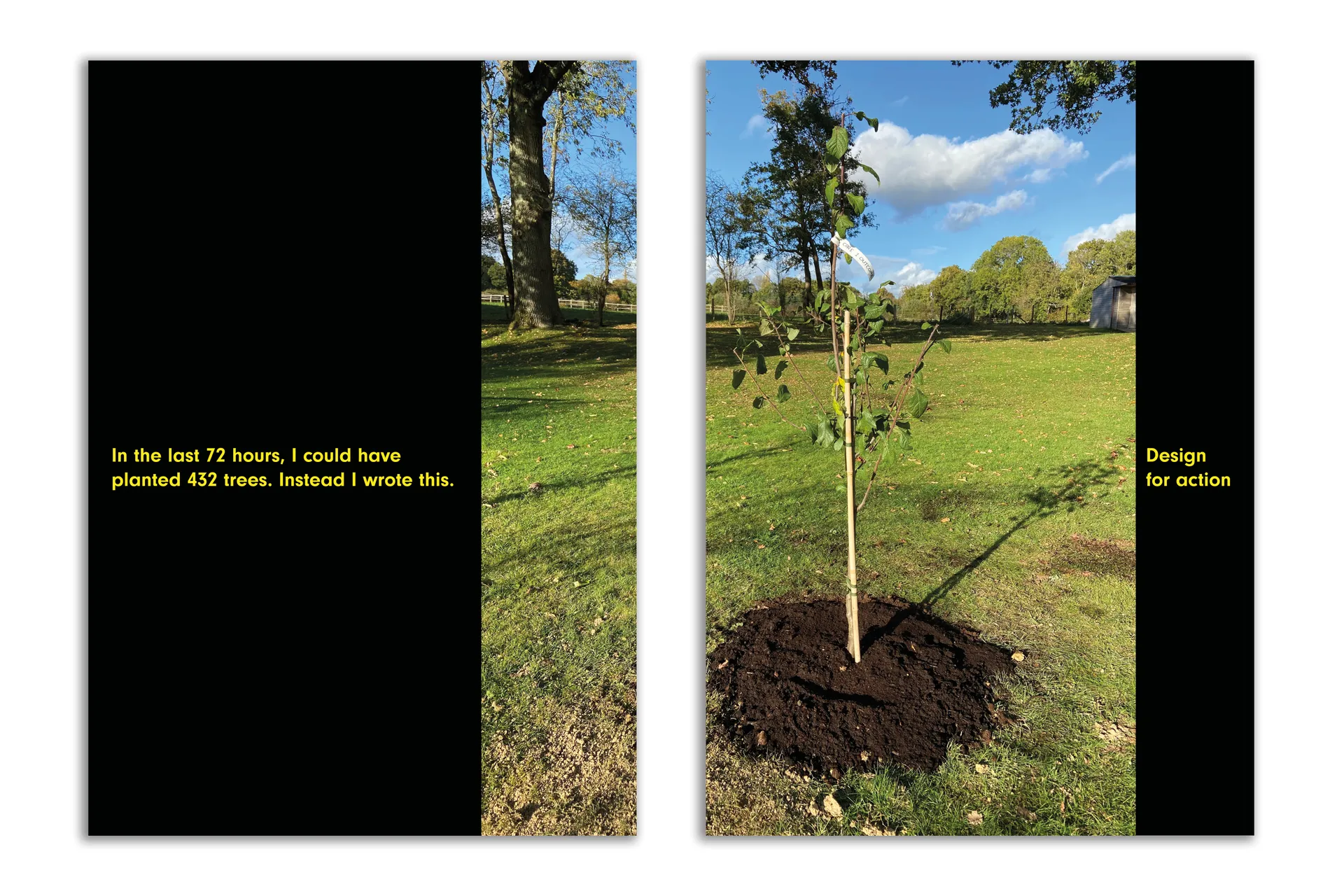Design for action is my position on a graphic designer’s relationship with sustainability. As a designer I need to ensure my work takes physical action towards helping the environment. By planting a tree, I was able to ensure this project had an immediate and on-going positive impact on the environment. You can see the film on Vimeo.