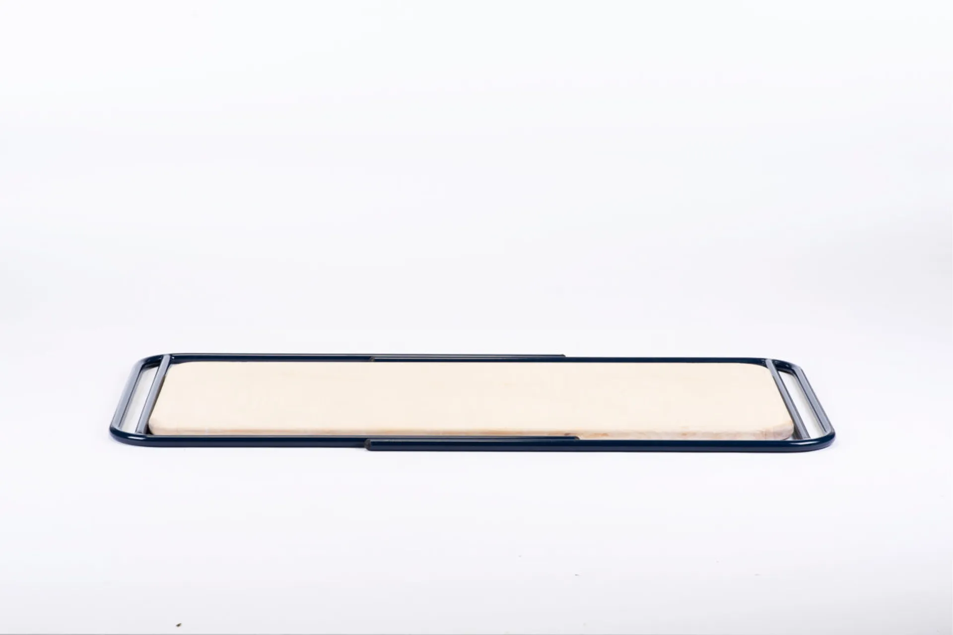 The top has a honeycomb ‘Dufaylite’ internal, with hardwood lipping and a veneered surface. The legs and table hanger are stainless steel, with a powder-coat finish.