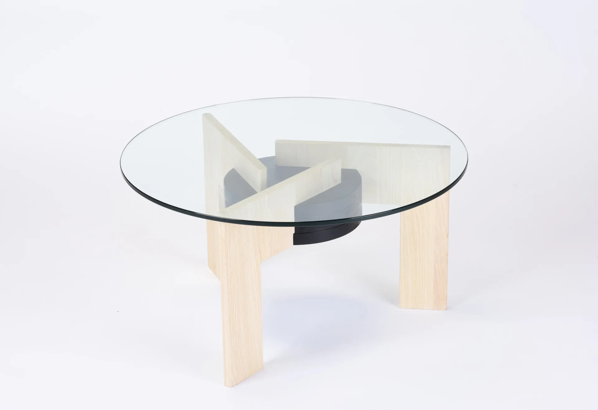 Using an equilateral triangle for the middle component creates the aesthesis flow of the layout of the three legs within the central component. A circular glass top creates a unique appearance to appear through the glass top.