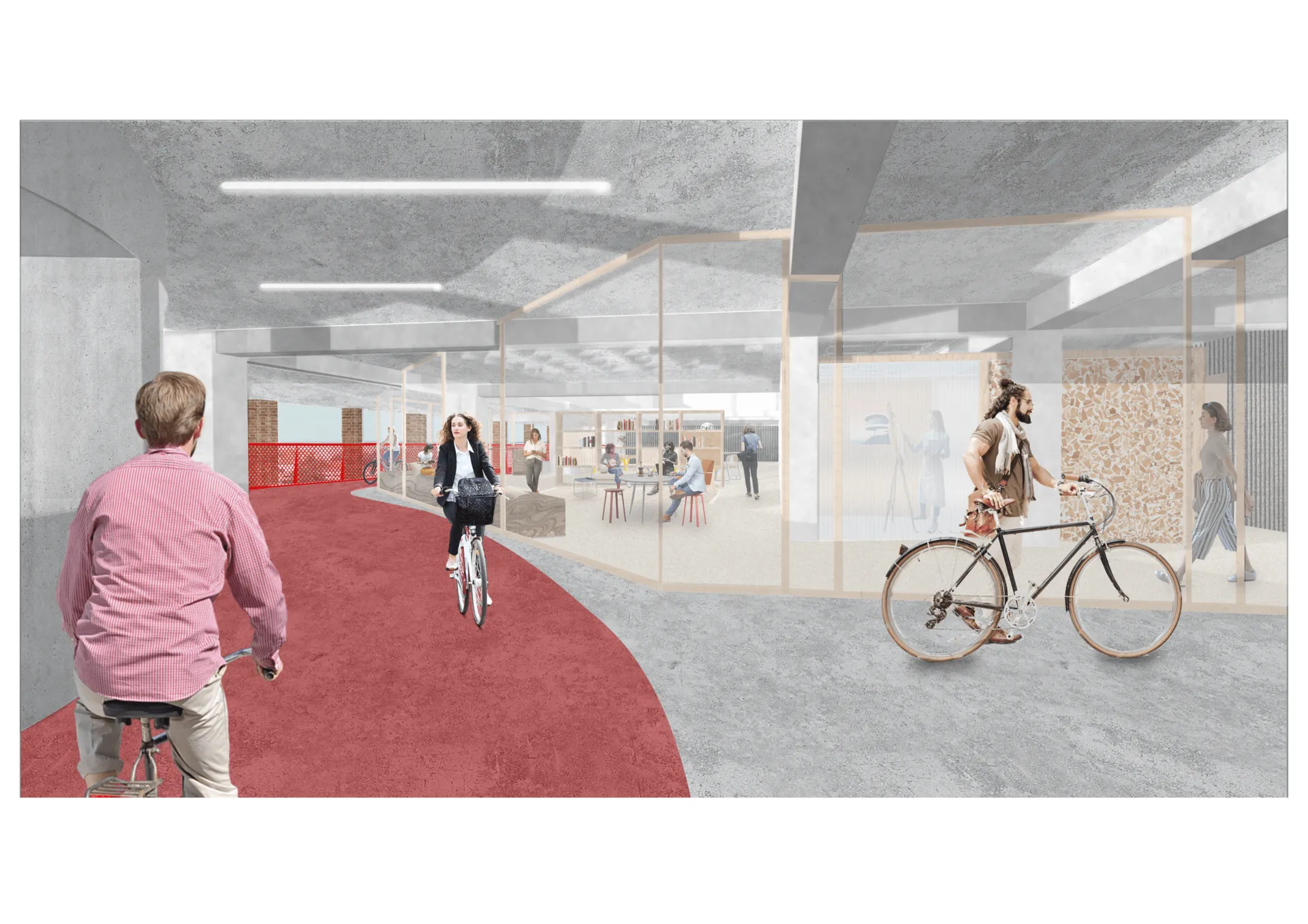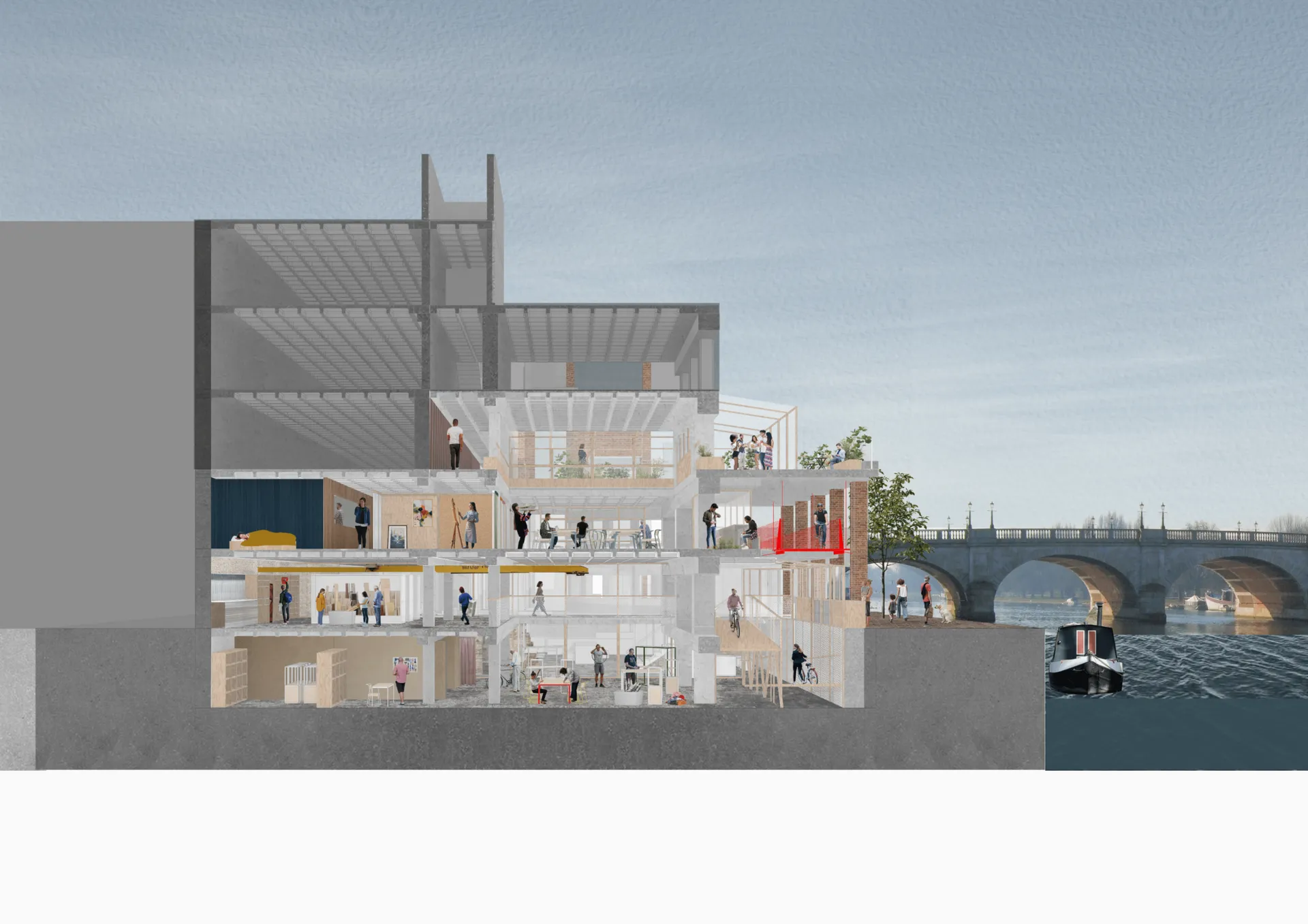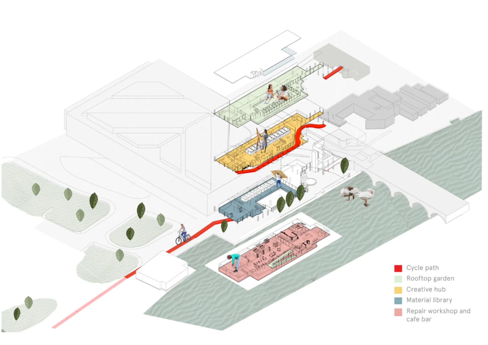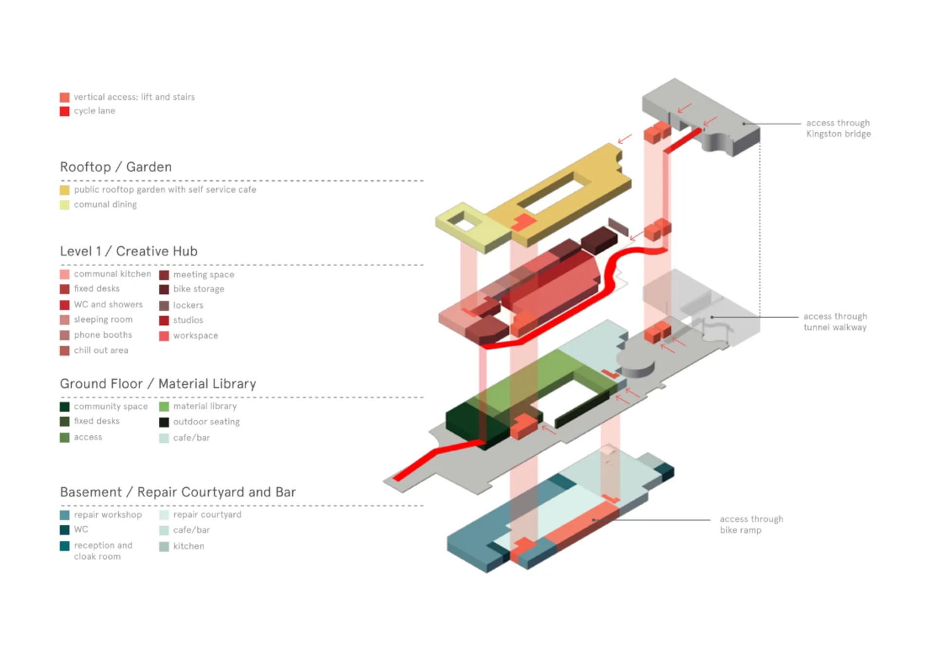 Spatially, the Multihall comprises a creative hub for recent graduates, young designers and entrepreneurs on the first floor with a rooftop garden above for the public. In the basement, that holds ruins of the first bridge in Kingston, is a repair workshop and a cafe bar. The workshop facilitates activities to create knowledge around sustainability and circular economy, encouraging a behaviour that reduces waste and consumption. Furthermore, the cafe offers space for social interaction, then turning into a bar in the evening, boosting Kingston`s evening economy.
