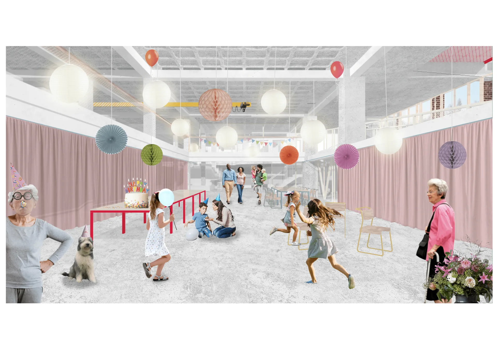 The site is located at the back end of John Lewis in Kingston. It is a building that offers a framework to change a behaviour that is currently fuelled by consumerism. Kingston is an example of a town that was a retail heaven in the 90s, but now is reflecting societal change and the decline of the high street – the current pandemic speeding up this process. With many vacant shop units, it leaves an imprint on how much consumerism has become part of our life. By understanding the local and socio-economical context, the Multihall caters for social inclusion and strengthening the community. Spaces like these will help people to change their mindset, rewiring a belief system that has been trained to consume.