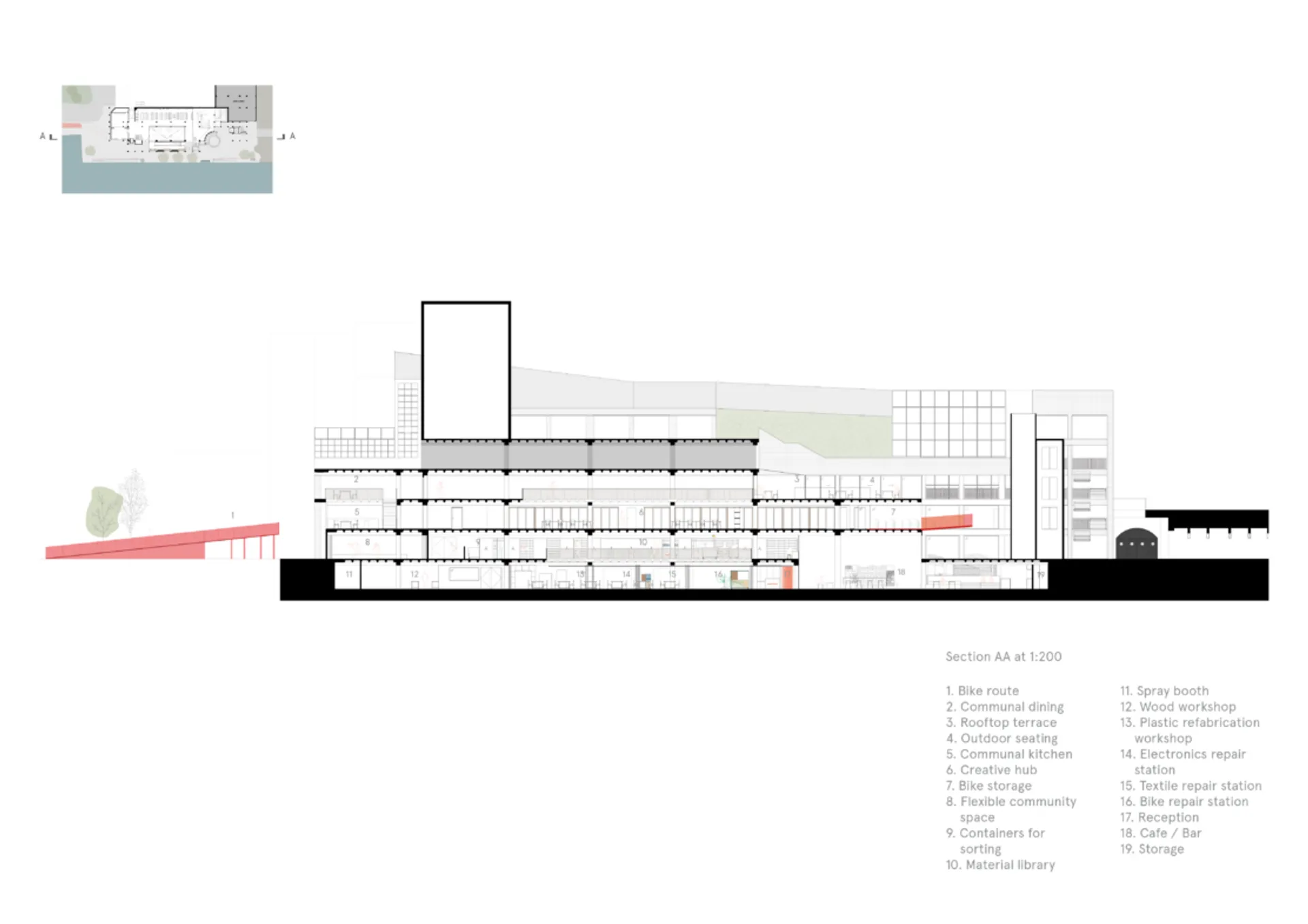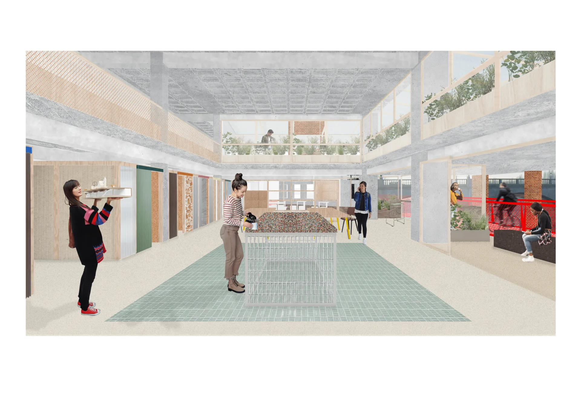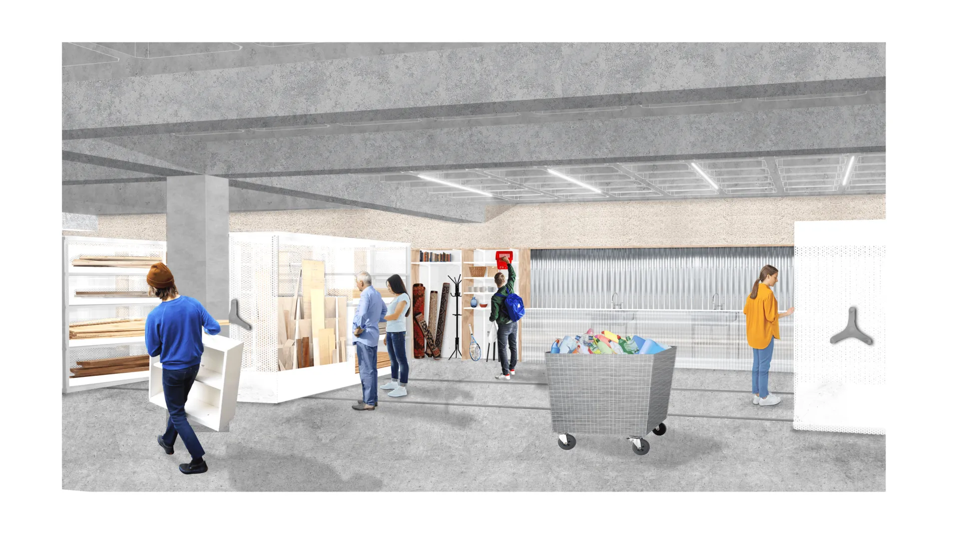 On the ground floor are a material library and flexible community spaces. The material library is for materials from nearby construction sites, empty shop units, materials from the public that are collected and can be reused in the workshop. This is opening up a discussion of how implementing facilities that encourage a circular economy can inspire people to become more sustainable, claiming back their right to repair.