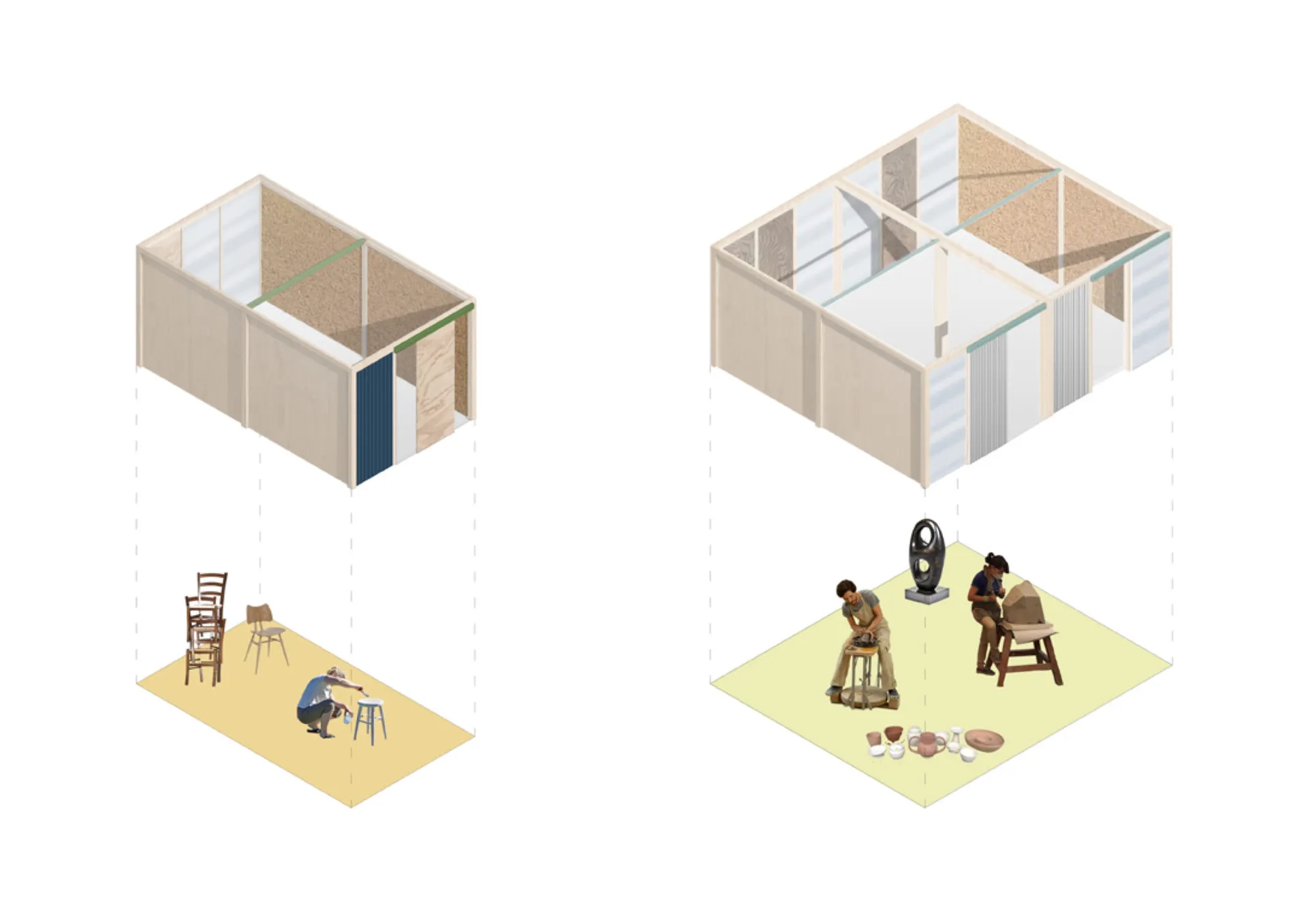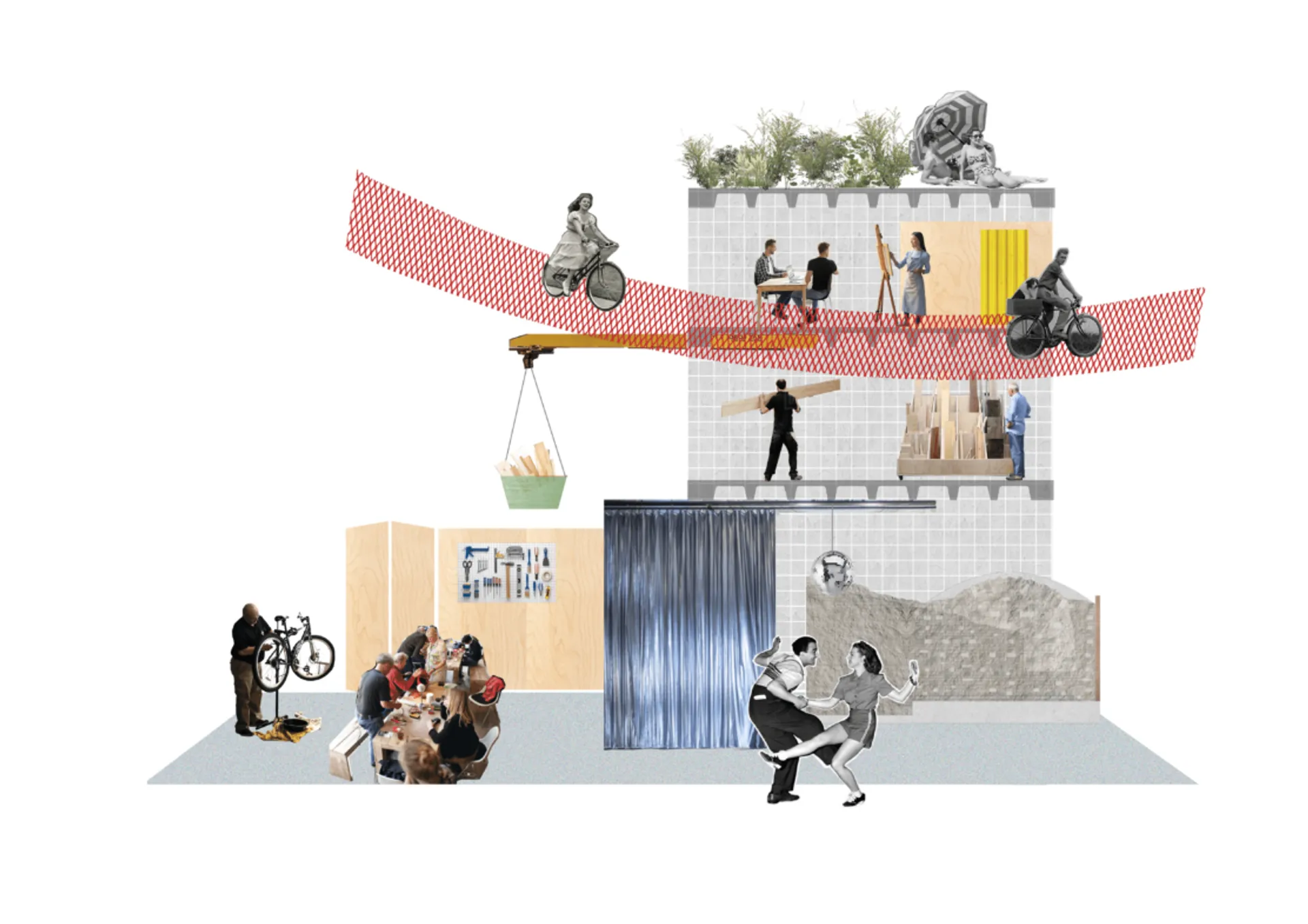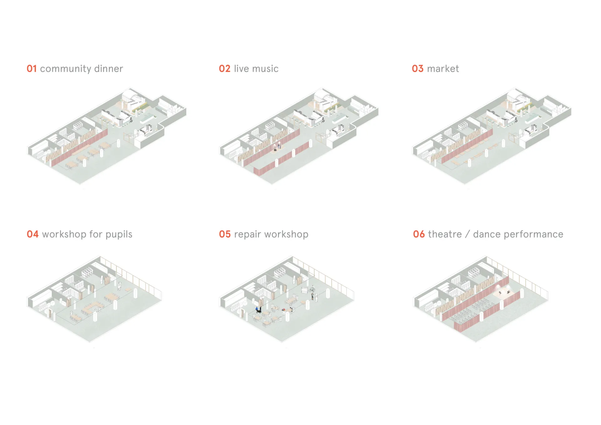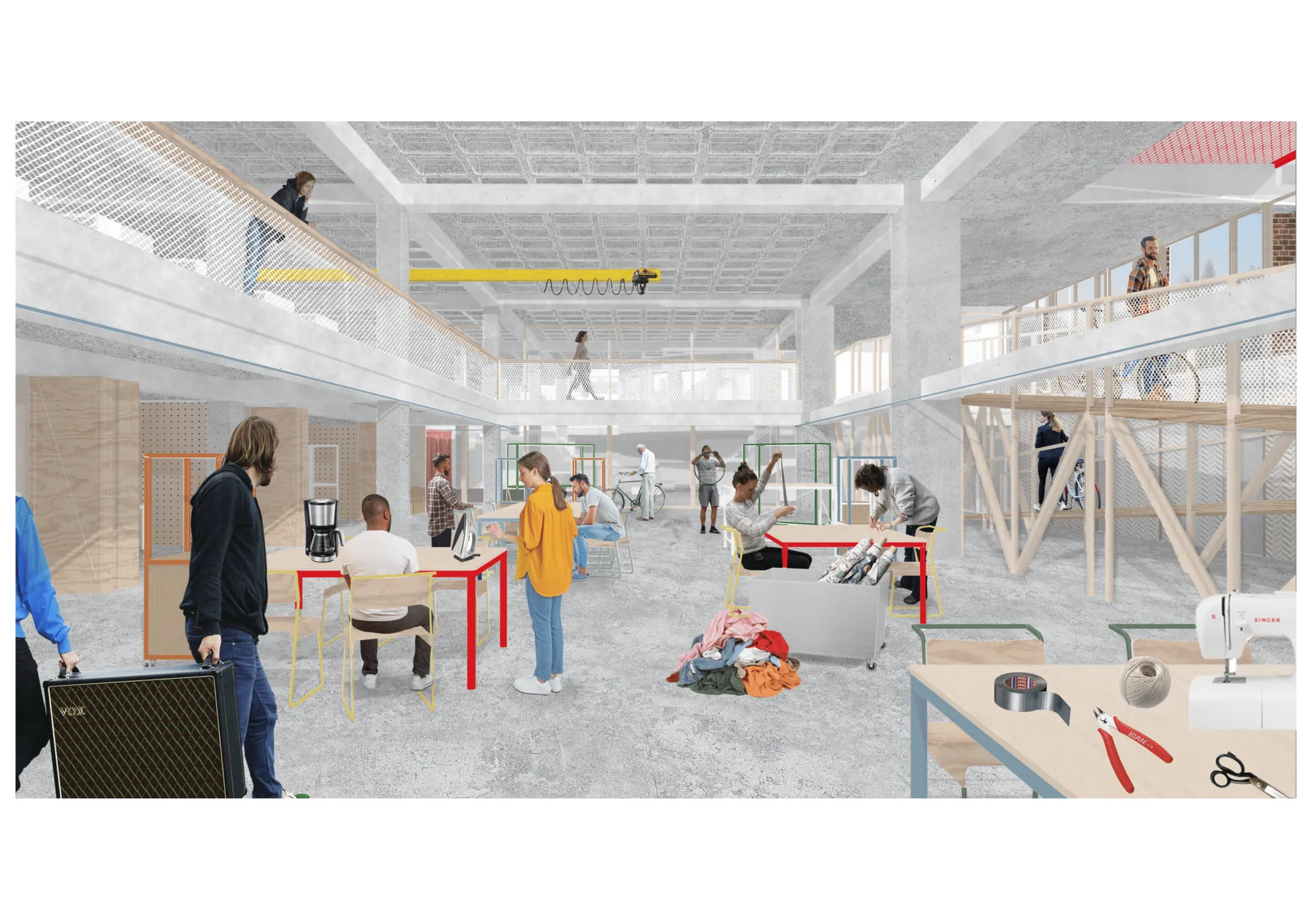 On the ground floor are a material library and flexible community spaces. The material library is for materials from nearby construction sites, empty shop units, materials from the public that are collected and can be reused in the workshop. This is opening up a discussion of how implementing facilities that encourage a circular economy can inspire people to become more sustainable, claiming back their right to repair.