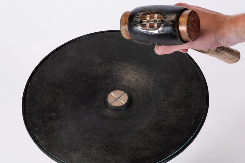 From wedge tests to prototyping several sheet steel side tables, each time adjusting the steel wedge’s depth, thickness and form until a secure joint was achieved. As a result, two crossed steel wedges are hydraulically pressed into the tables ash ‘handle’ at either end, forcing the wood to wedge against the hole located in the top and base. The cast iron’s convex shape is revealed on the top of the table, drawing the audience’s eyes towards the joining detail, viewed through glass like an artefact on display.