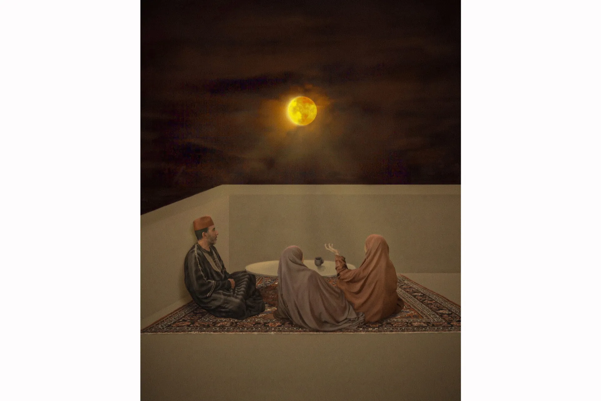 My work is an exploration of the use of fabric, gesture and objects in attempt to express the relationship between my religious, western and Moroccan culture influence. I made the decision to design and sew patterned pieces in order to connect with traditional Moroccan women working methods. My mother participated in this process which enabled her to share her knowledge and experience in this field. My father and I participated in other activities which enabled us to communicate. I became more interested in documenting this process as opposed to the finished outcomes. Moreover, being a London based student that was born in Spain and of Moroccan heritage, my work is heavily influenced by the process in which we claim our surrounding spaces in attempt to make them feel closer to home. I merged my textile skills alongside the use of ethnic household items and materials that form part of my identity into my photography. Capturing the indoor private scene with a camera proved to be quite invasive and uncomfortable for my family. I wanted to explore how much I can push this documentation process considering the sensitivity of the matter and respecting ones privacy. Whilst also being a Muslim woman and what that means when we put our stories out to the world. Is there a gaze that I should be conscious of and can I rectify it?