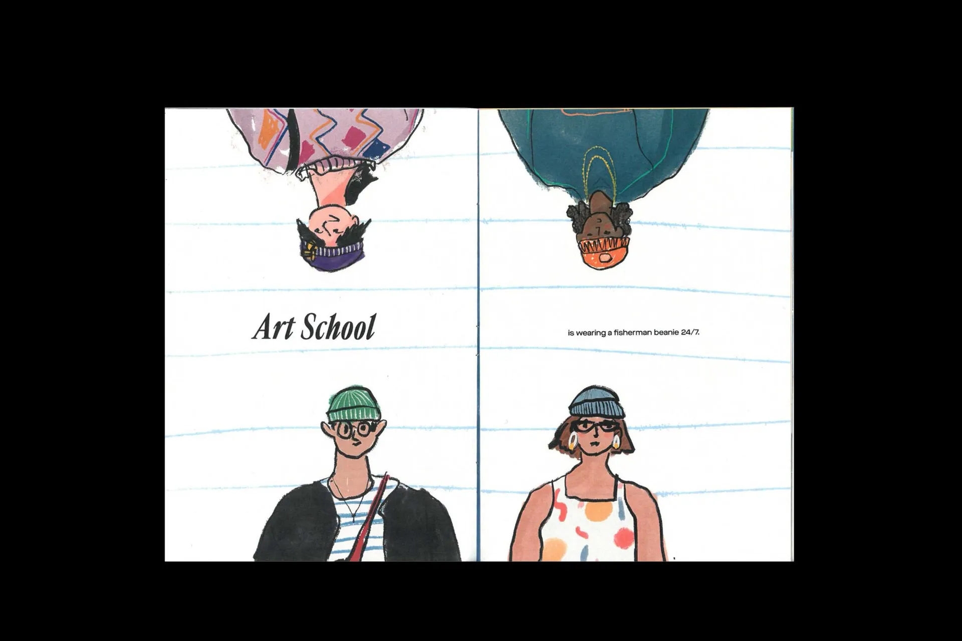 A series of zines that although vary in differences, all fall under the overarching umbrella of social commentary with a light-hearted approach and attempted humour. The study of our culture, institutes, and the media. It provides the audience a catalyst for conversation, connection, and understanding within our worlds.