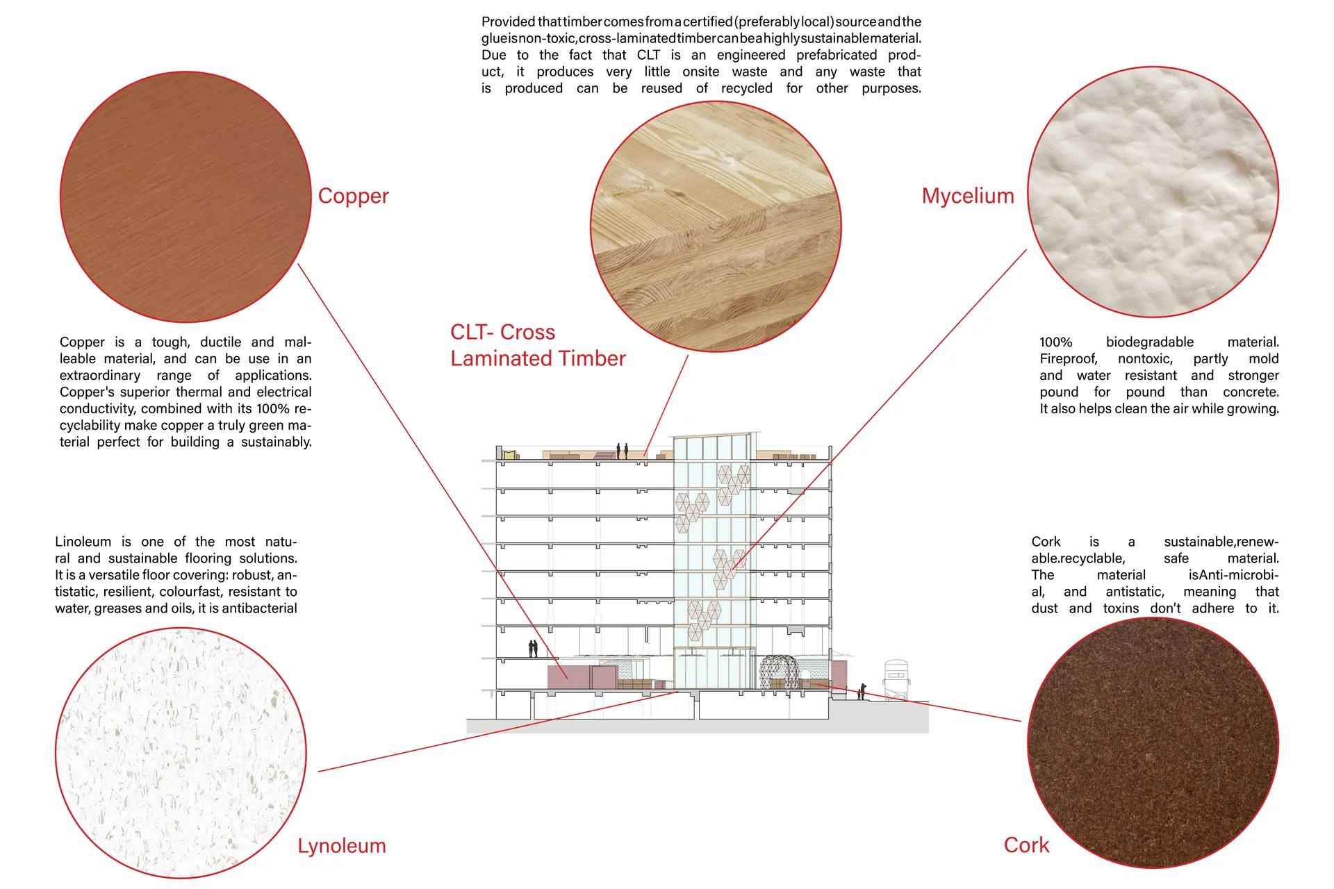 The proposal highlights a reflection on how brands could use their voice to exploit a circular system still not effectively use in terms of architecture, to create a space where sustainability is at the center of the design idea.
