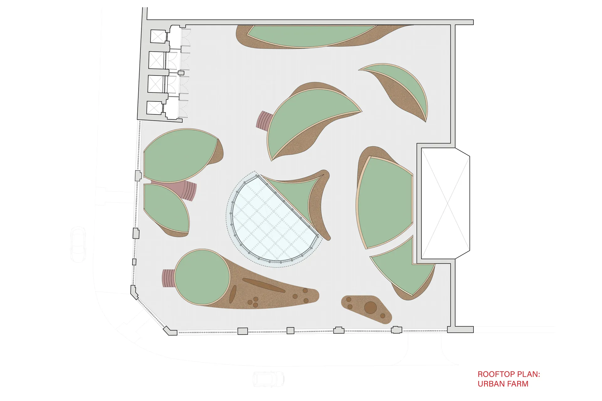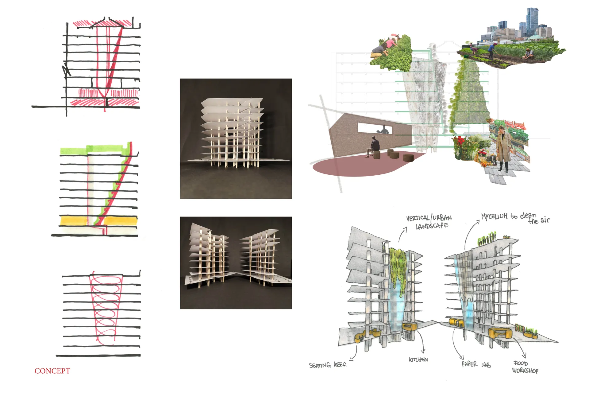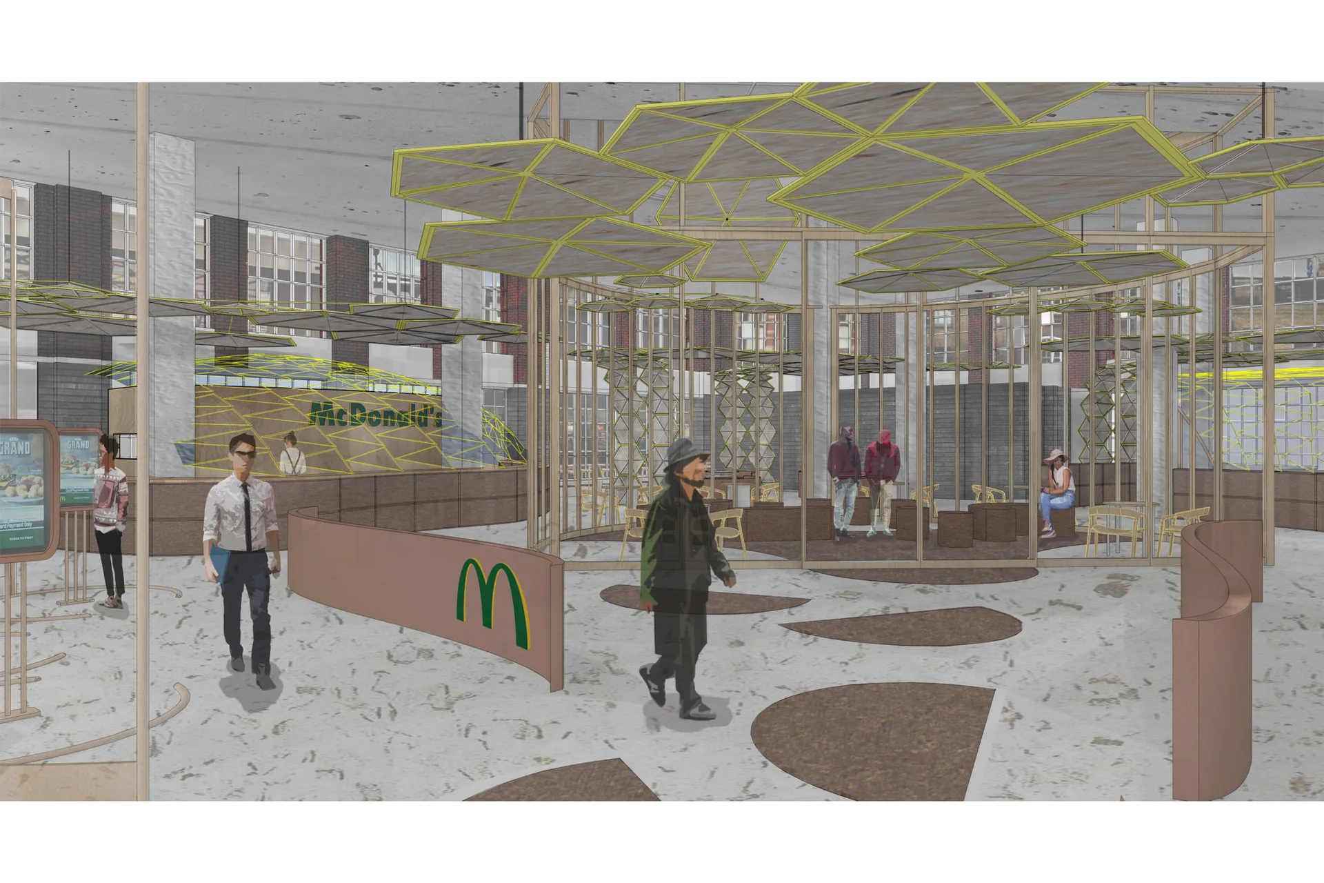 During the development, different concepts were taken in consideration to shape a new McDonald’s Slow Food Restaurant. The re-branding of the company was based on a Circular Economy loop where the brand connected with local businesses around Shoreditch to achieve a non-waste community space, and to be fully sustainable within the local area. The layout includes on the ground floor a fast-food area, a restaurant, a recycling paper lab and workshop, and a cooking workshop, while the rooftop is home to an urban farm which support the supplies for part of the restaurant menu.