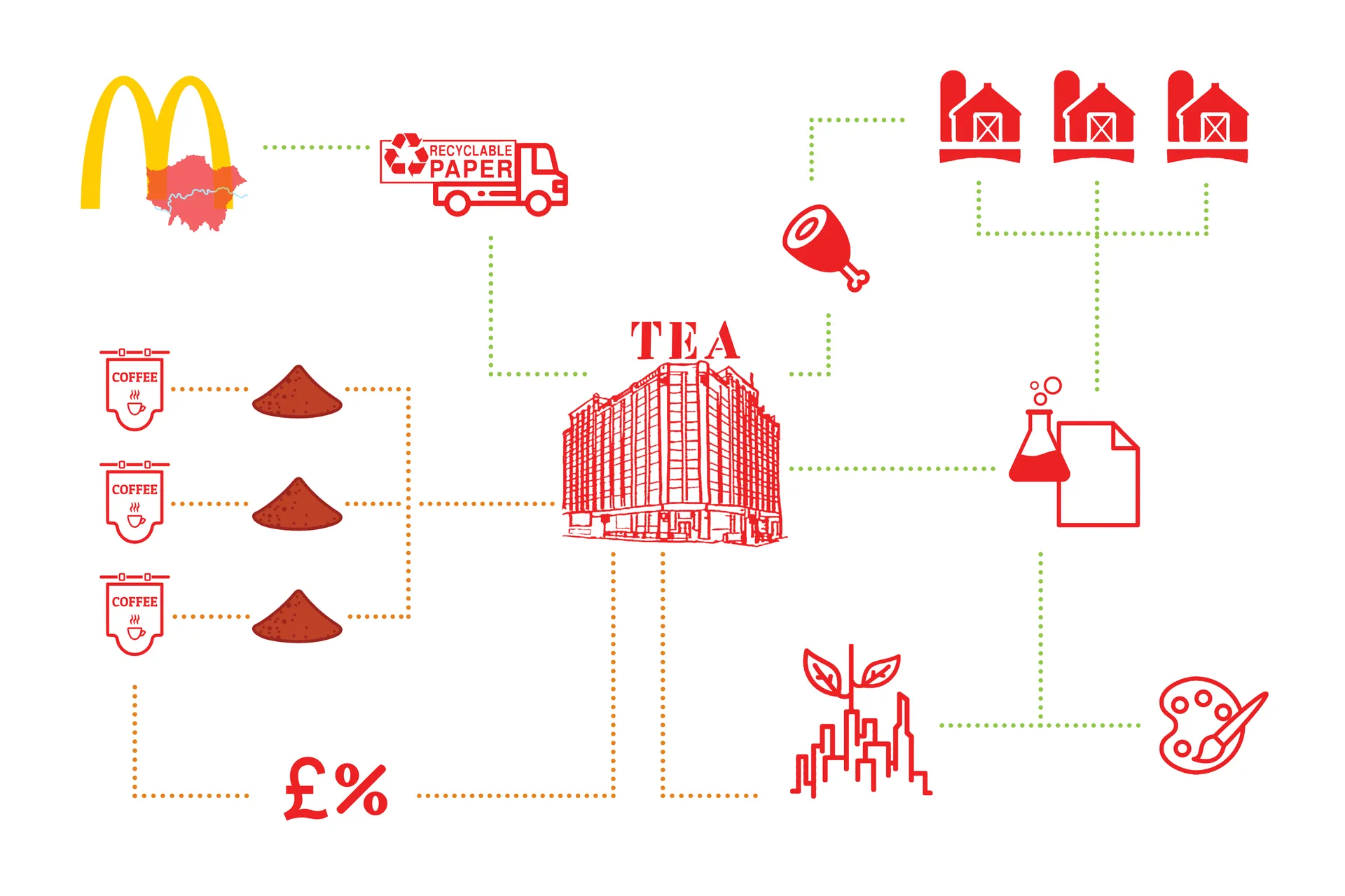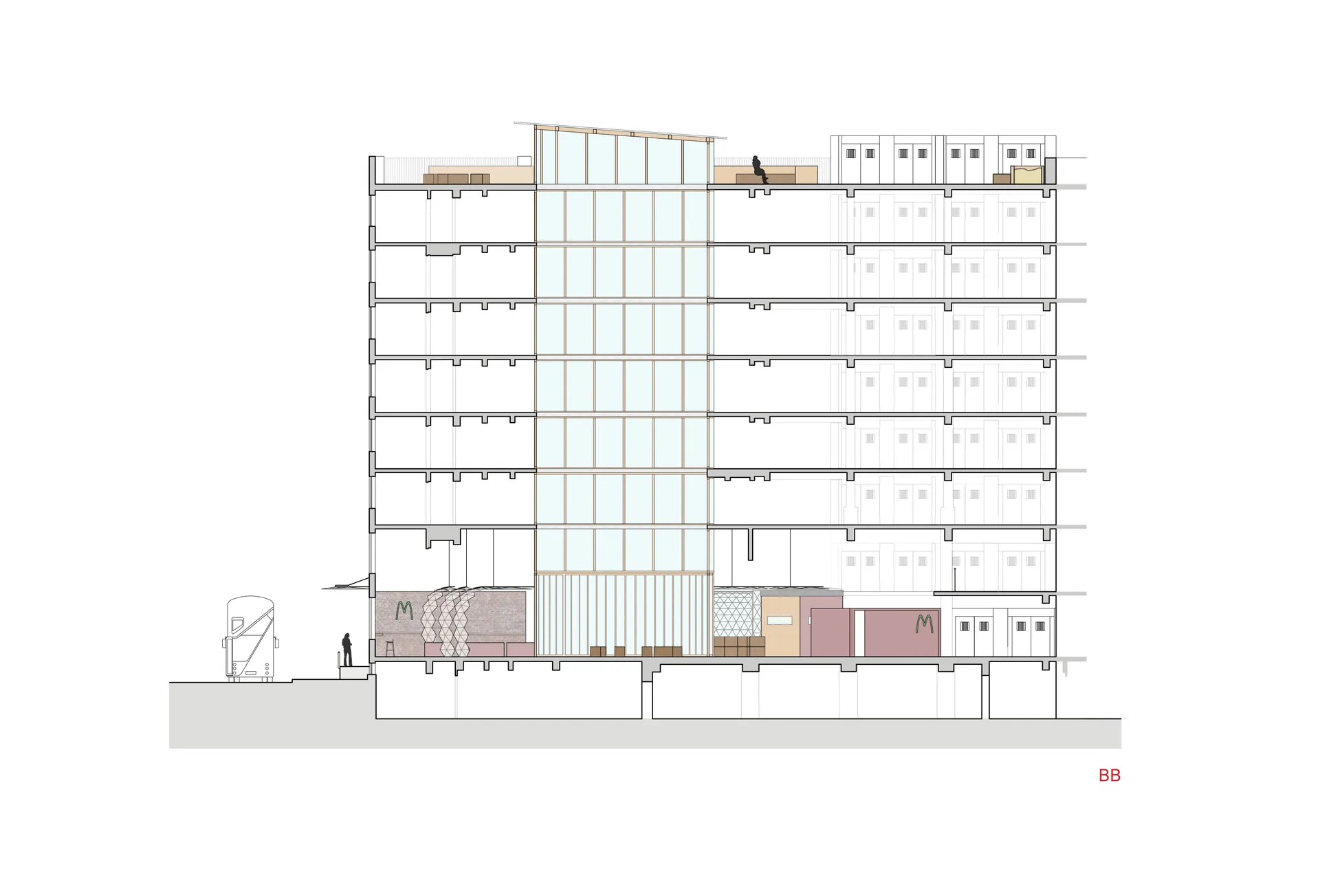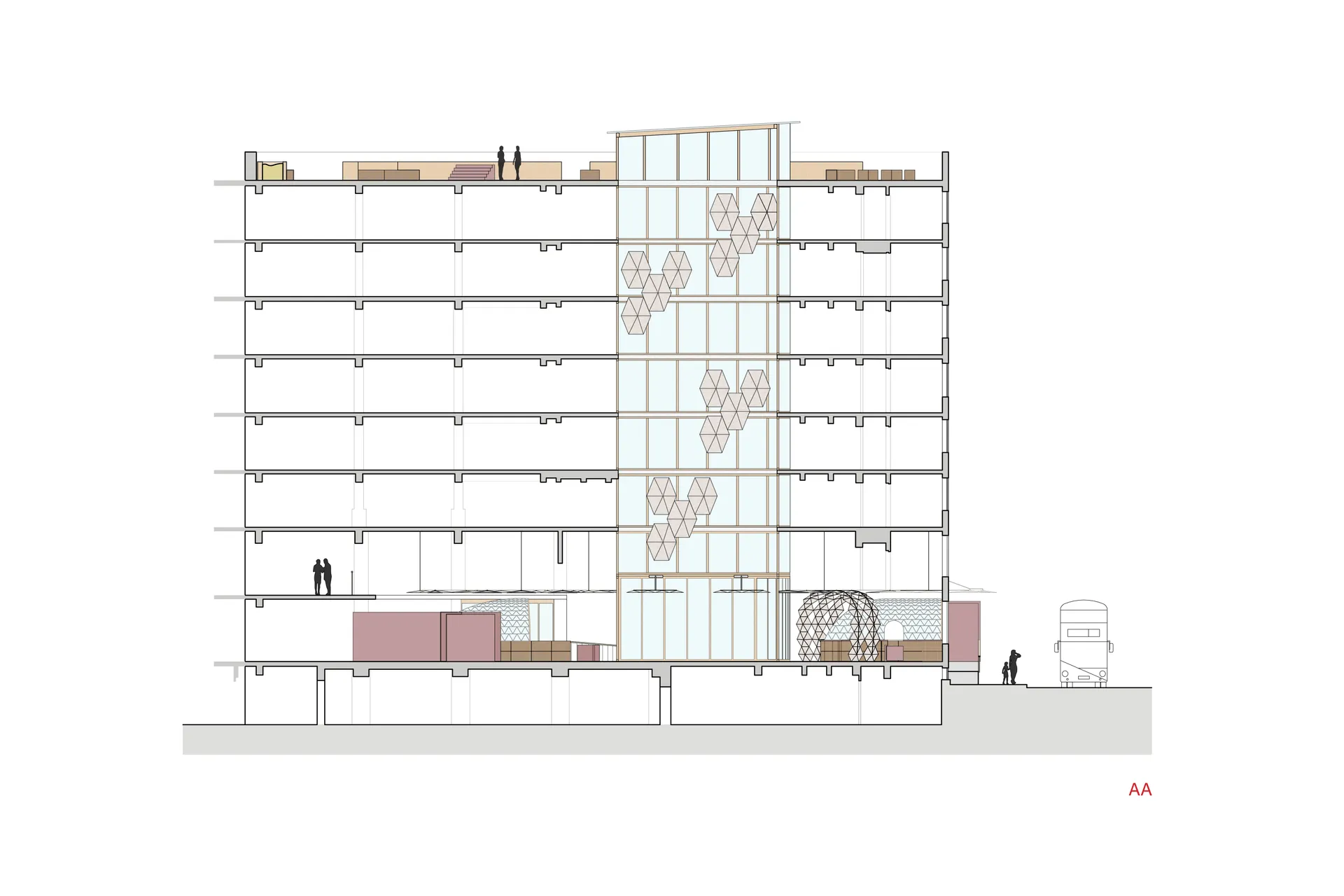 During the development, different concepts were taken in consideration to shape a new McDonald’s Slow Food Restaurant. The re-branding of the company was based on a Circular Economy loop where the brand connected with local businesses around Shoreditch to achieve a non-waste community space, and to be fully sustainable within the local area. The layout includes on the ground floor a fast-food area, a restaurant, a recycling paper lab and workshop, and a cooking workshop, while the rooftop is home to an urban farm which support the supplies for part of the restaurant menu.