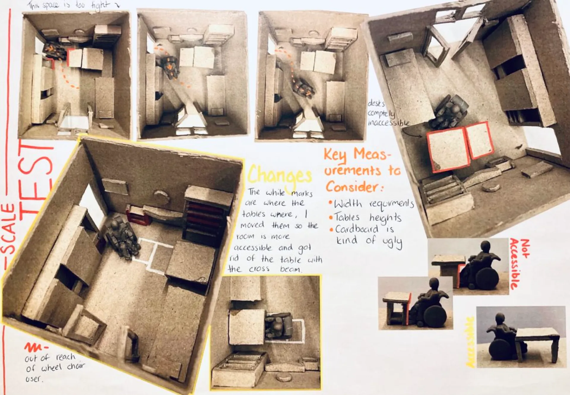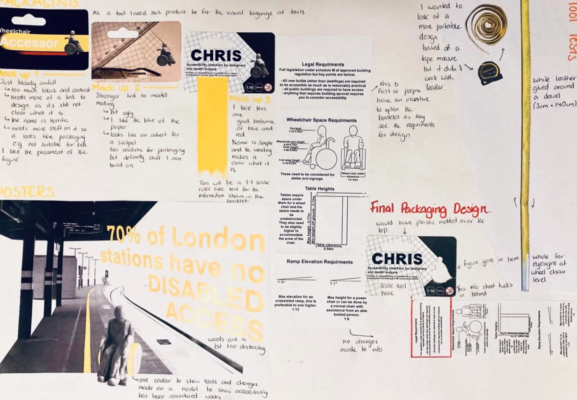 A tool to aid inclusive design, specifically for wheel chair users. Demonstrates the average proportions of a wheel chair user, ideal table height, eye level and the correct ramp elevations. Also includes a 1:50 scale figure of a wheel chair user for checking accessibility in a scale model.