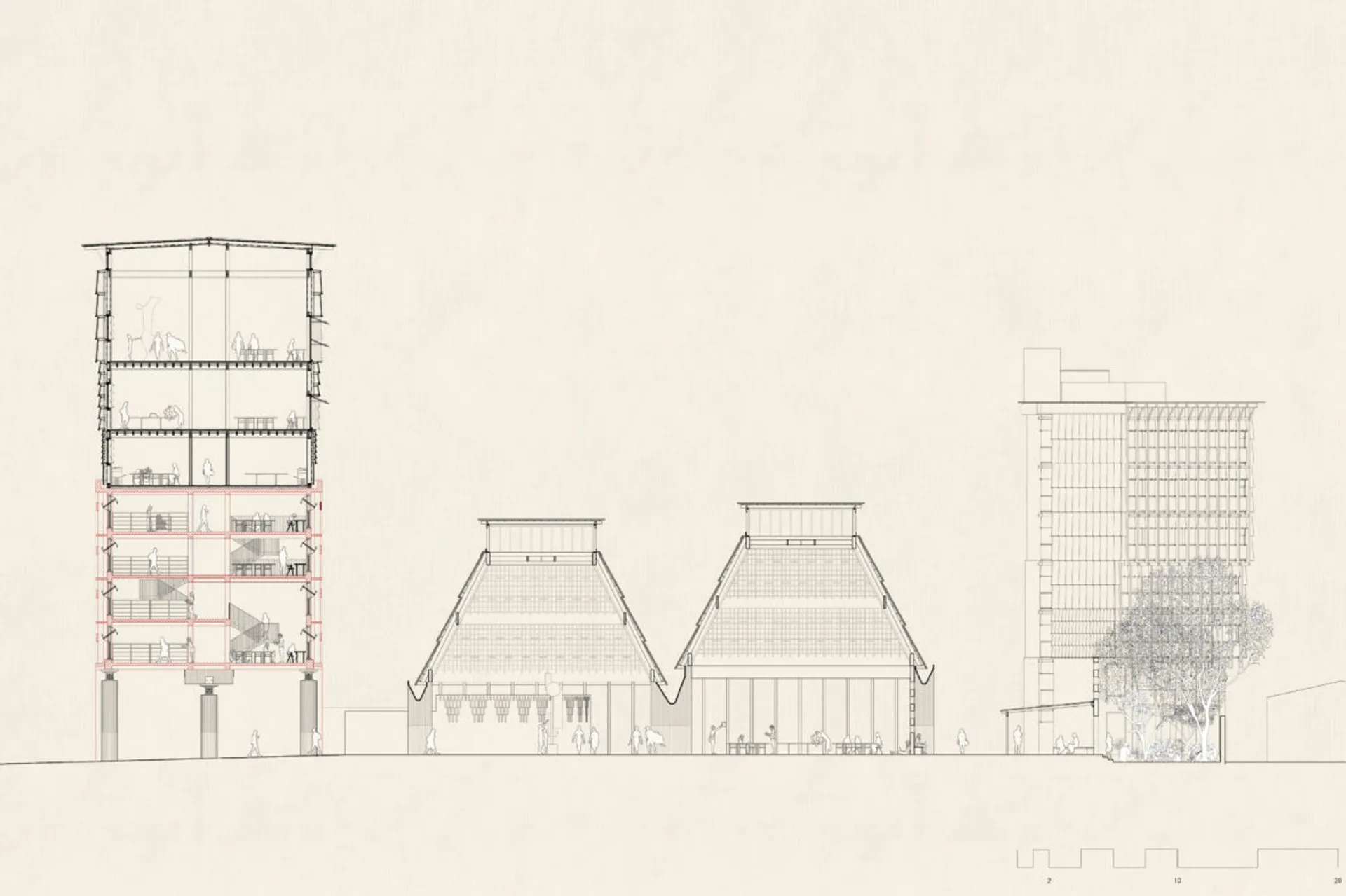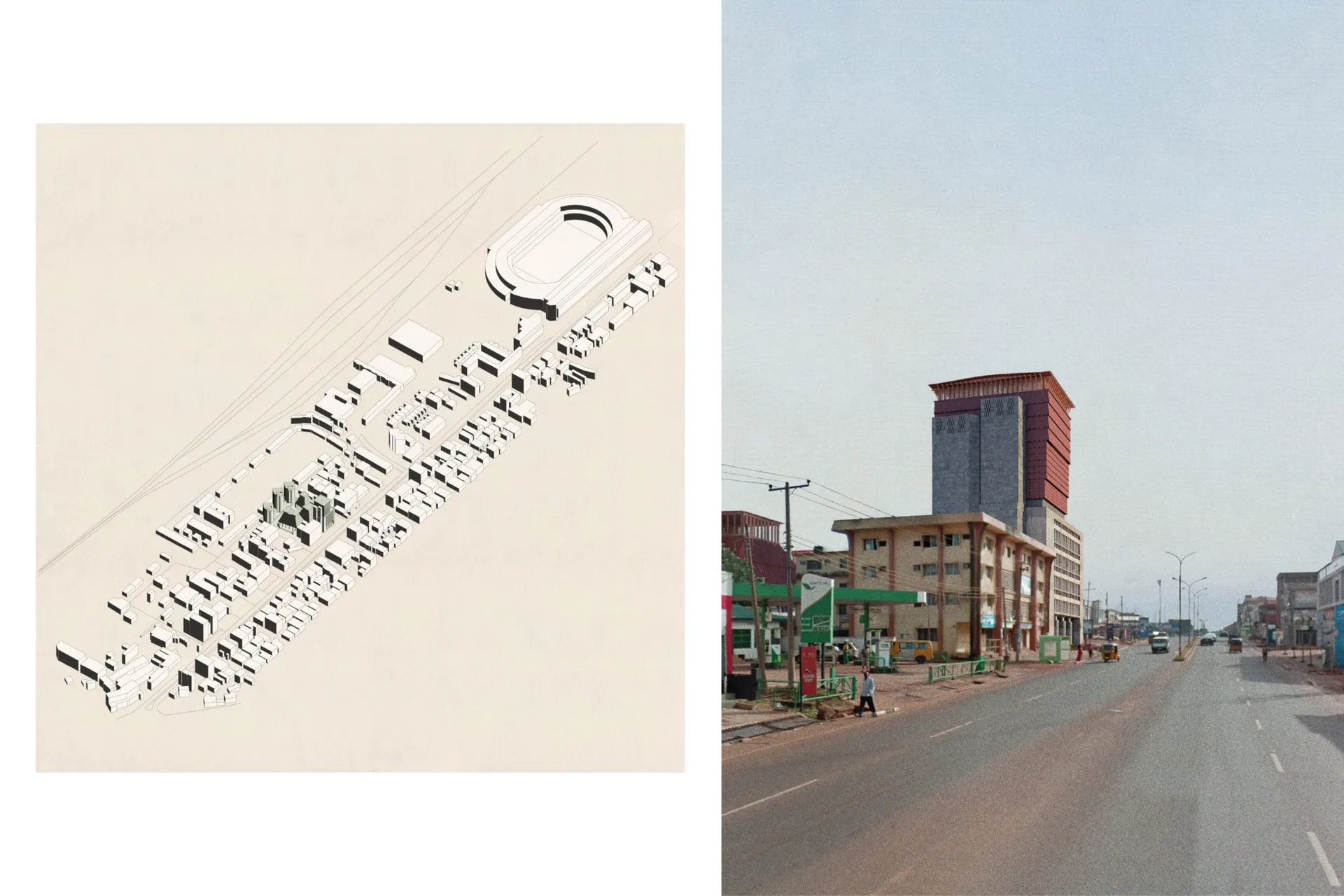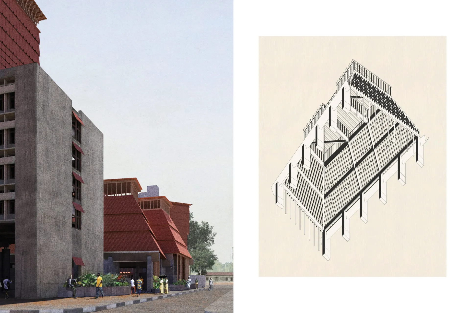 The architectural language of the project has explored ideas of textiles and of weaving in both an attitude towards space as well as towards the tectonics of the building fabric, an approach suited to the challenging climate of south eastern Nigeria. The final proposal sees the radical reuse of an existing 1960s tower, transformed into a new institution for the teaching of art in Enugu. Informed by both the pre-colonial palaces of Western Africa and the compound house typology specific to much of urban Africa, the school utilises low embodied carbon materials and employs a range of passive environmental strategies to construct a spatially fluid and environmentally sustainable institution that provides the infrastructure for a new form of cultural reproduction in Enugu, recalling the spirit of the post independence Mbari Artist and Writers Clubs of the 1960s.