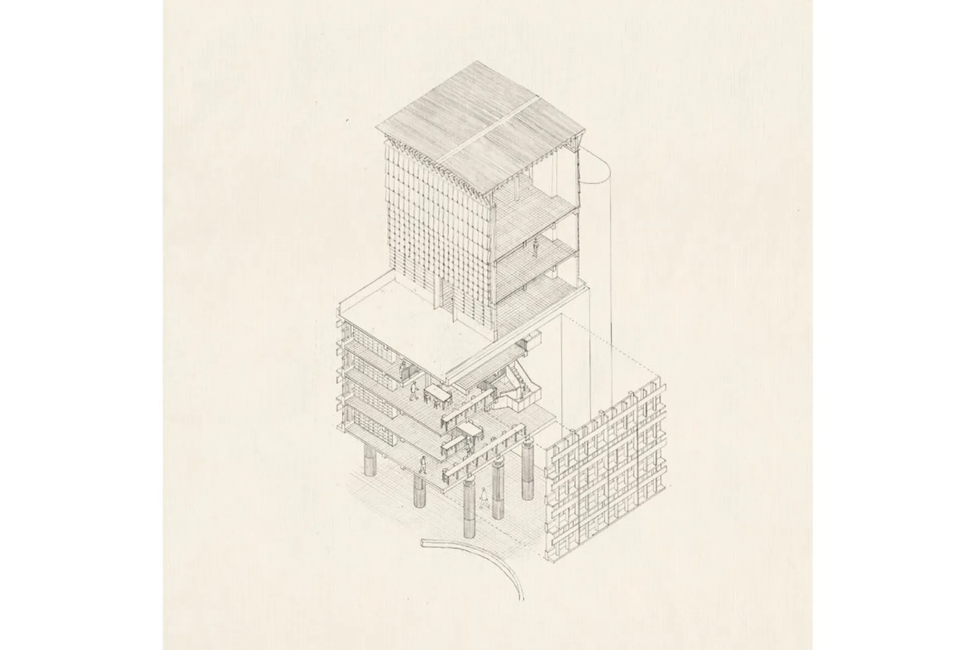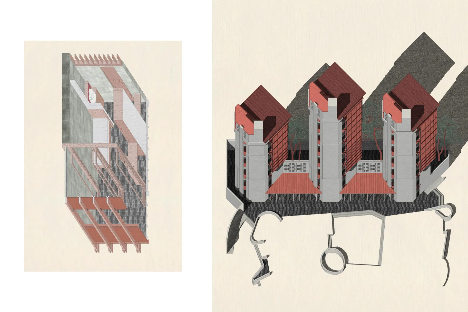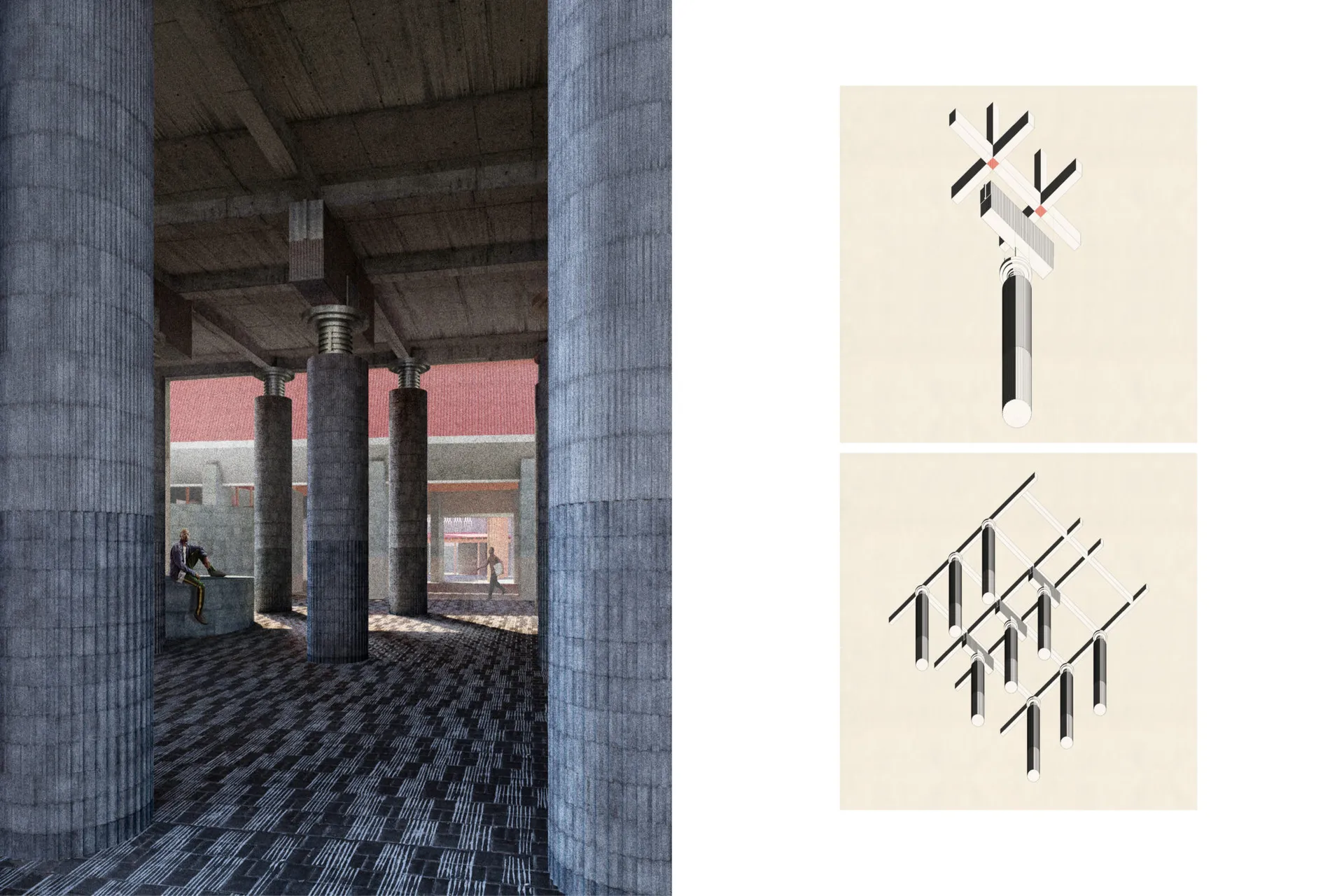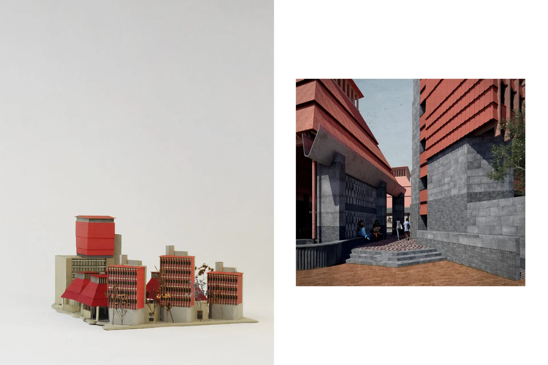 The architectural language of the project has explored ideas of textiles and of weaving in both an attitude towards space as well as towards the tectonics of the building fabric, an approach suited to the challenging climate of south eastern Nigeria. The final proposal sees the radical reuse of an existing 1960s tower, transformed into a new institution for the teaching of art in Enugu. Informed by both the pre-colonial palaces of Western Africa and the compound house typology specific to much of urban Africa, the school utilises low embodied carbon materials and employs a range of passive environmental strategies to construct a spatially fluid and environmentally sustainable institution that provides the infrastructure for a new form of cultural reproduction in Enugu, recalling the spirit of the post independence Mbari Artist and Writers Clubs of the 1960s.