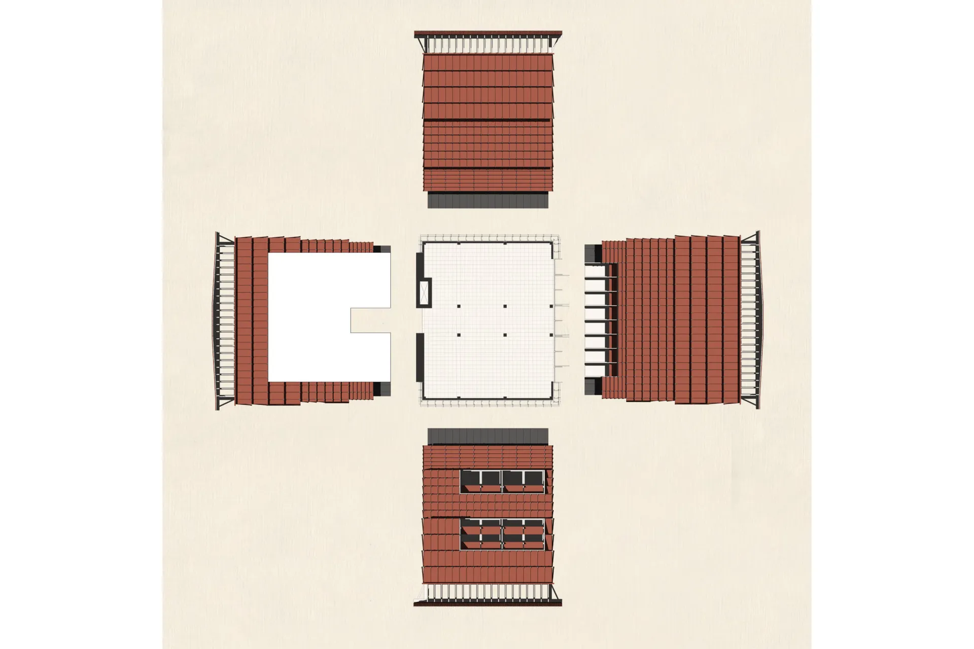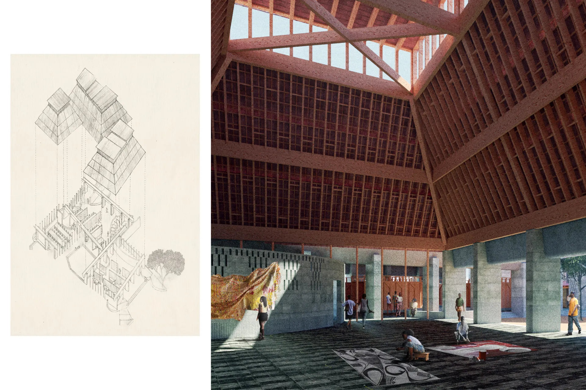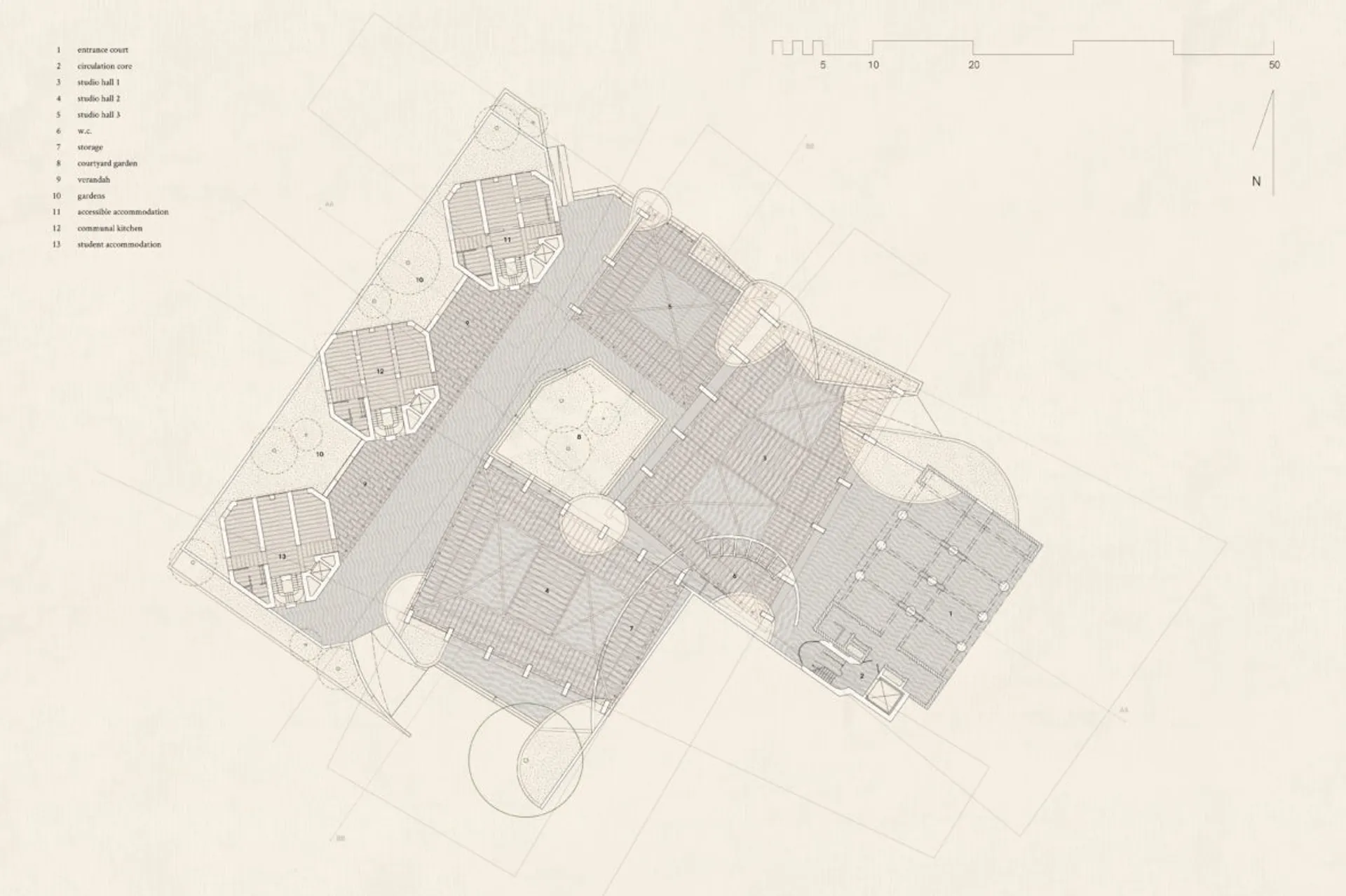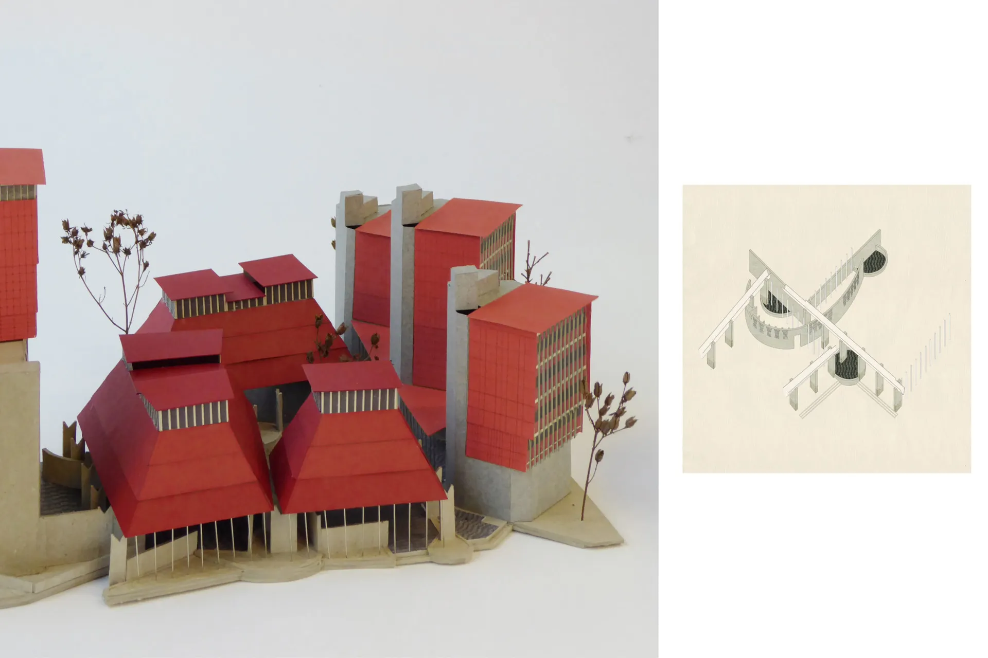The brief for this project has been developed from readings of fiction – specifically that of Purple Hibiscus by Chimimanda Ngozi Adichie. The novel, set in post-colonial Enugu in Nigeria, tells the story of a country afflicted by various hierarchical structures of power, such as those of tradition, the church, the political sphere or the family unit. The inherent tension between tradition and modernity is explicated with the protagonist, Kambili, finally finding liberation from her complex childhood in the progressive household of her auntie. The project, set in an imagined future on from the book, sees characters of the story establish a non-hierarchical institution for the teaching of creative disciplines in Enugu.