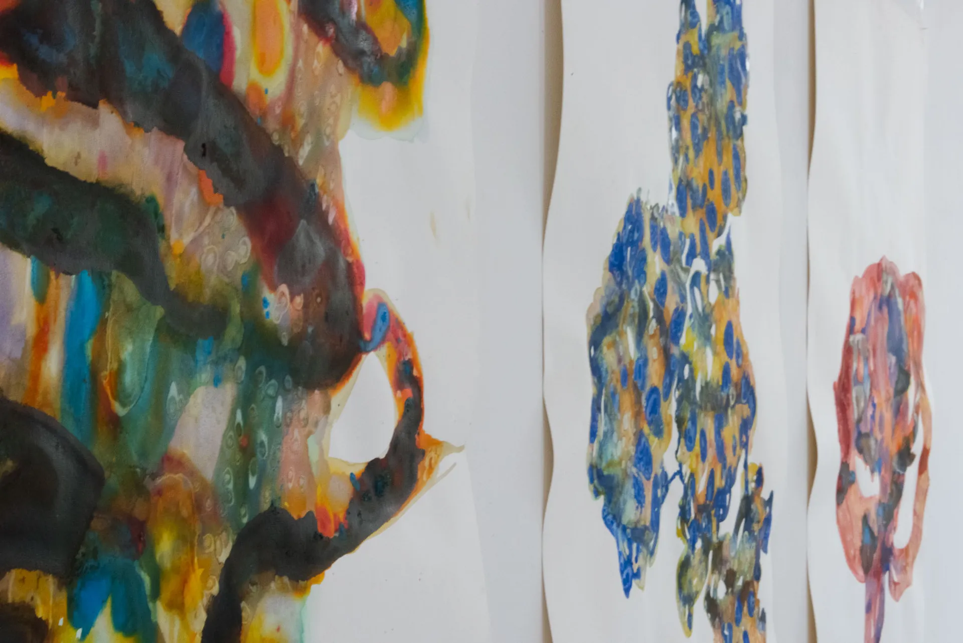 She often uses watercolour, inks, acrylic and large scale paper combined with large movements of her body to create marks and shapes on the paper that unwittingly refer to shapes that exist in the real world. Gabriela refers to these marks and forms on paper as a link to her ritualistic and spiritual side that goes back to her ancestry and personal experiences.