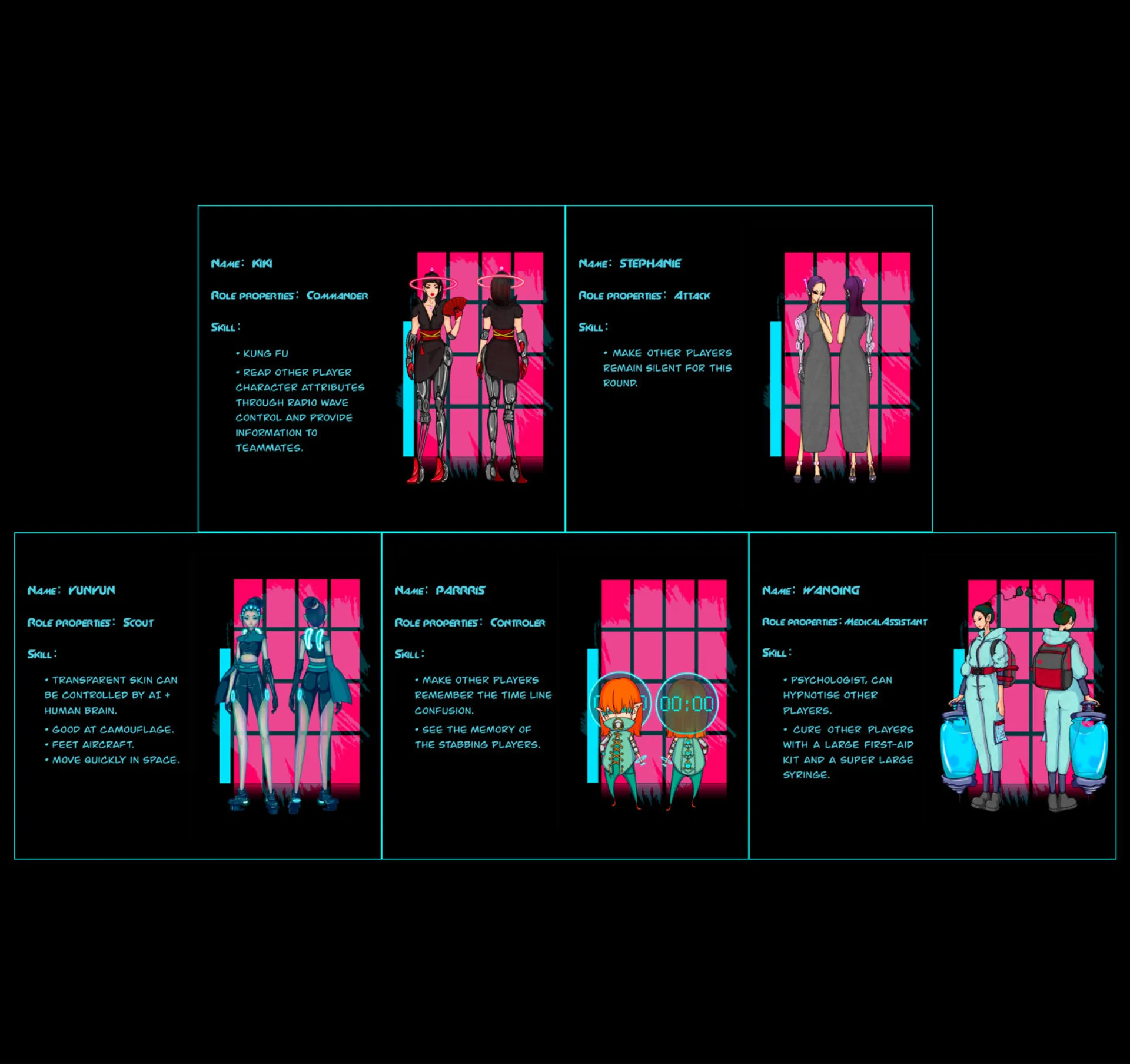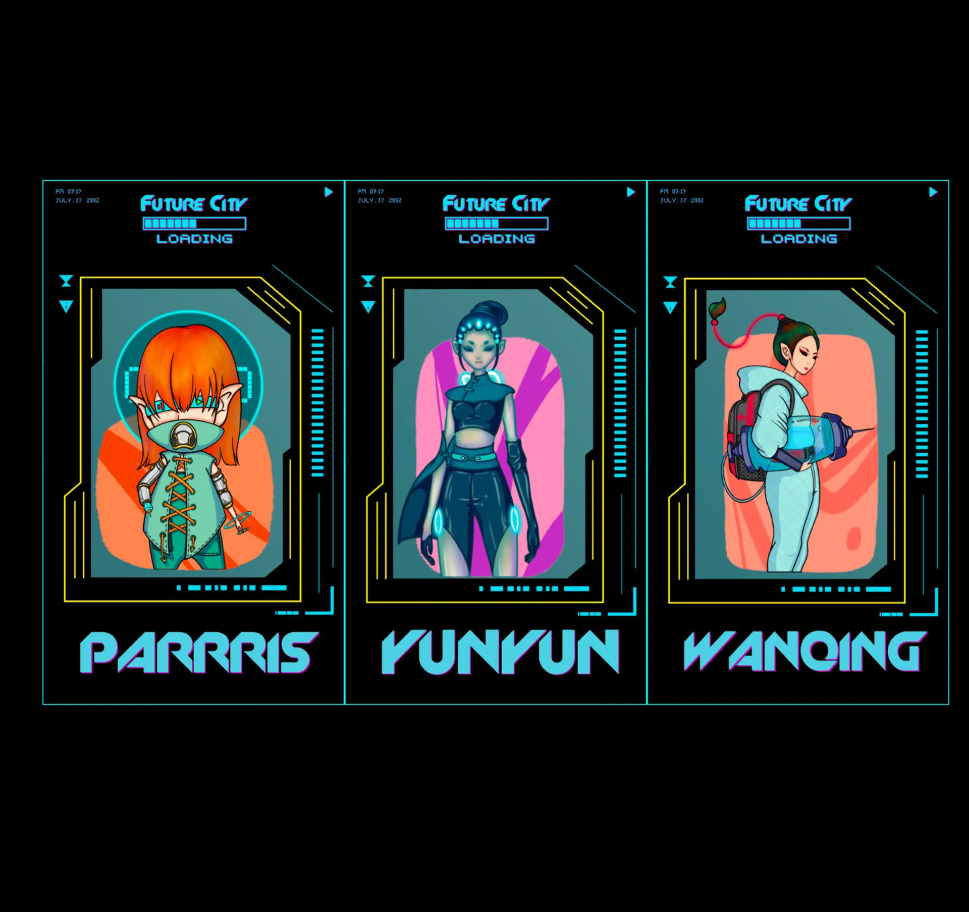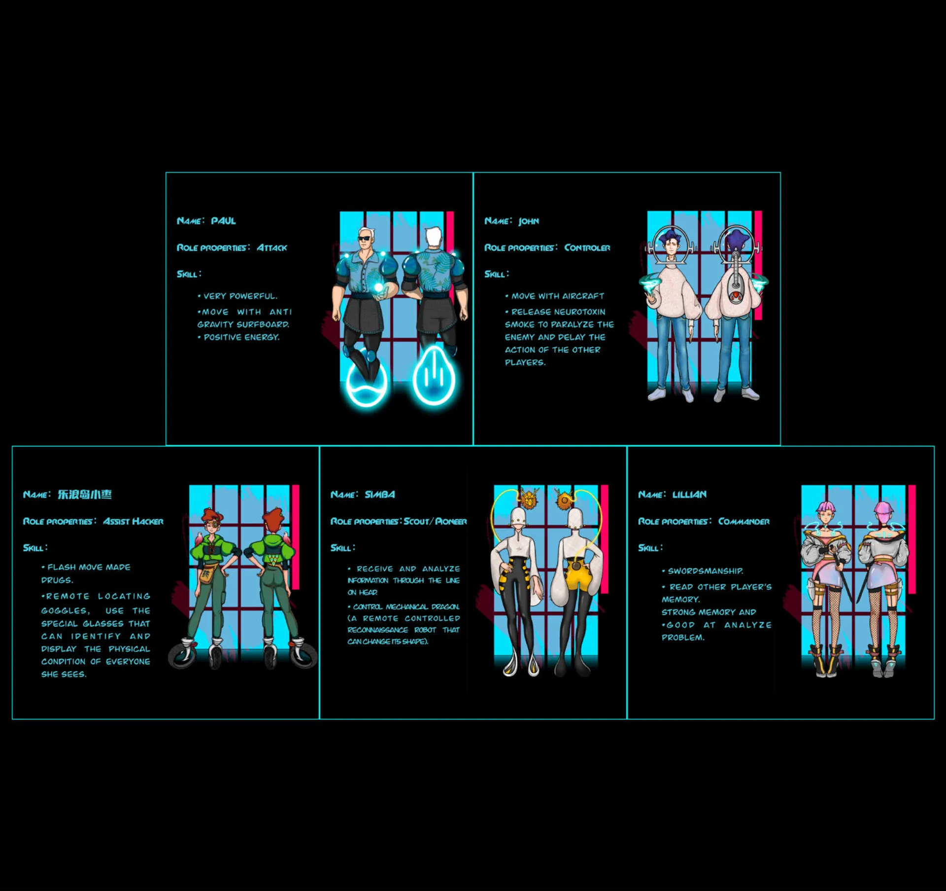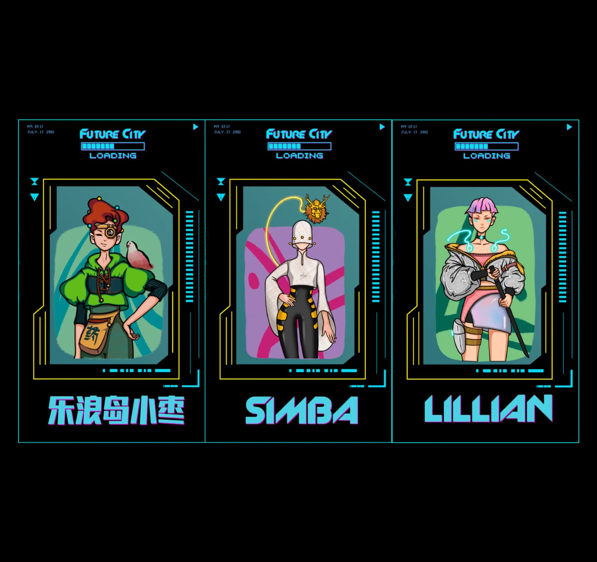 Considering the impact of COVID-19 on people’s entertainment, the characters were designed based on traditional board games. Enhancing the visual impact brings a deeper sense of game experience and participation and will, attract more people to online apps. In the plot of role-playing board games, characters search for clues, solve puzzles, search of justice and truth. To keep the characters aligned to the future city setting, functional wind, Chinese elements and animal personification were integrated into the body, equipment and material design of different characters. Through this group of characters, the project shows how modern young people think about themselves, how they think about the times, and how they create change.