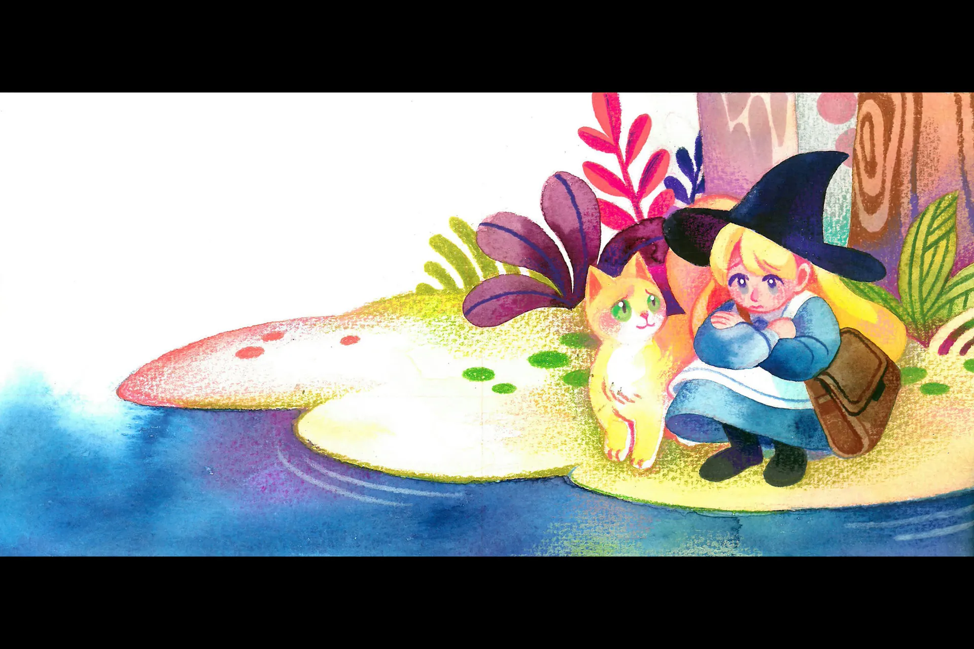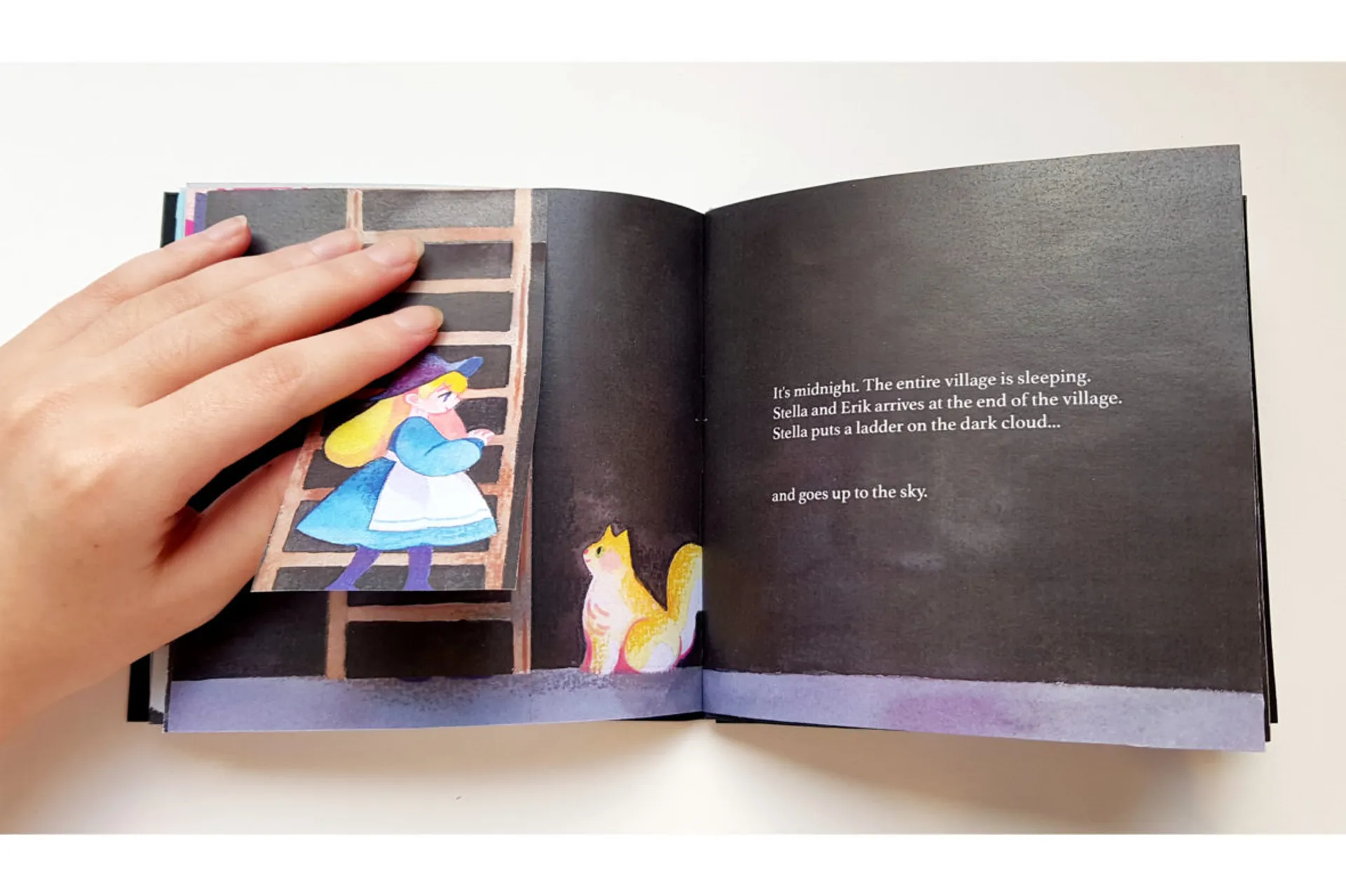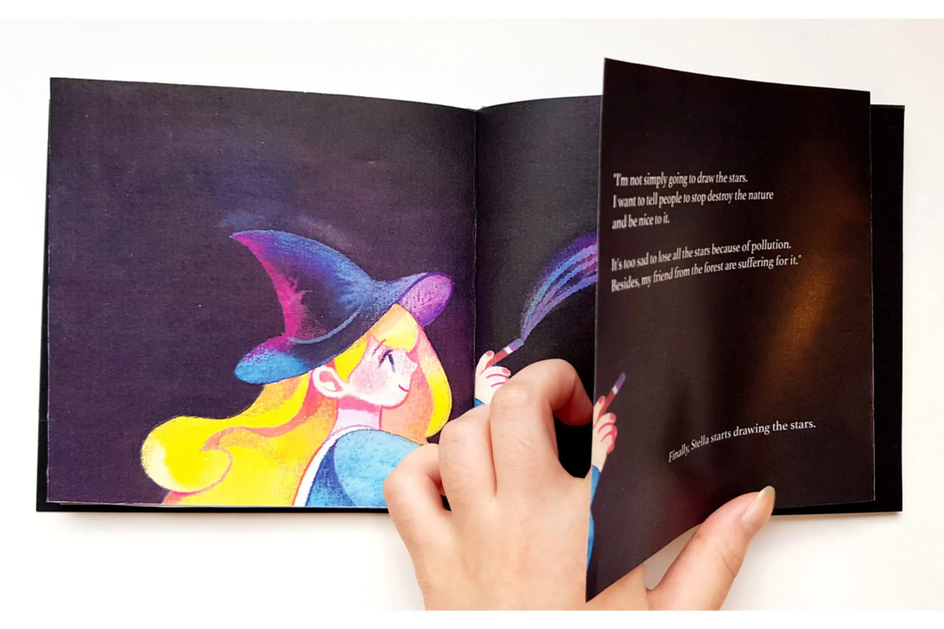 “The Starry Night” is a short illustrated book about a journey by a little witch, Stella. Due to the severe pollution in the village, no stars can be seen in the night. Stella decides to draw her own starry night sky, however, she needs a magical paint for it. So Stella takes a step into the very last forest in order to collect ingredients. Thanks to the magical creatures, Stella could obtain all the ingredients… and learn their sad backstories. Stella recognises that the creatures were suffered from people’s egoism. Perhaps Stella could show people beautiful stars for once, real stars would never shine again unless people change their attitudes. Hence, Stella draws a constellation of magical creatures and people, wishing people could understand the importance of nature.
