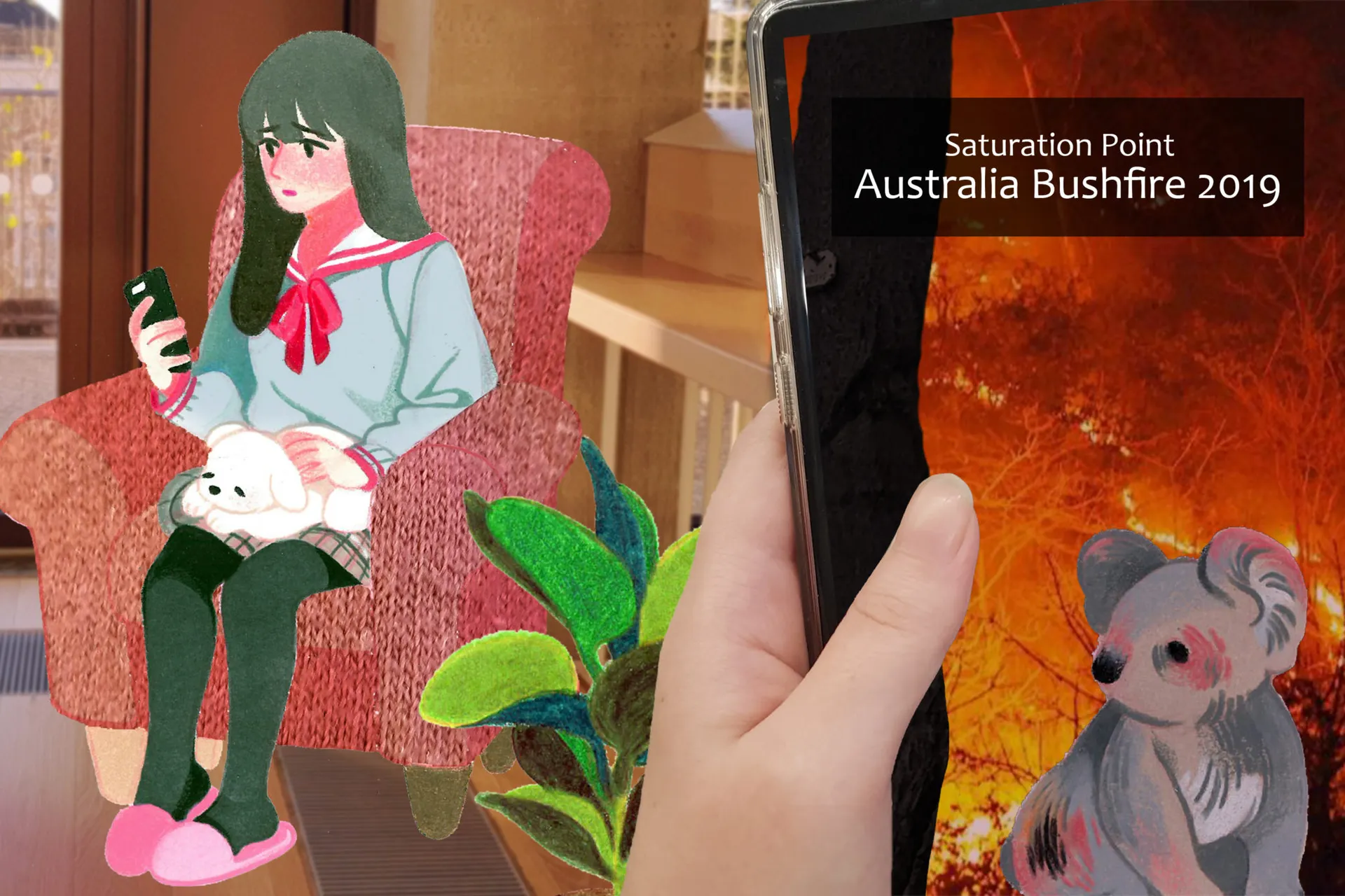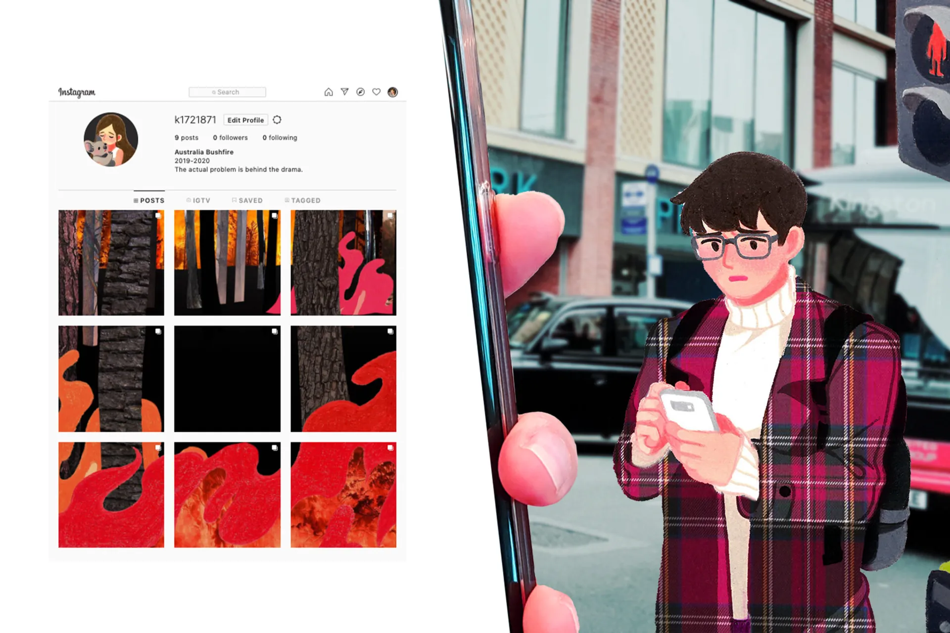Untold Tales and Saturation Point are two projects which I applied the new theme. Both of them are about real life situation: Jesa, the Korean traditional practice to commemorate ancestors, and Australia bushfire crisis occurred in summer 2019 respectively. I especially focused on format for the Saturation Point; despite being a tragic disaster, it is less highlighted because of COVID. So I used Instagram to grab attentions from young generation. At the first glance, only an image of burning forest can be seen in the feed. However, by click-and-slide, the viewer can see more illustrations “behind the drama”. My intention in such composition is to expand people’s interest to situation after the dramatic crisis so that more hand of help can be reached.