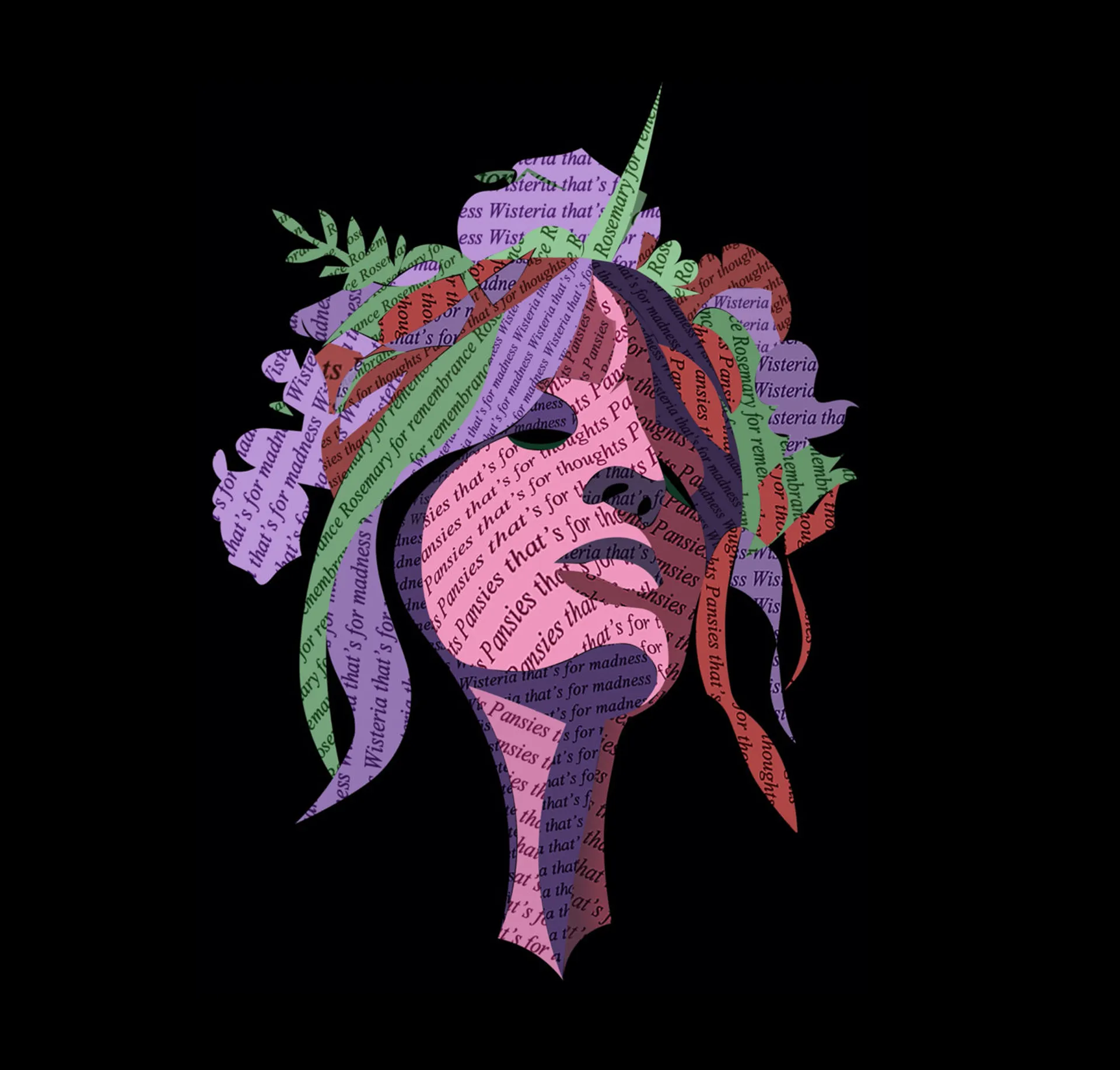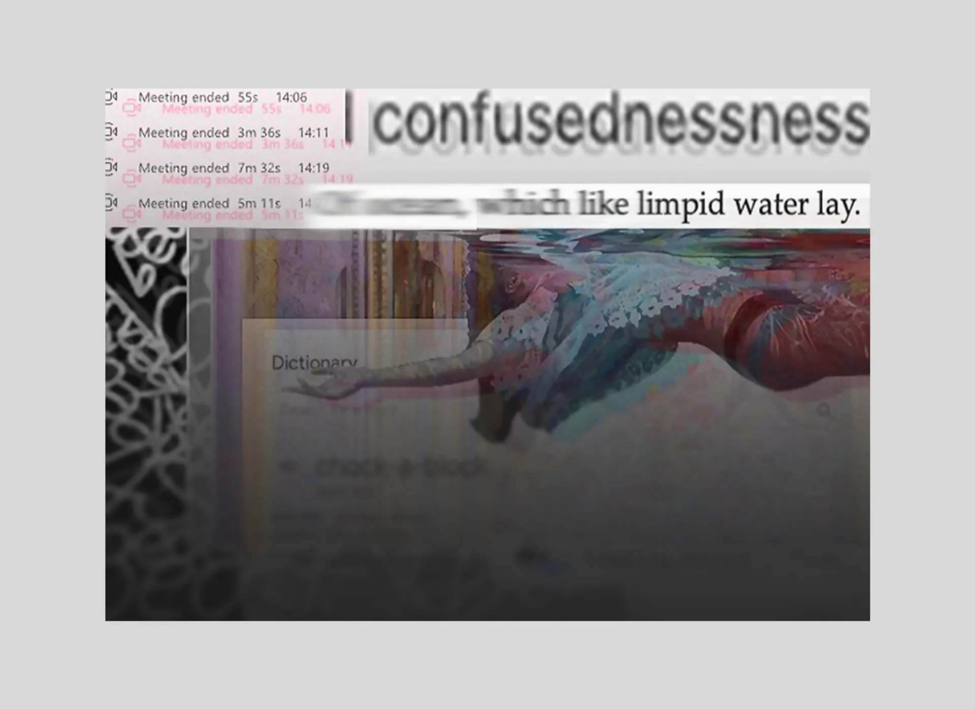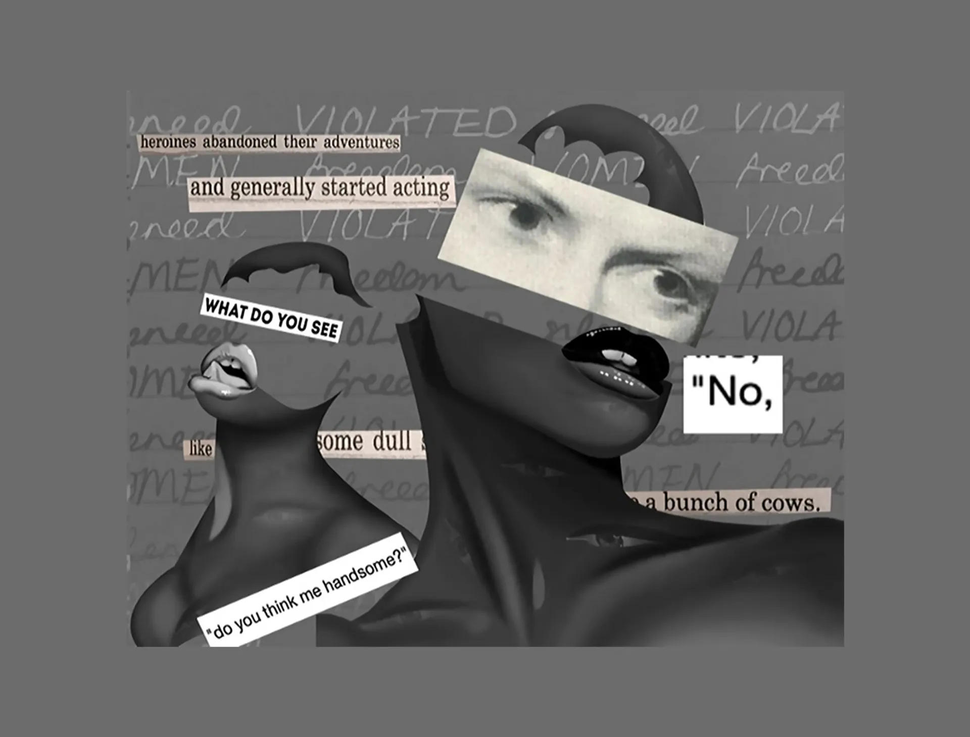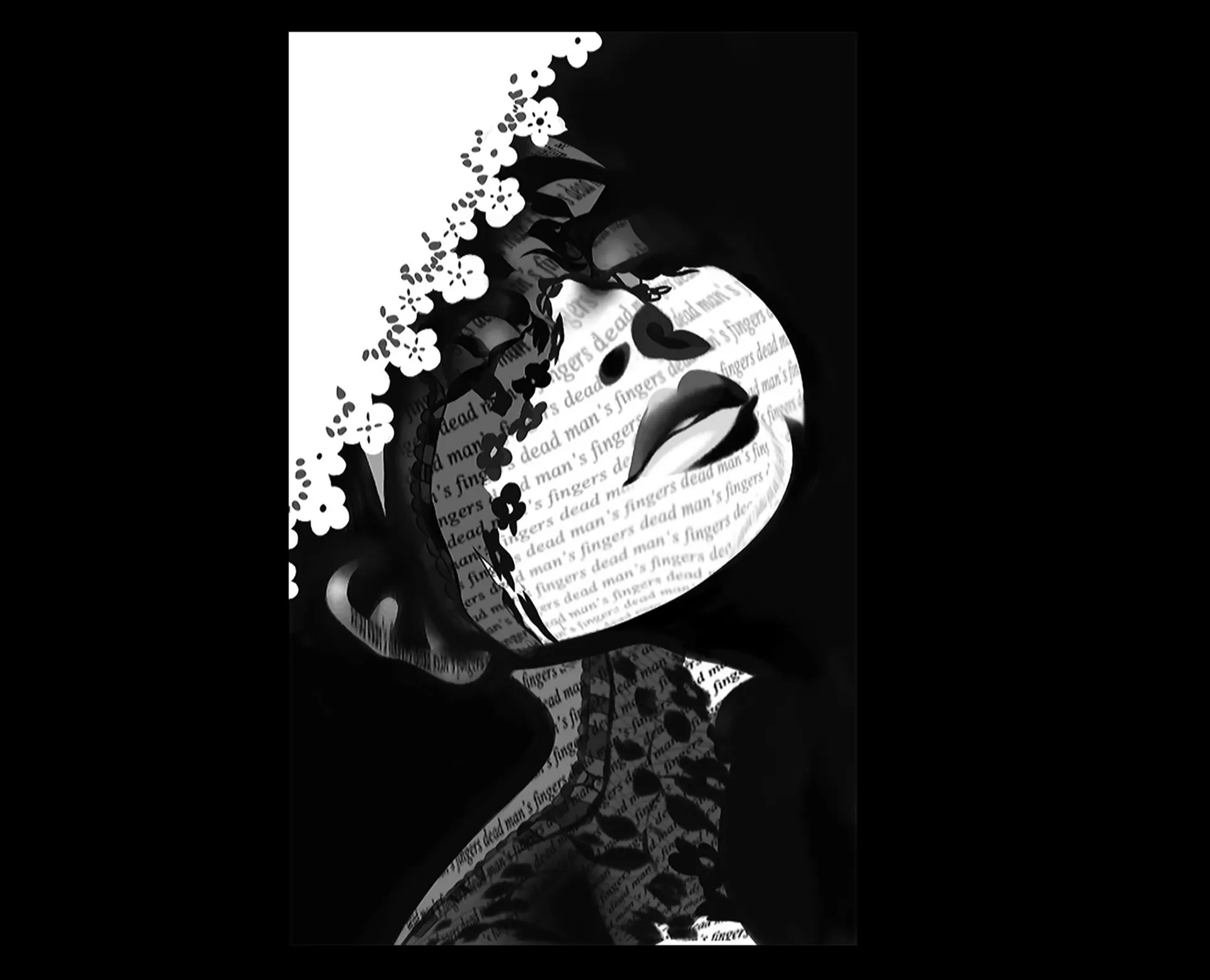 I mostly enjoy working with faces and bodies and combining these visuals with reflective words. A technique I tried early on was screenshotting pages of written text, playing with the perspective of the words, and cutting them into pieces to form a face. Later, I began digitally drawing visuals and placing the text in layers directly underneath to give the overall piece a more 3D effect. However, some of the best pieces I have produced take the form of a landscape. This is also to do with the perspective of words; however, I spent a lot of time cutting out individual letters, duplicating and playing with opacity. Additionally, I have also produced bits of photo poetry that use photography to portray a poem or general aesthetic.
