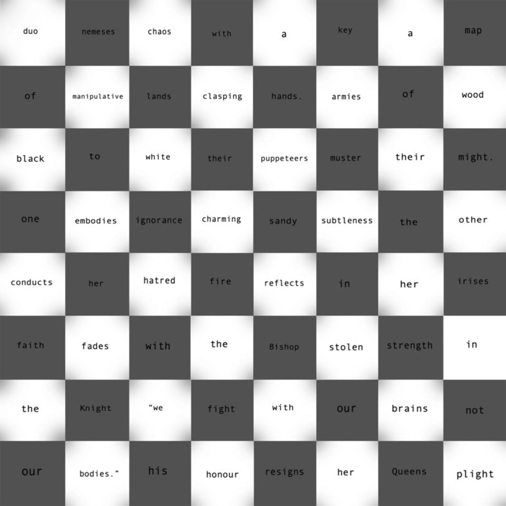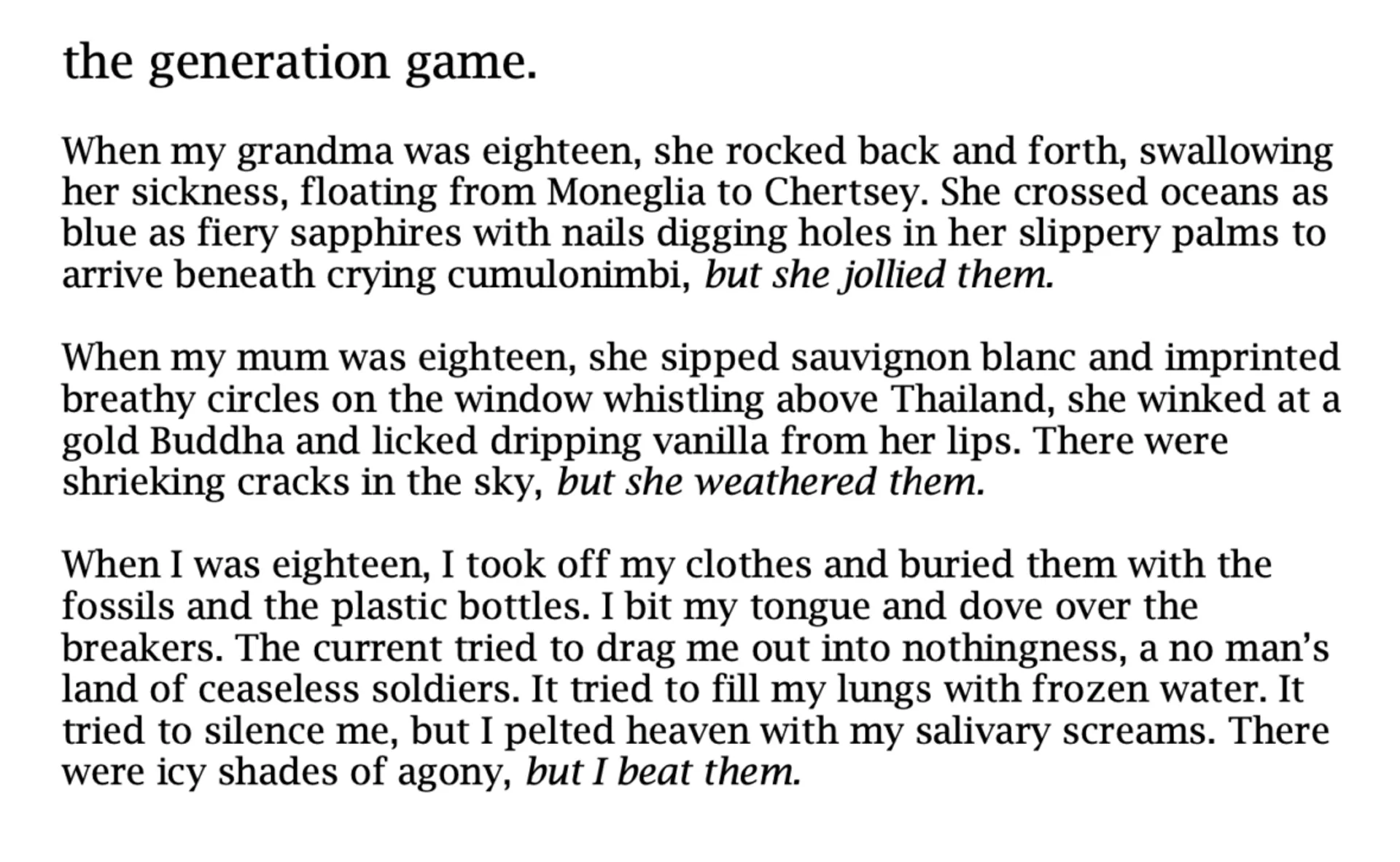 The focus of this portfolio is poetry. For my degree, I spent time studying different forms of artistic expression and, more specifically, how language can be used alongside them. For me, as a very visual thinker, my work quickly became an exploration into various ways to display language beyond any traditional form, i.e., stanzas and verses. I am interested in visual images, whether drawn or photographed and giving them a poetic aesthetic. This being because I find some images more emotive than sequential words. A lot of my work is digital. I specifically like to experiment with Photoshop and mobile drawing apps like Ibis Paint X, that allow me to create templates and sketch out images.