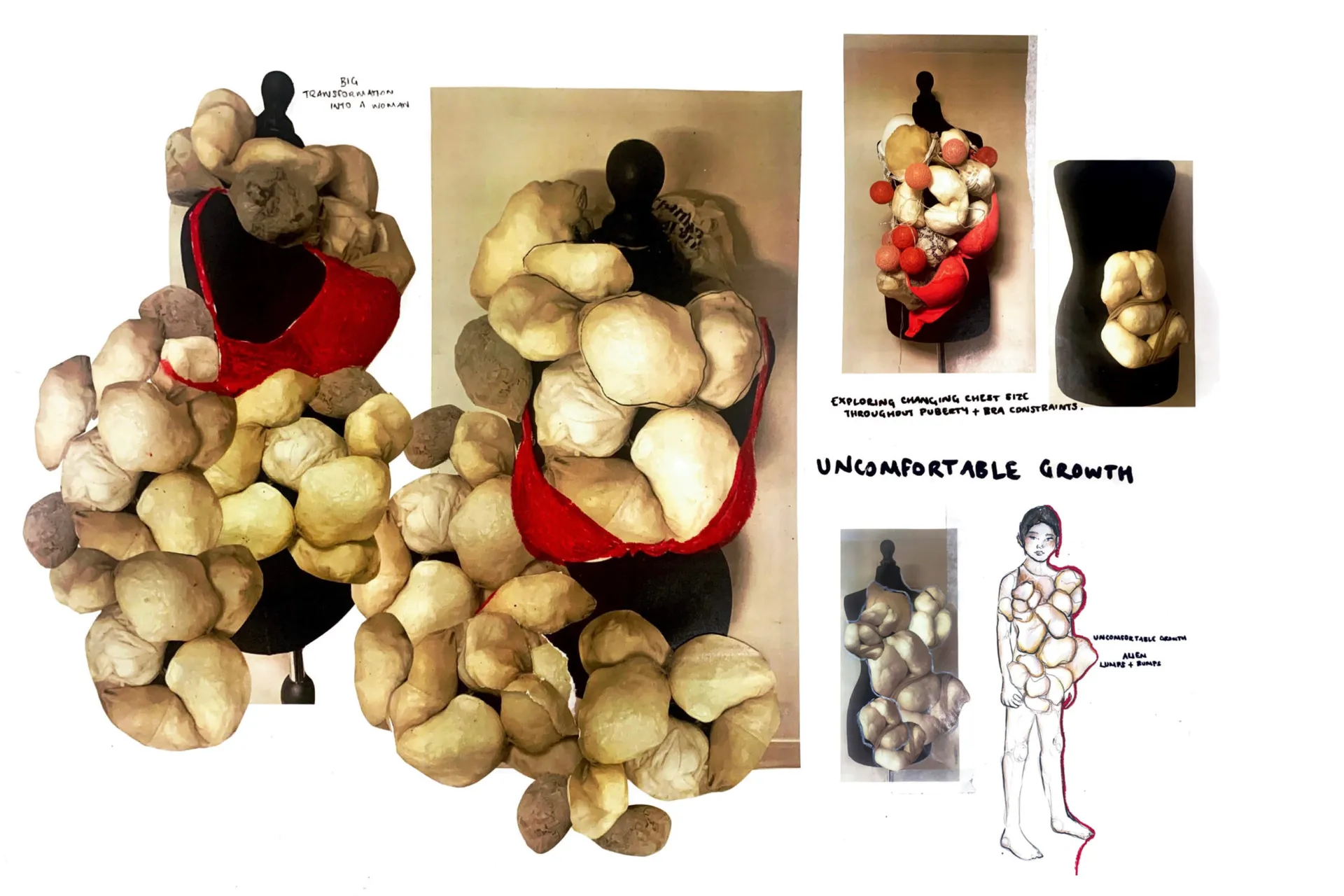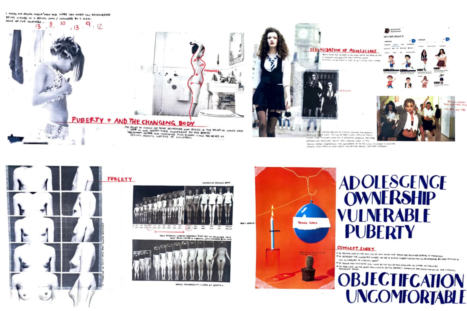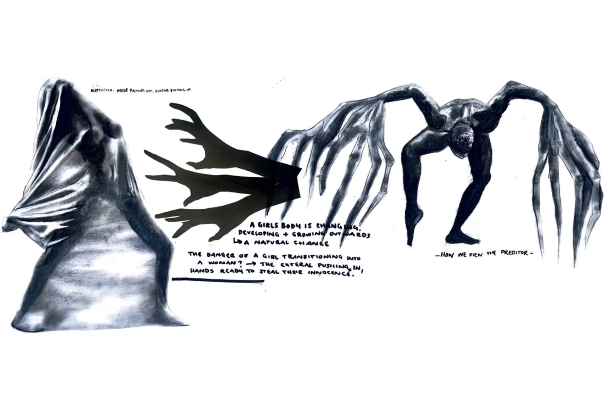 The uncomfortable change of puberty. Our metamorphosis, public, for all to see. No longer recognising our bodies as our own, a notion of new ownership by men is thrust upon us. Once free to play unselfconsciously, now ‘fresh meat.’ We learn to accept that our new form renders us unsafe as we will now continue to be sexualised by men.