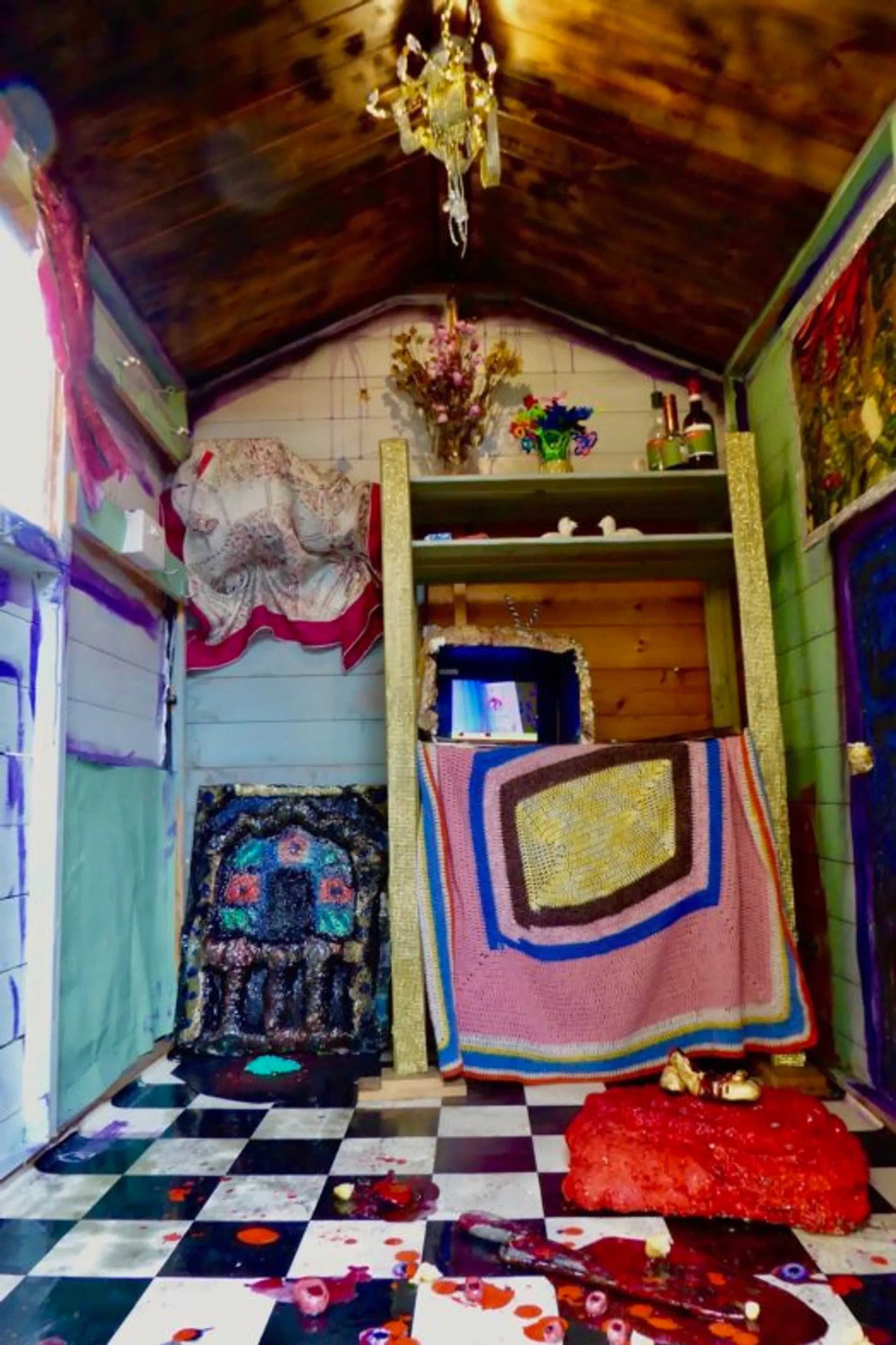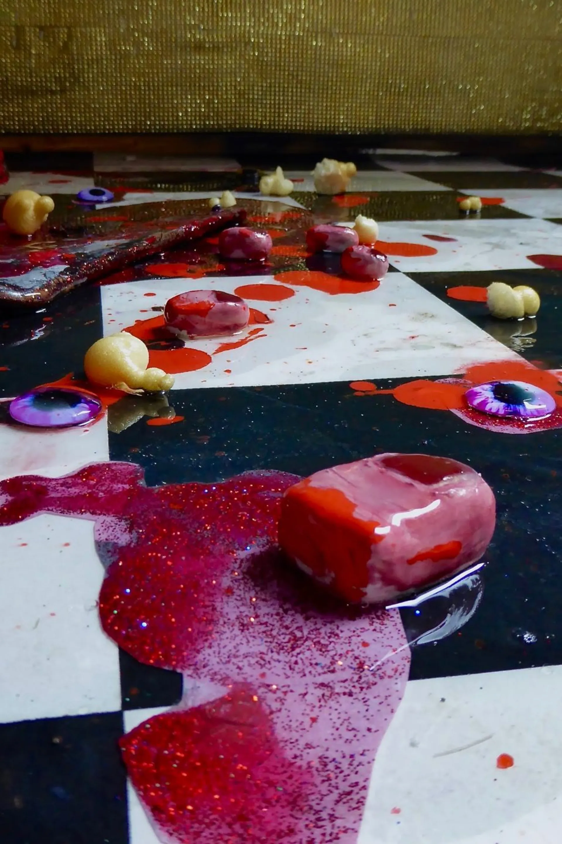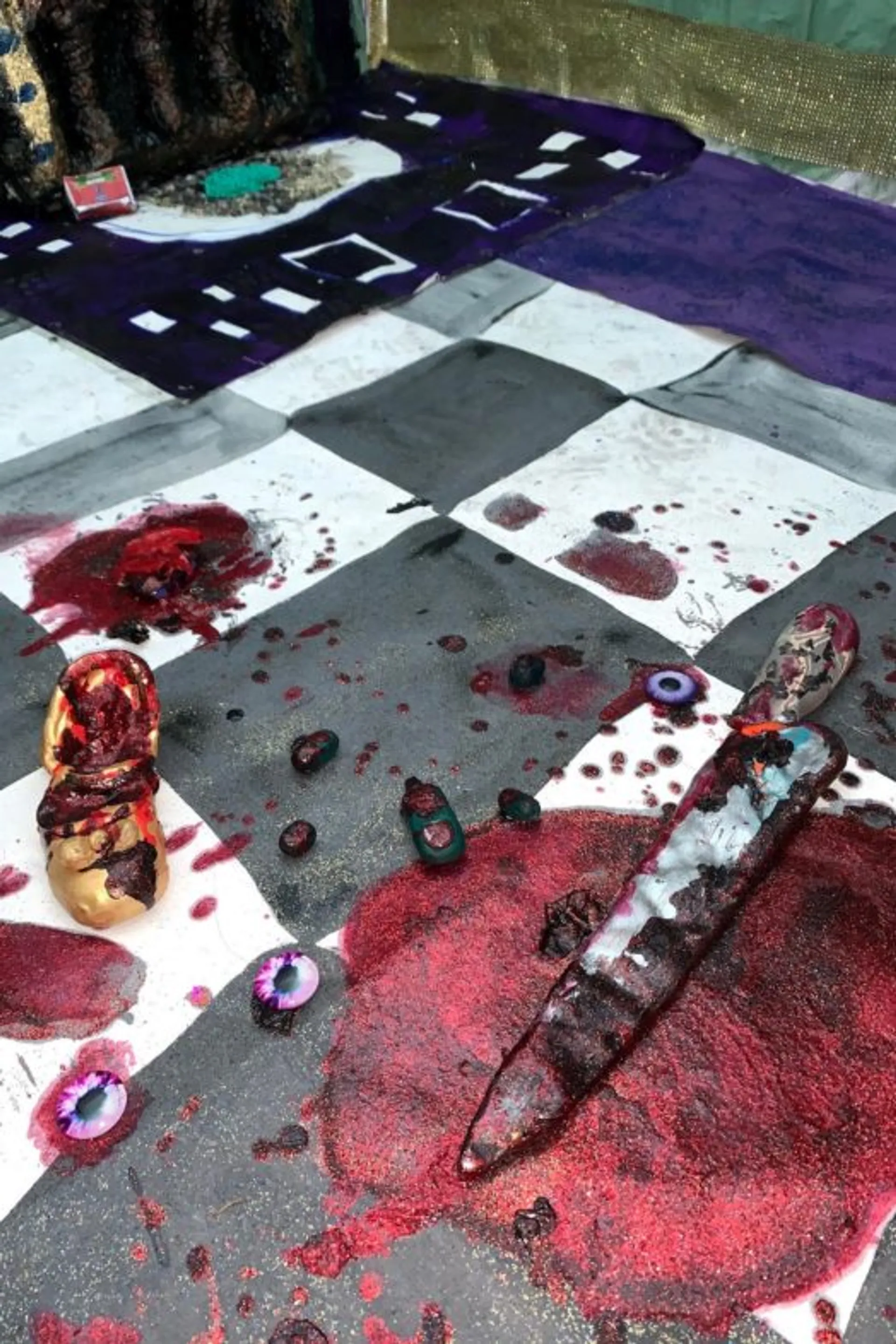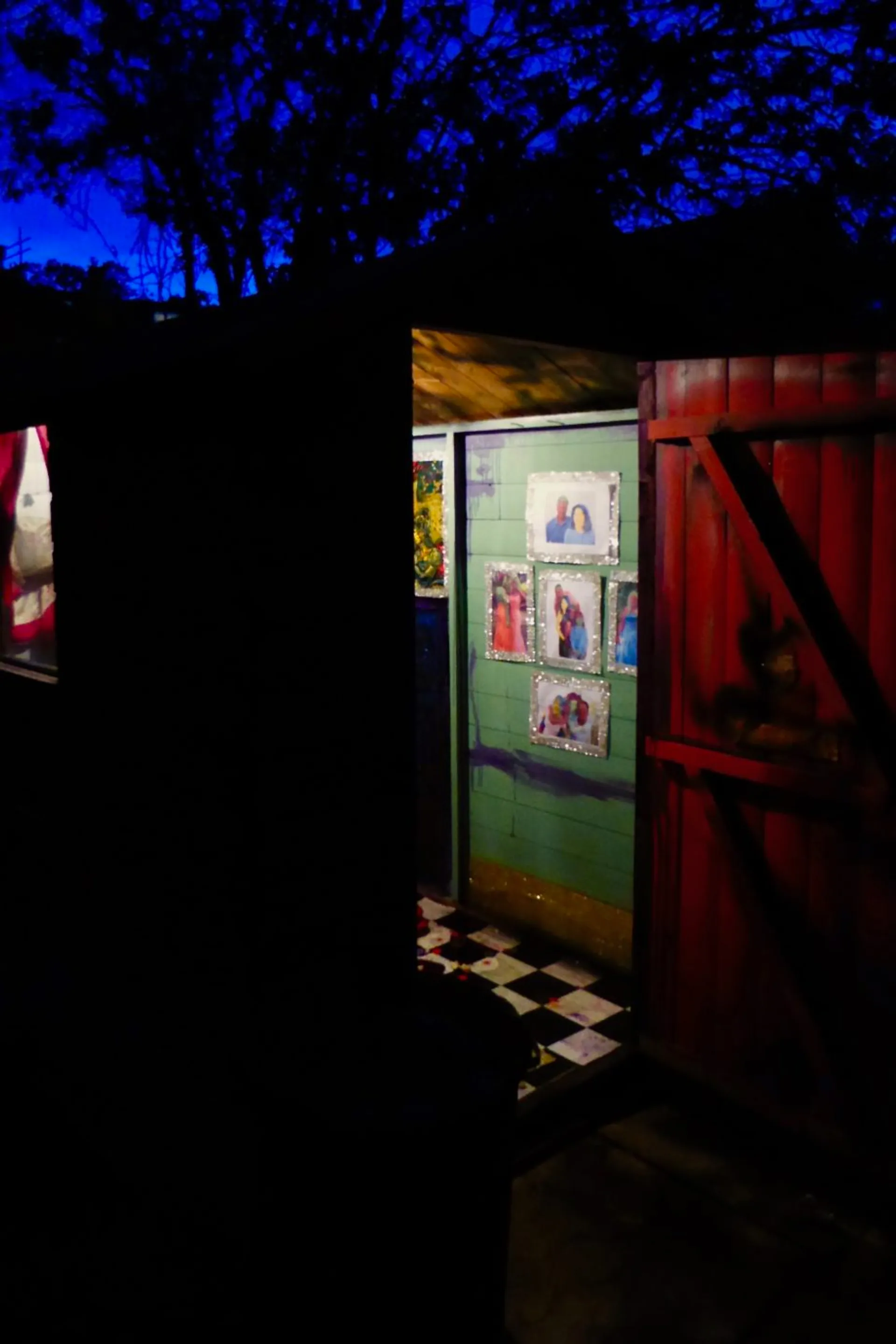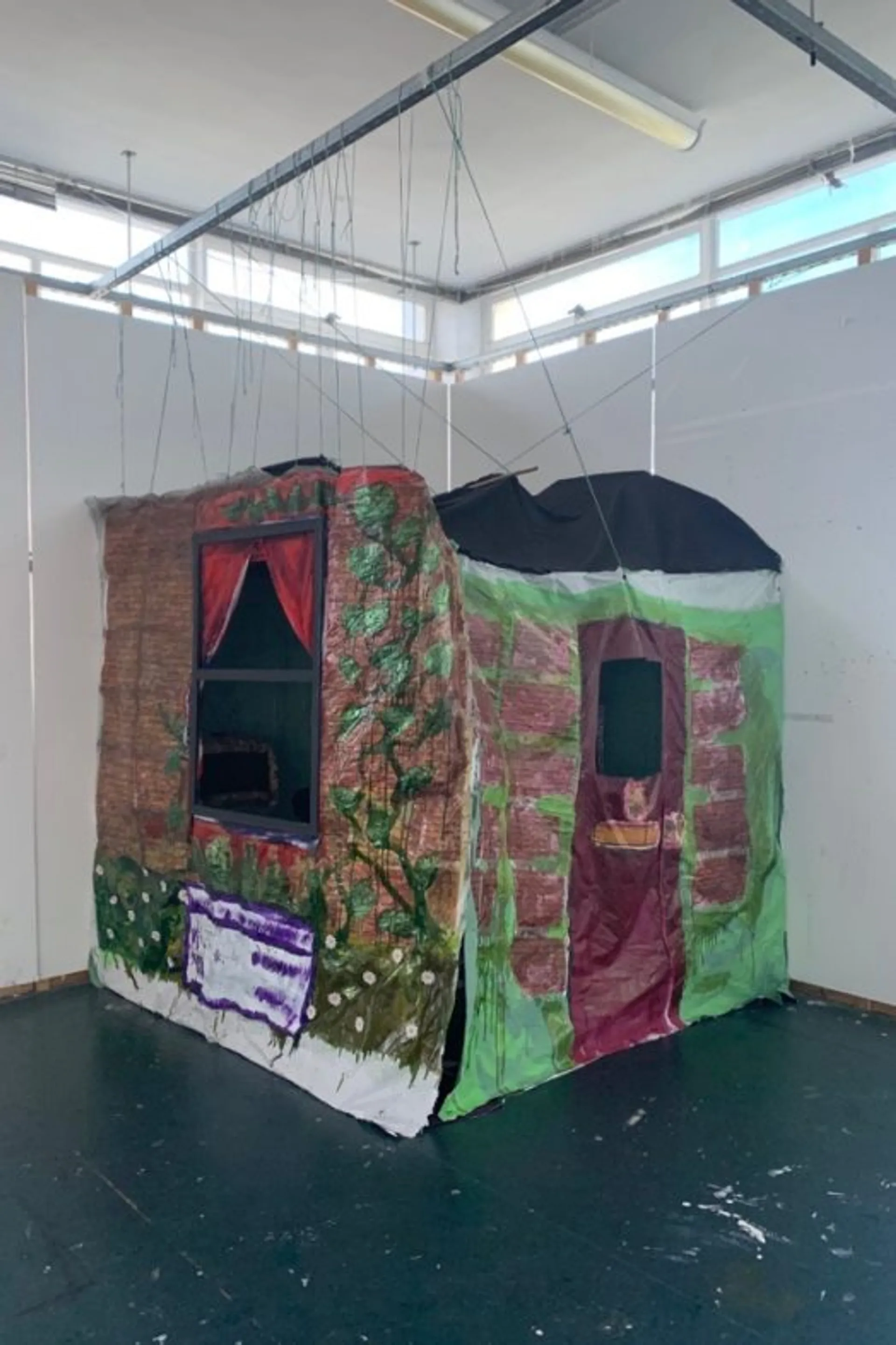 My project explores ‘fake’ environments, looking in particular at amusement parks and theatrical sets. This resulted in a site-specific installation that visually portrays a narrative based on the German Fairy-tale Aschenputtel. The piece combines props, illusion painting and sound and video work.