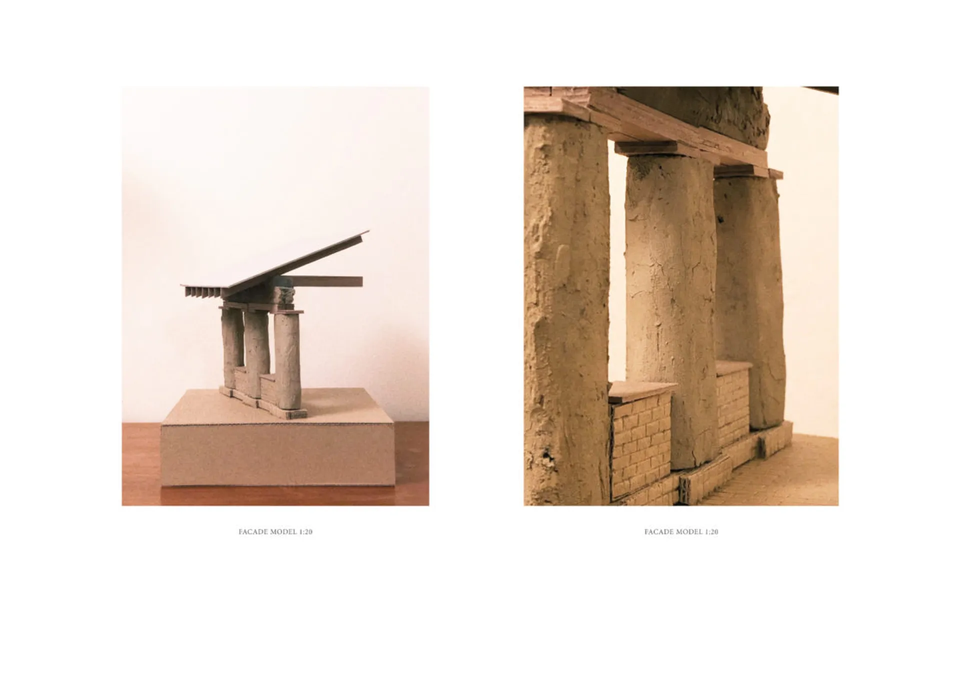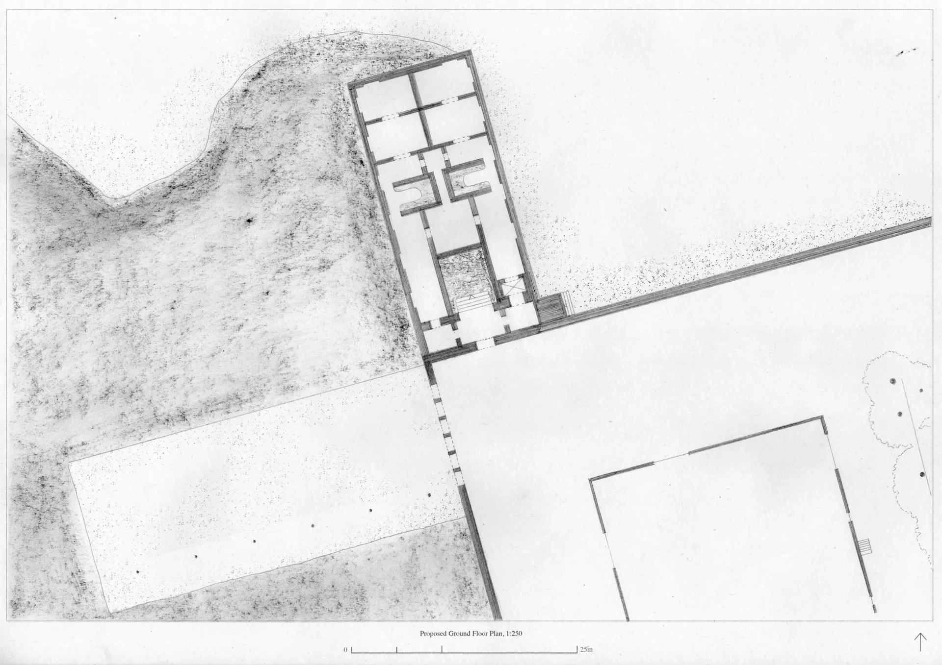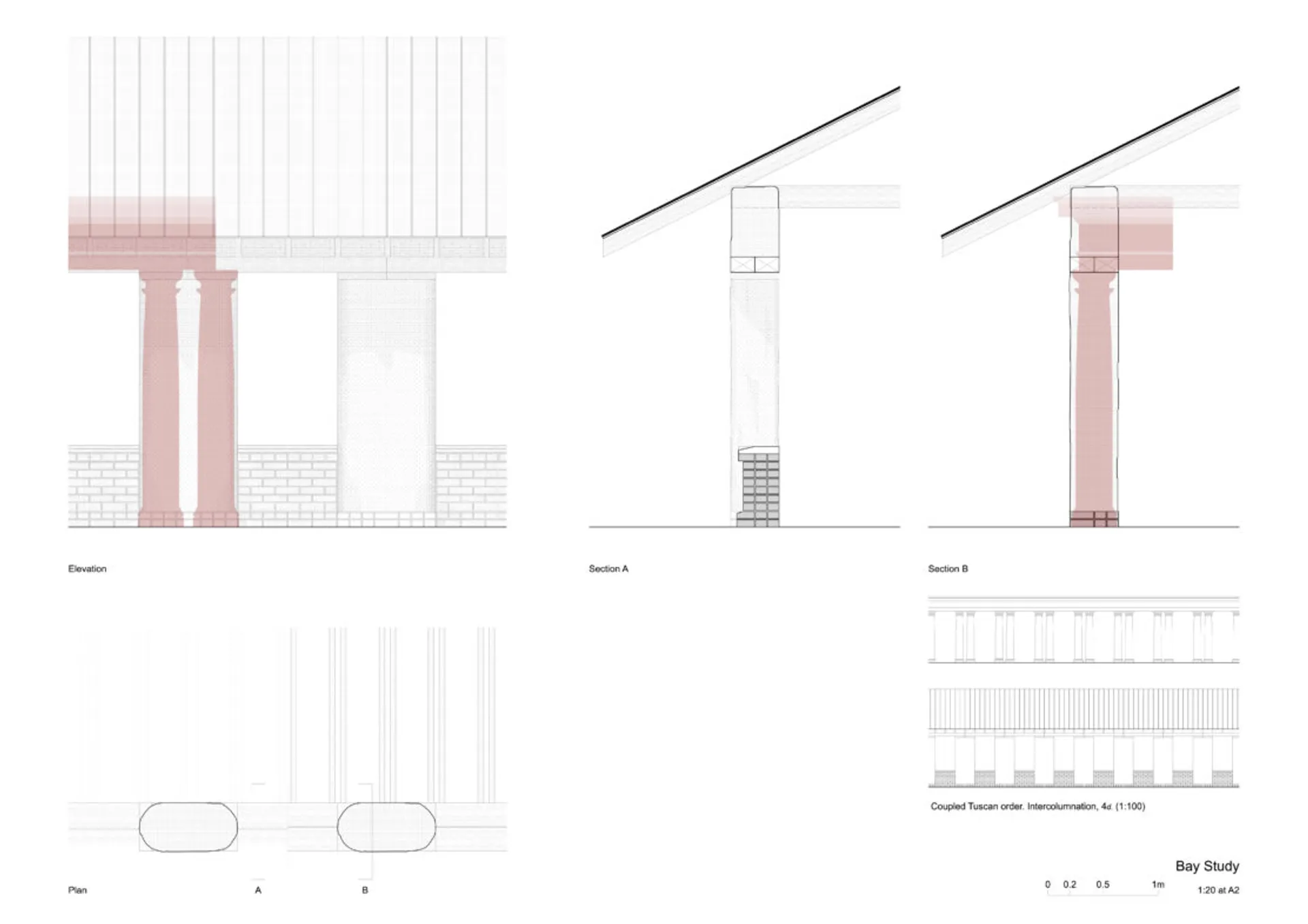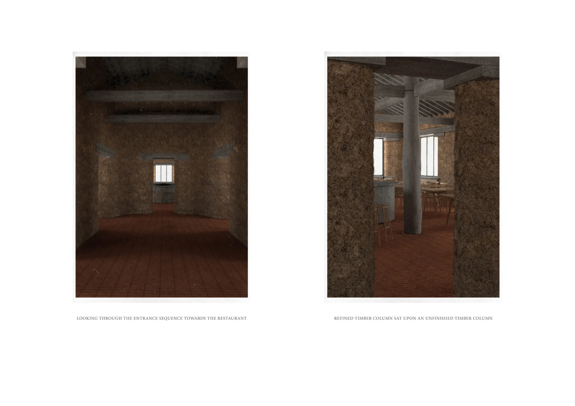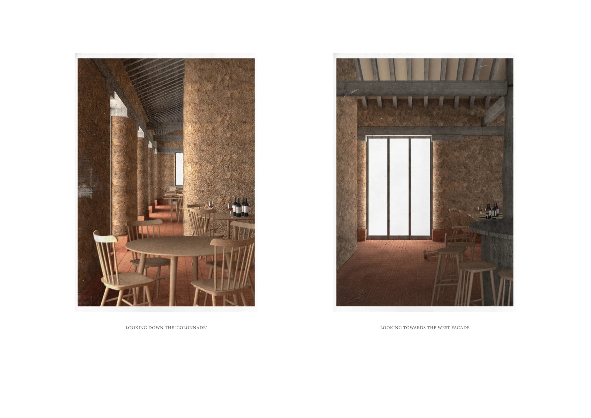 Whilst studying the orders and their details, similarities were noted in seemingly functional tectonic moves in cob structures. With the measured forms and calculated rhythm of the orders, in conjunction with cobs inherent plasticity and tectonic motifs, rooted in tradition, time and place, the project takes playful and sculptural moves, sitting within the sparse Hampshire landscape, creating spaces to drink wine.