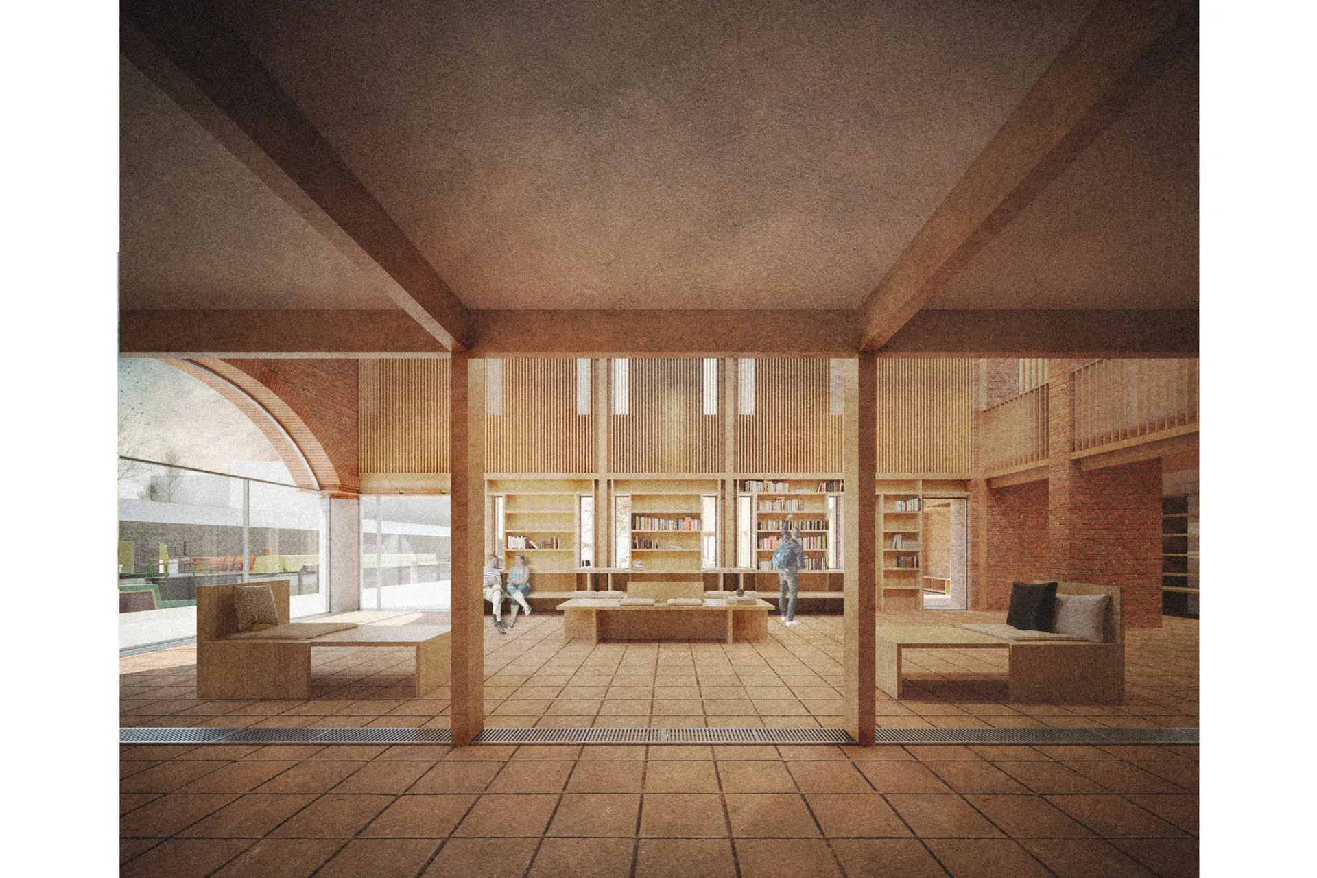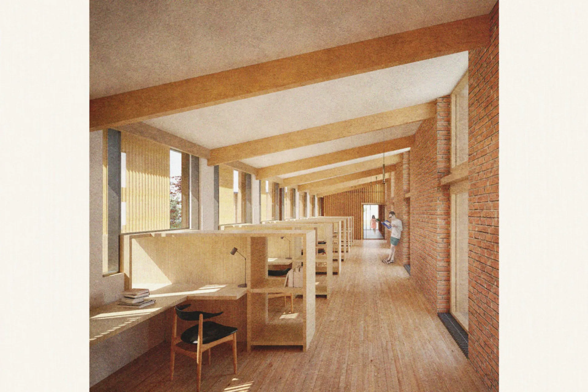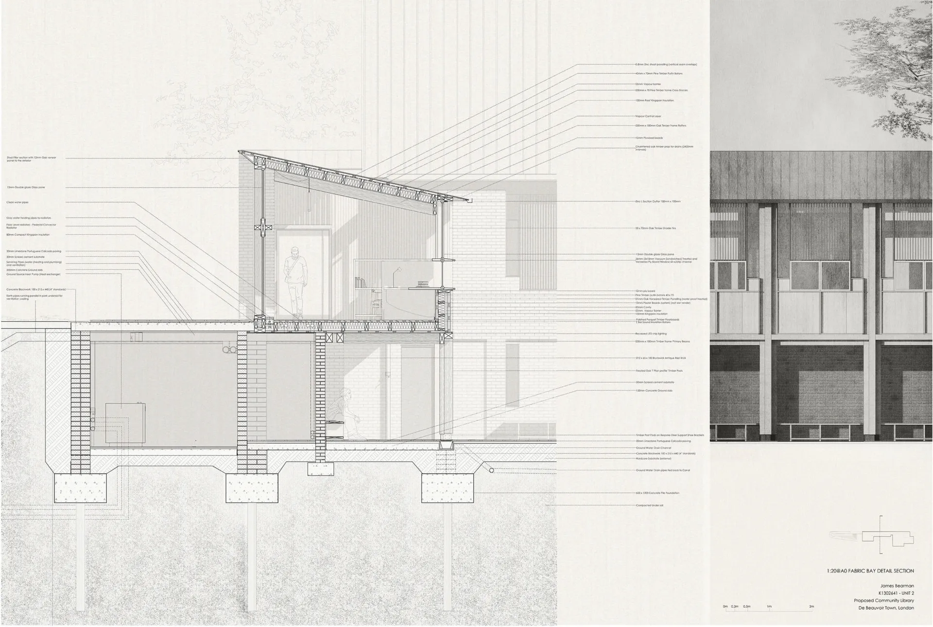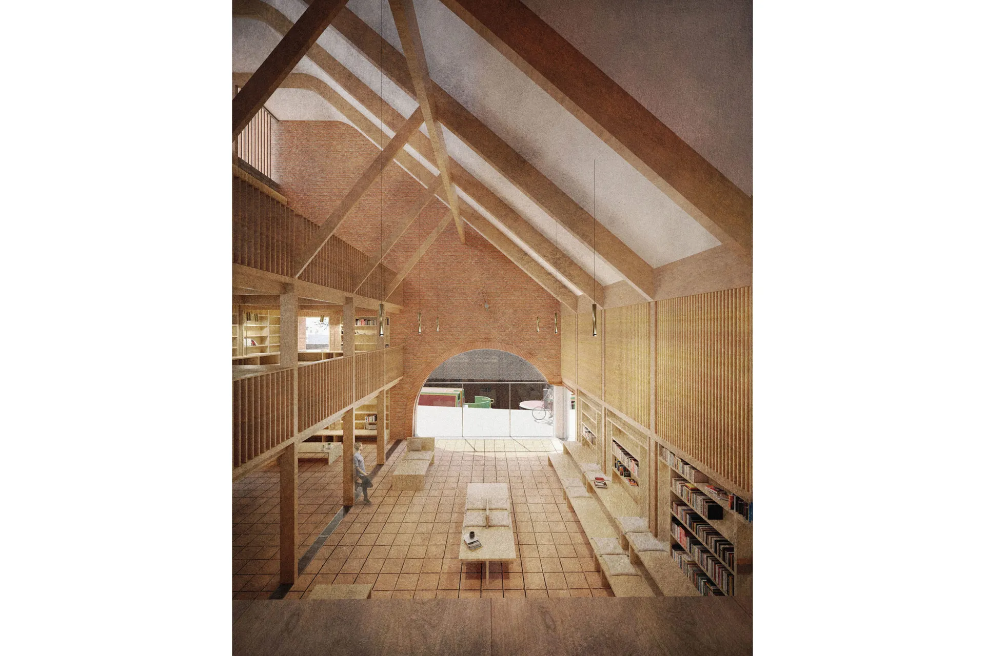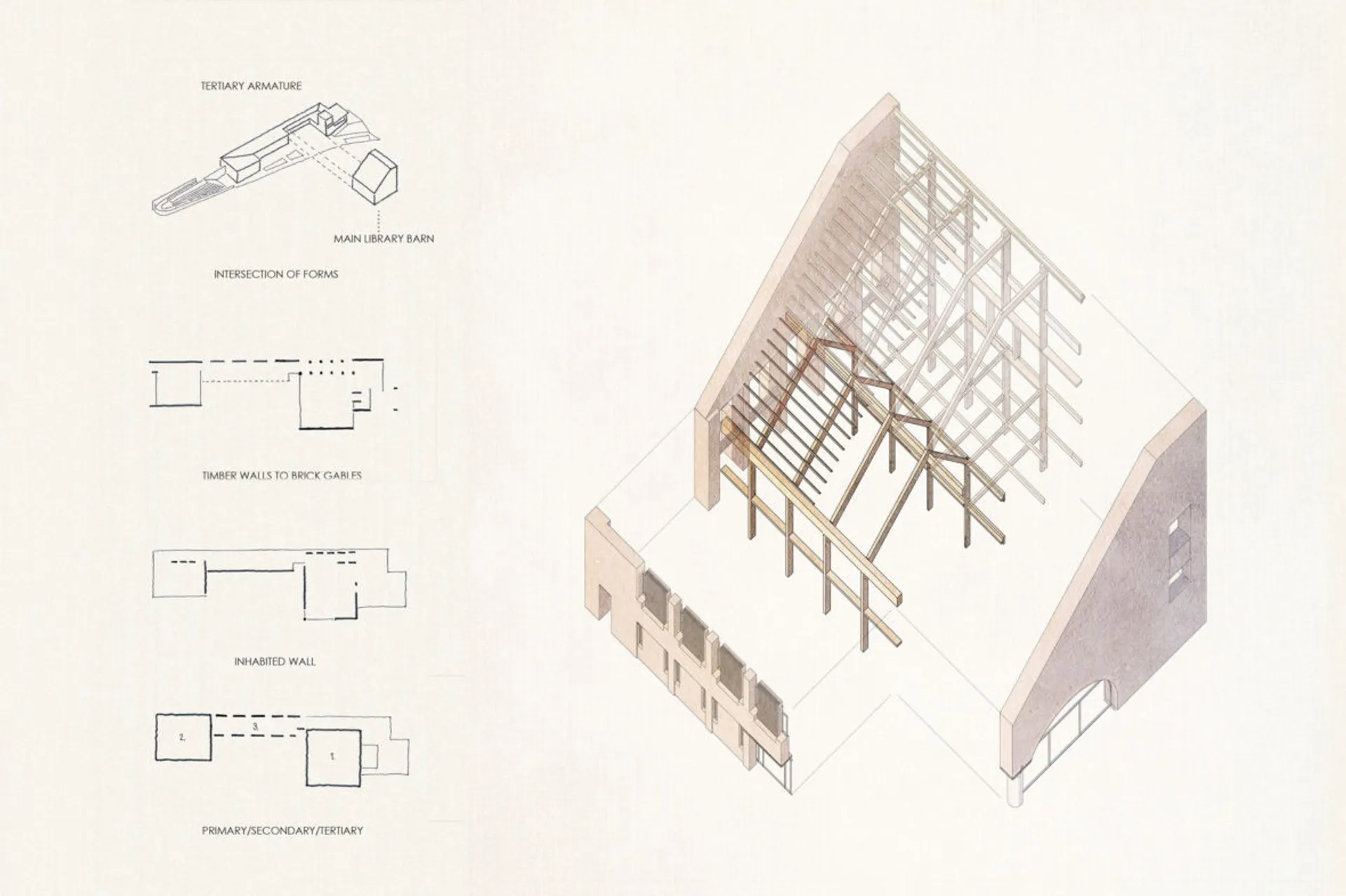 This 5th year thesis project explores the premise above in the design of a Community Library on the Hackney, De Beauvoir Estate on Regents Canal, London. Furthermore, the project explores what a contemporary library can be outside of modern technology: a social hub, a workplace, a place to celebrate knowledge and a place to strengthen communities – ‘A People’s Palace’, Christoph Grafe, 2014. The project is founded upon the concept of main library form/space wrapped by an ‘armature’ of subsidiary library functions. The project uses the study and design of a farm building (a stables) in the first term as the project’s tectonic foundation, to explore the architectural, and environmental relevance of rudimentary construction to the complexities of urban construction. As a result, the project uses a barn form at its centre. This ‘barn’ is held up by a ridge beam between two thick masonry walls of vernacular brickwork, from which the rest of the scheme spreads and articulates. The project catches indirect light in the main library with a clerestory window above upper and lower galleries of bookshelves that reference the hay lofts of a barn. The project seeks to integrate the demographics of the commuters along the canal towpath with that of the De Beauvoir Estate Park, to function as both a local and estate library. This is done with the help of a public footpath that bends back on itself to the east to the towpath level, in the form of a ramp, holding a public amphitheater of seating, opposite a café. Inside, the project makes use of a thick inhabited wall to house the books and workspace bays to create undivided internal spaces for public events. The building’s façade and form make reference to the historic fronting of industrial warehouses to the canal. In doing so, it creates further public realm between gable facades, in the form of a courtyard lined by timber facades.