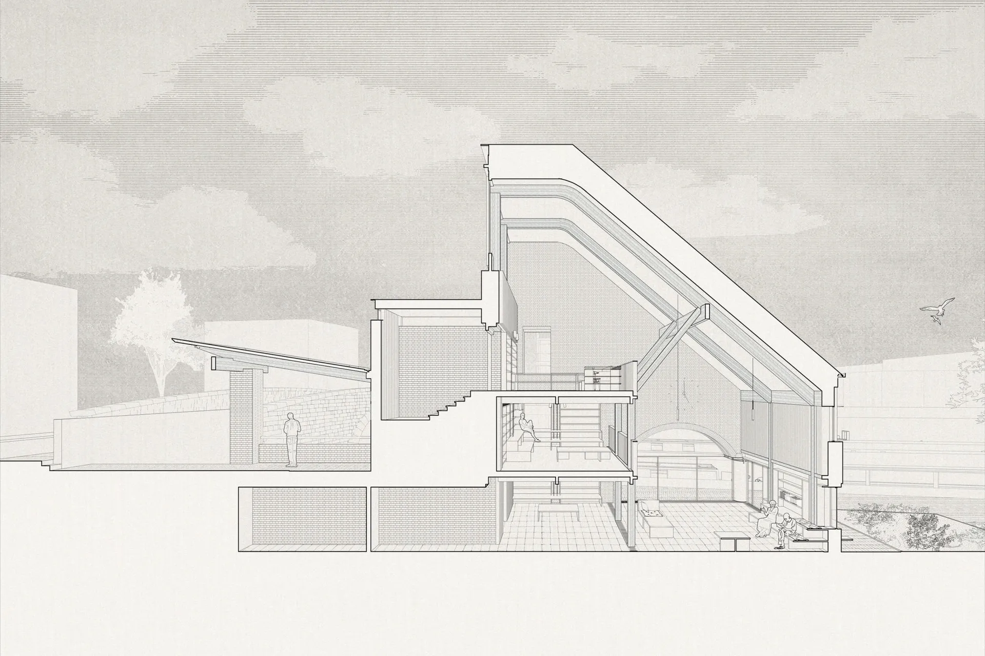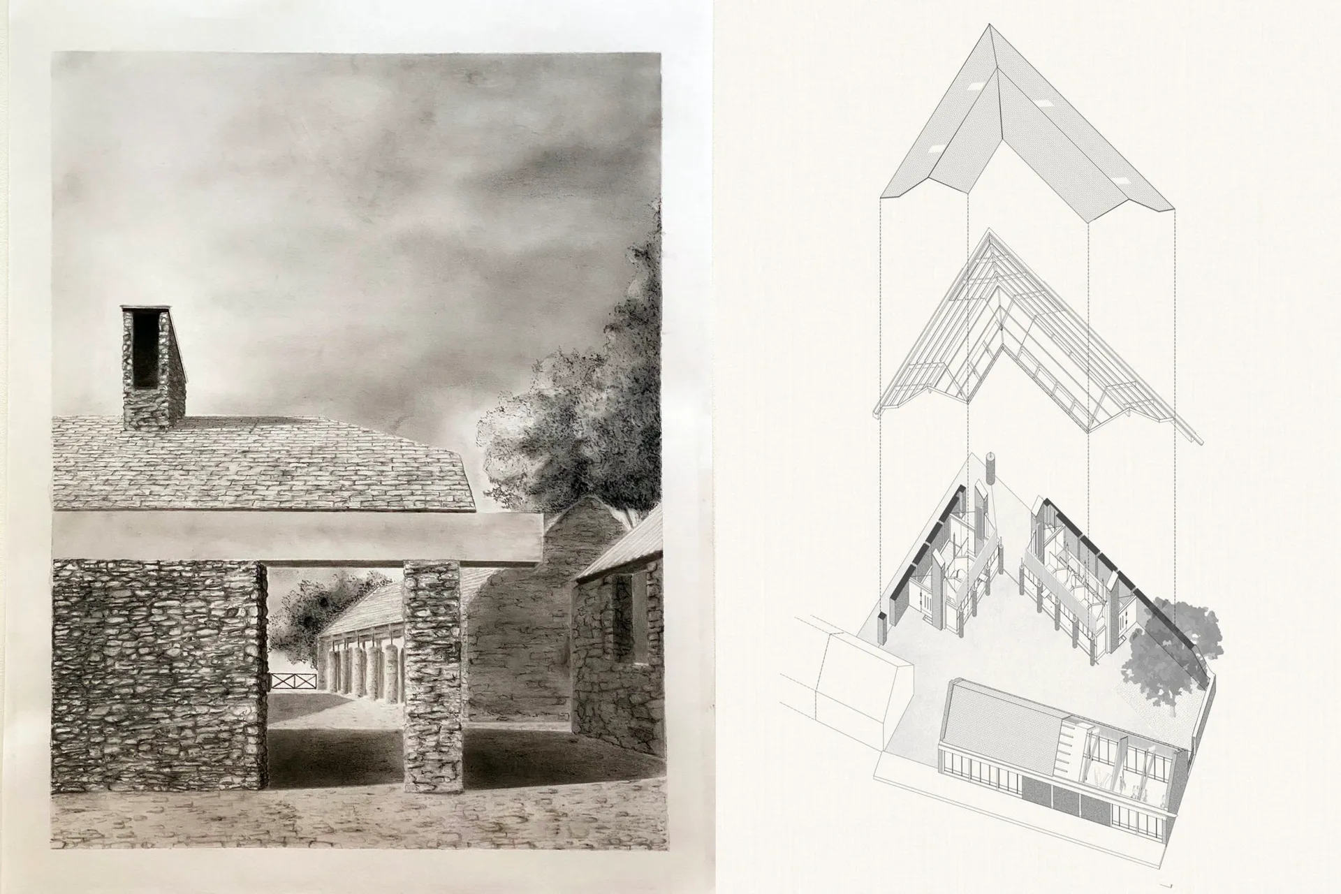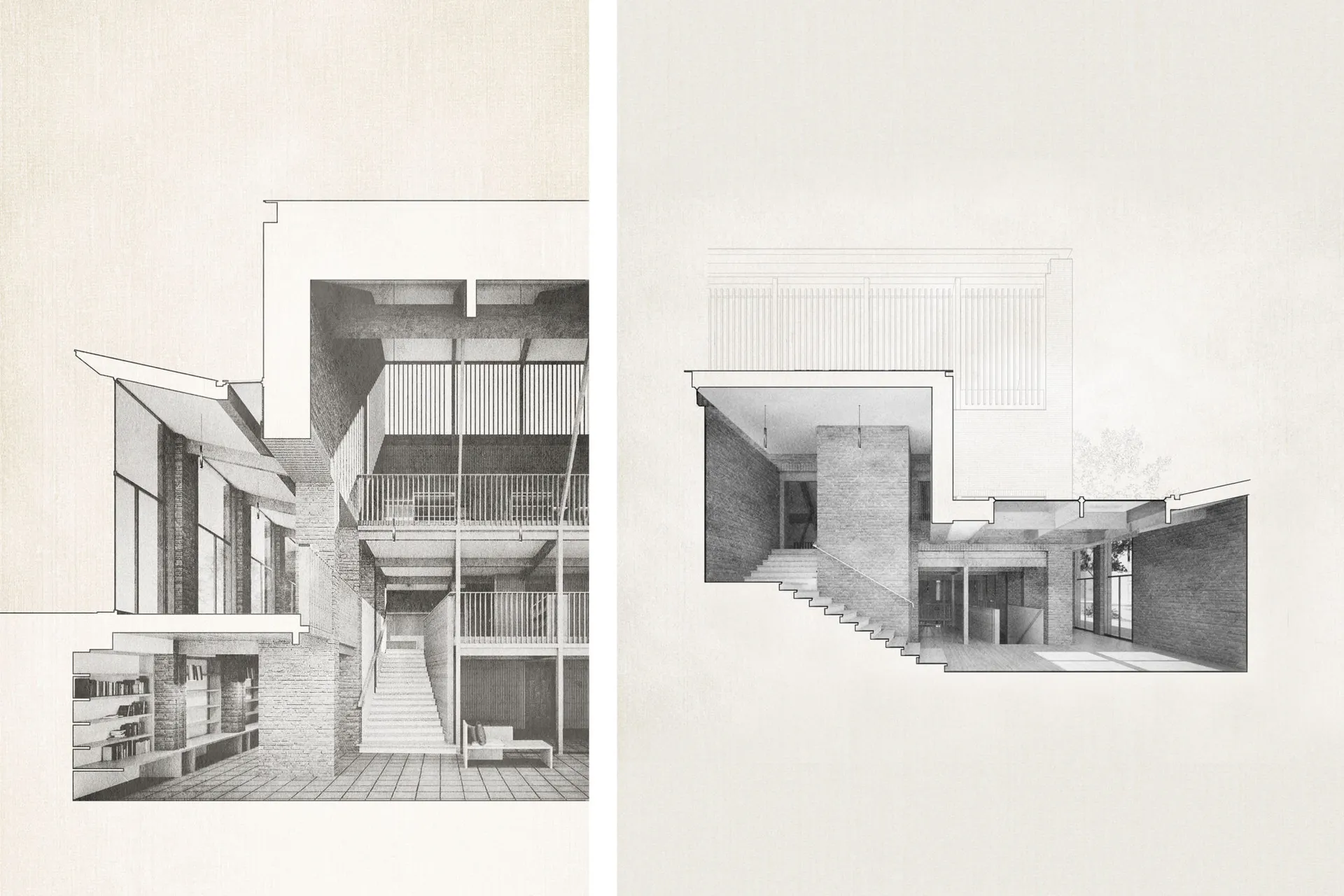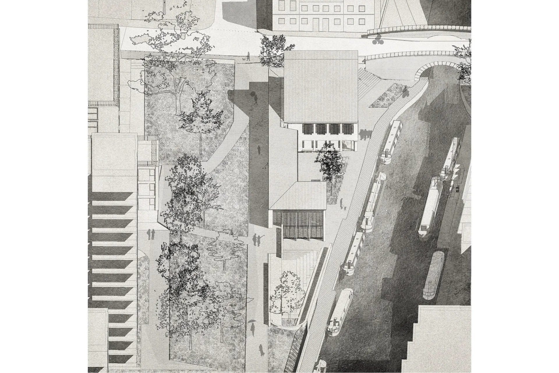 This 5th year thesis project explores the premise above in the design of a Community Library on the Hackney, De Beauvoir Estate on Regents Canal, London. Furthermore, the project explores what a contemporary library can be outside of modern technology: a social hub, a workplace, a place to celebrate knowledge and a place to strengthen communities – ‘A People’s Palace’, Christoph Grafe, 2014. The project is founded upon the concept of main library form/space wrapped by an ‘armature’ of subsidiary library functions. The project uses the study and design of a farm building (a stables) in the first term as the project’s tectonic foundation, to explore the architectural, and environmental relevance of rudimentary construction to the complexities of urban construction. As a result, the project uses a barn form at its centre. This ‘barn’ is held up by a ridge beam between two thick masonry walls of vernacular brickwork, from which the rest of the scheme spreads and articulates. The project catches indirect light in the main library with a clerestory window above upper and lower galleries of bookshelves that reference the hay lofts of a barn. The project seeks to integrate the demographics of the commuters along the canal towpath with that of the De Beauvoir Estate Park, to function as both a local and estate library. This is done with the help of a public footpath that bends back on itself to the east to the towpath level, in the form of a ramp, holding a public amphitheater of seating, opposite a café. Inside, the project makes use of a thick inhabited wall to house the books and workspace bays to create undivided internal spaces for public events. The building’s façade and form make reference to the historic fronting of industrial warehouses to the canal. In doing so, it creates further public realm between gable facades, in the form of a courtyard lined by timber facades.