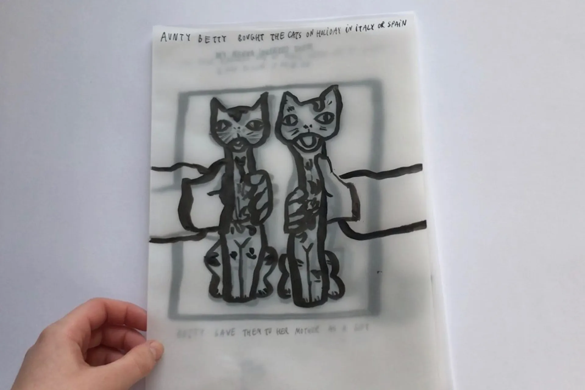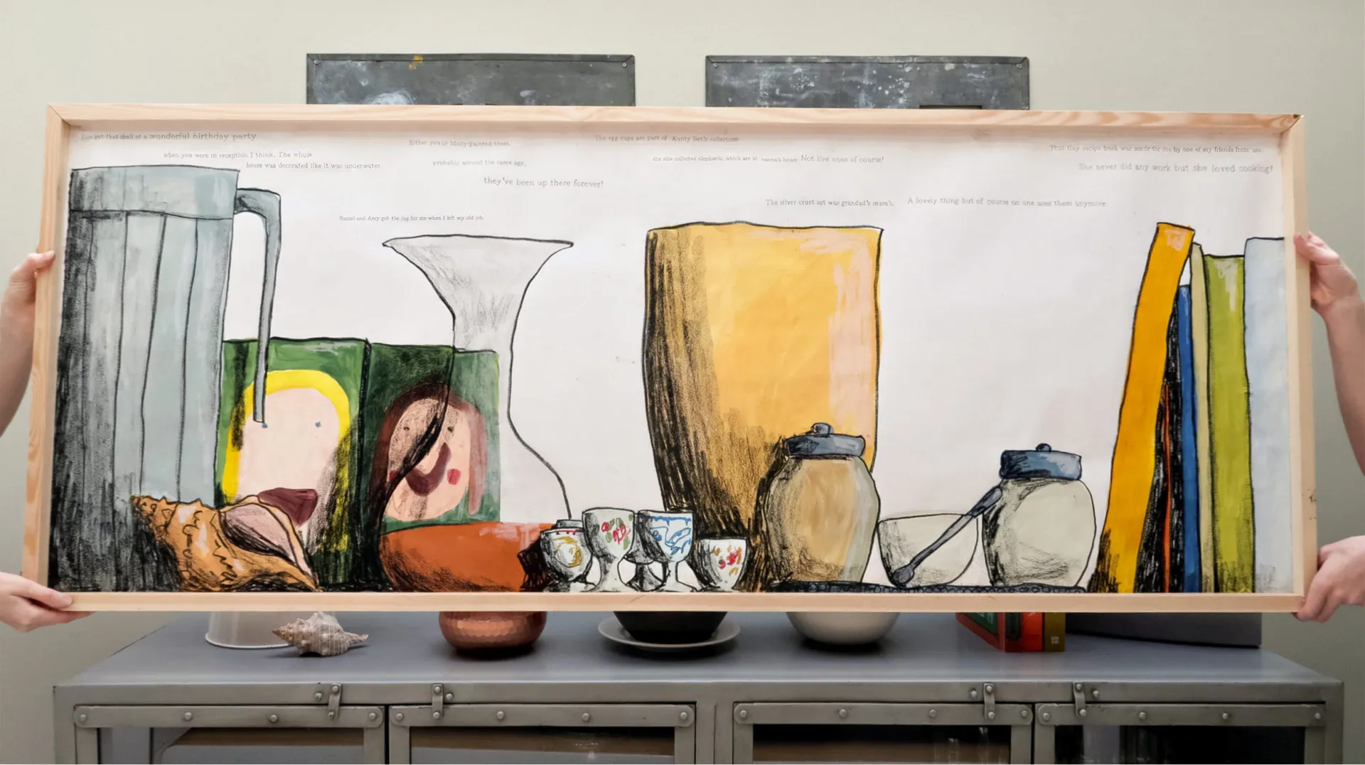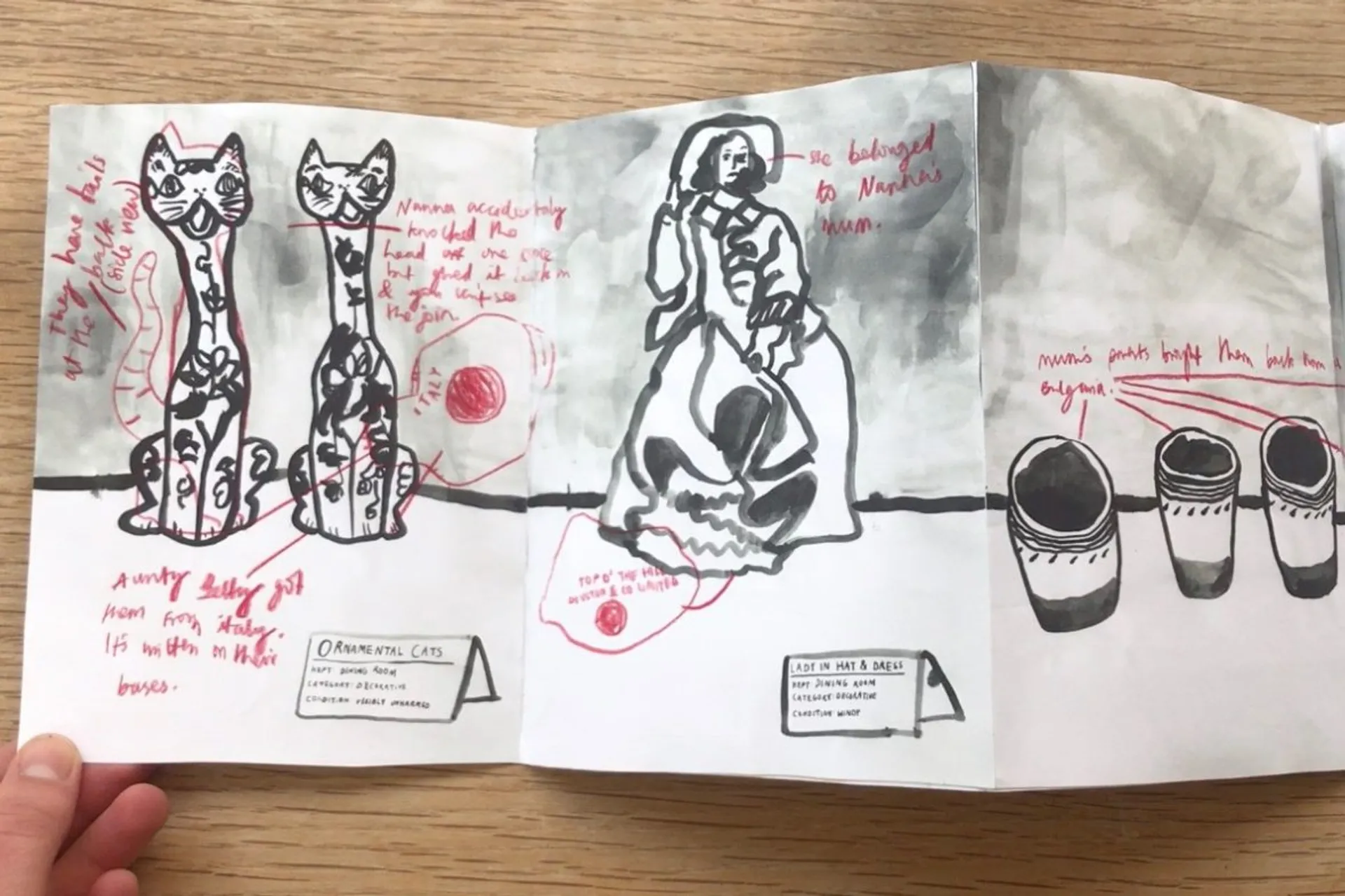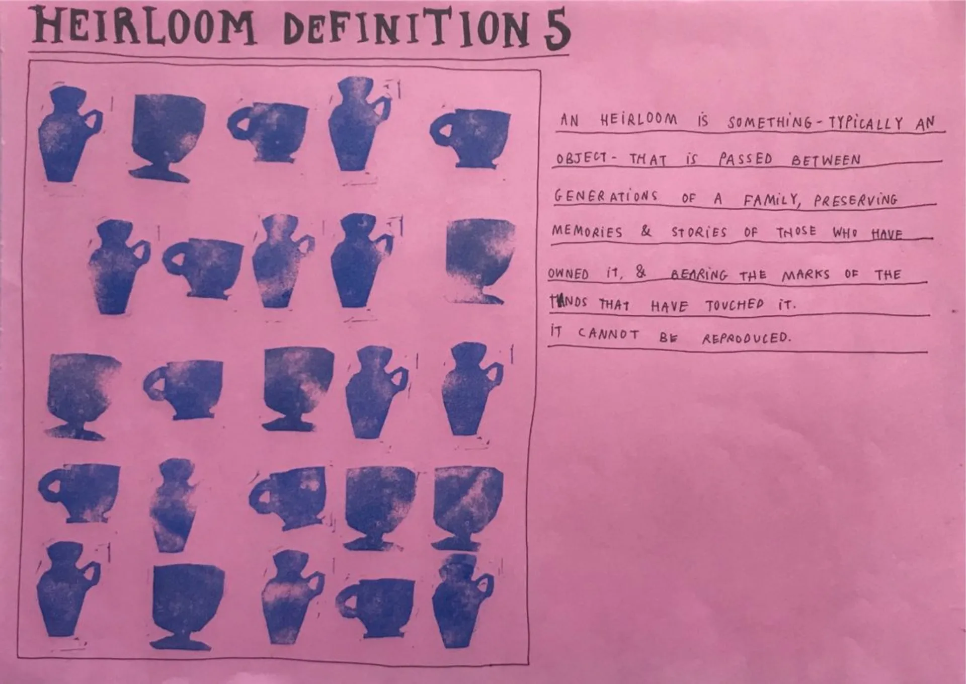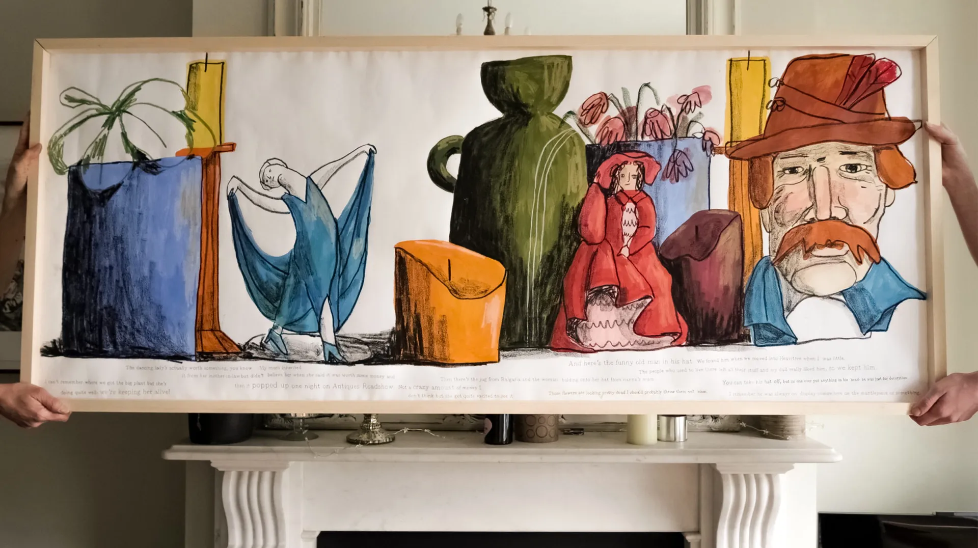 I wanted to explore how to get people invested in other peoples ’heirlooms by curating the objects in familiar settings to share their stories. It’s my mum’s voice in the drawings explaining the histories of the objects to me, passing the heirlooms between generations.