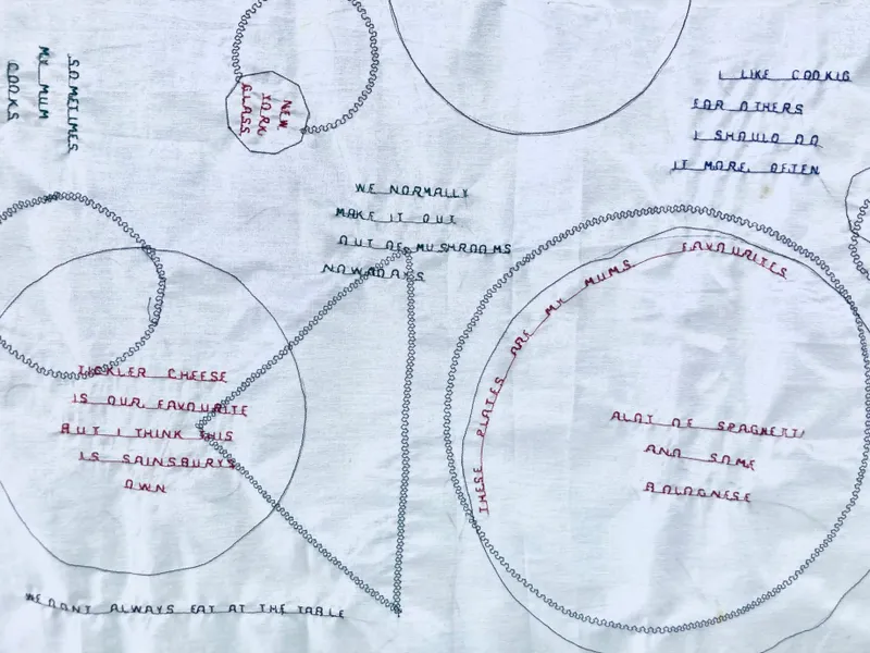 A recipe for spaghetti bolognese. Throughout the film an artefact is created which documents the way in which mealtimes act as a form of nostalgia and as a tool to chart histories. It aims to show how personal acts surrounding a meal become more important than eating the meal itself.