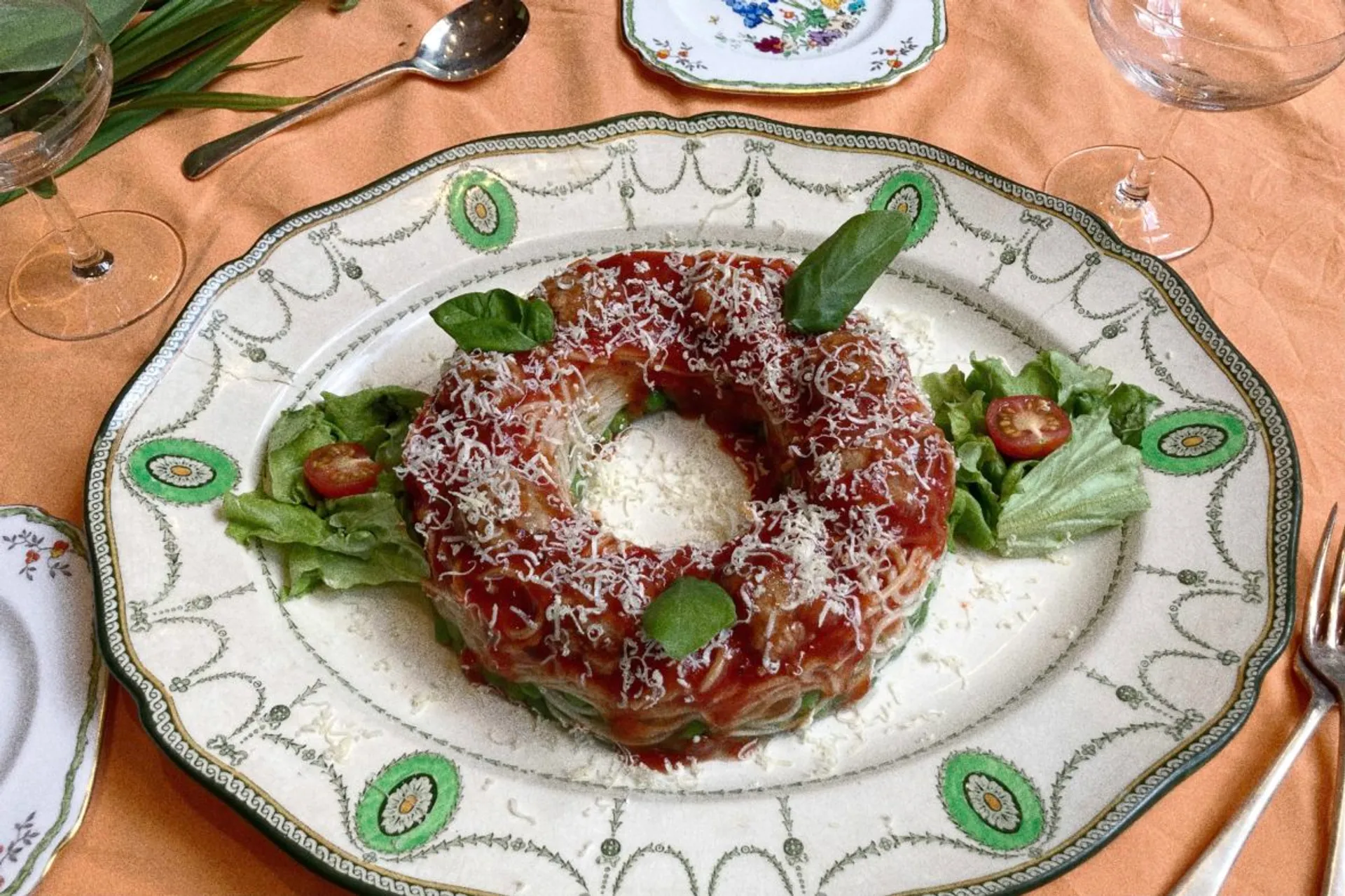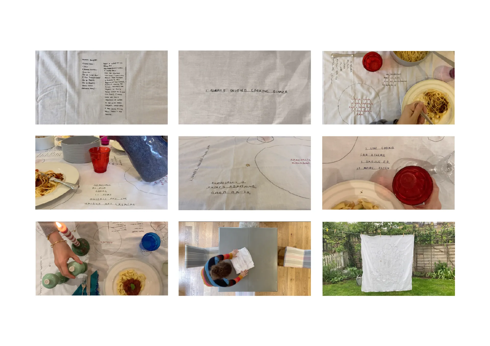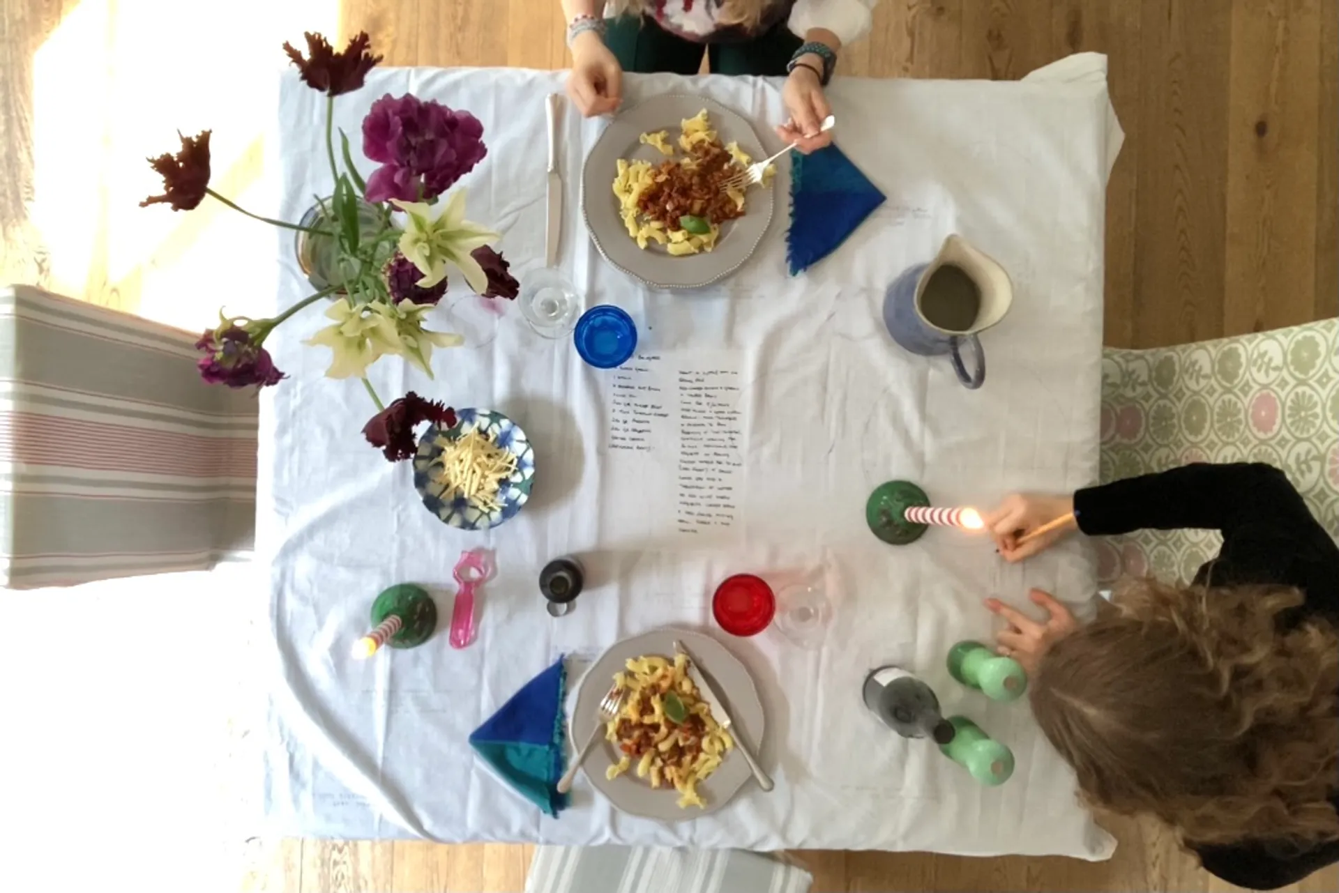 A recipe for spaghetti bolognese. Throughout the film an artefact is created which documents the way in which mealtimes act as a form of nostalgia and as a tool to chart histories. It aims to show how personal acts surrounding a meal become more important than eating the meal itself.